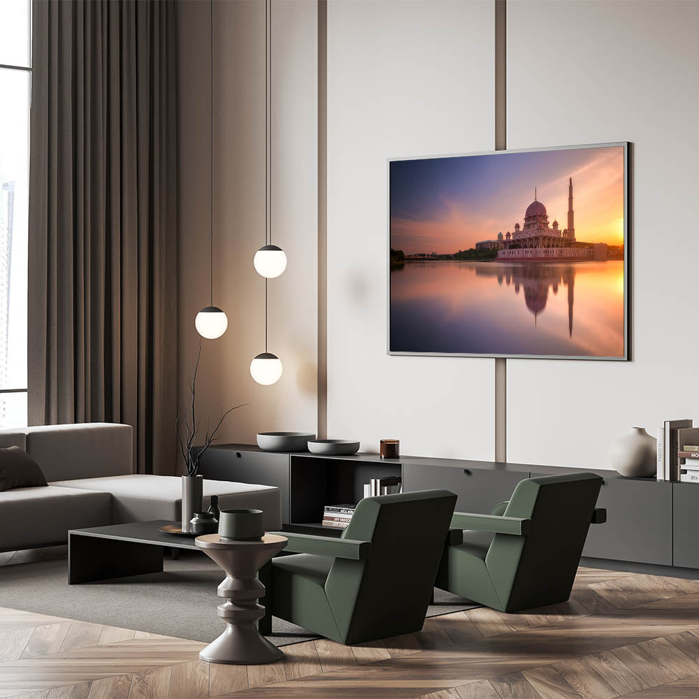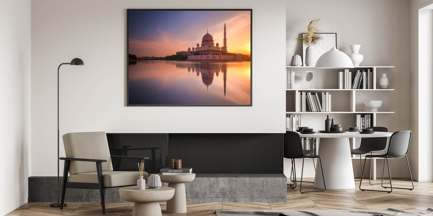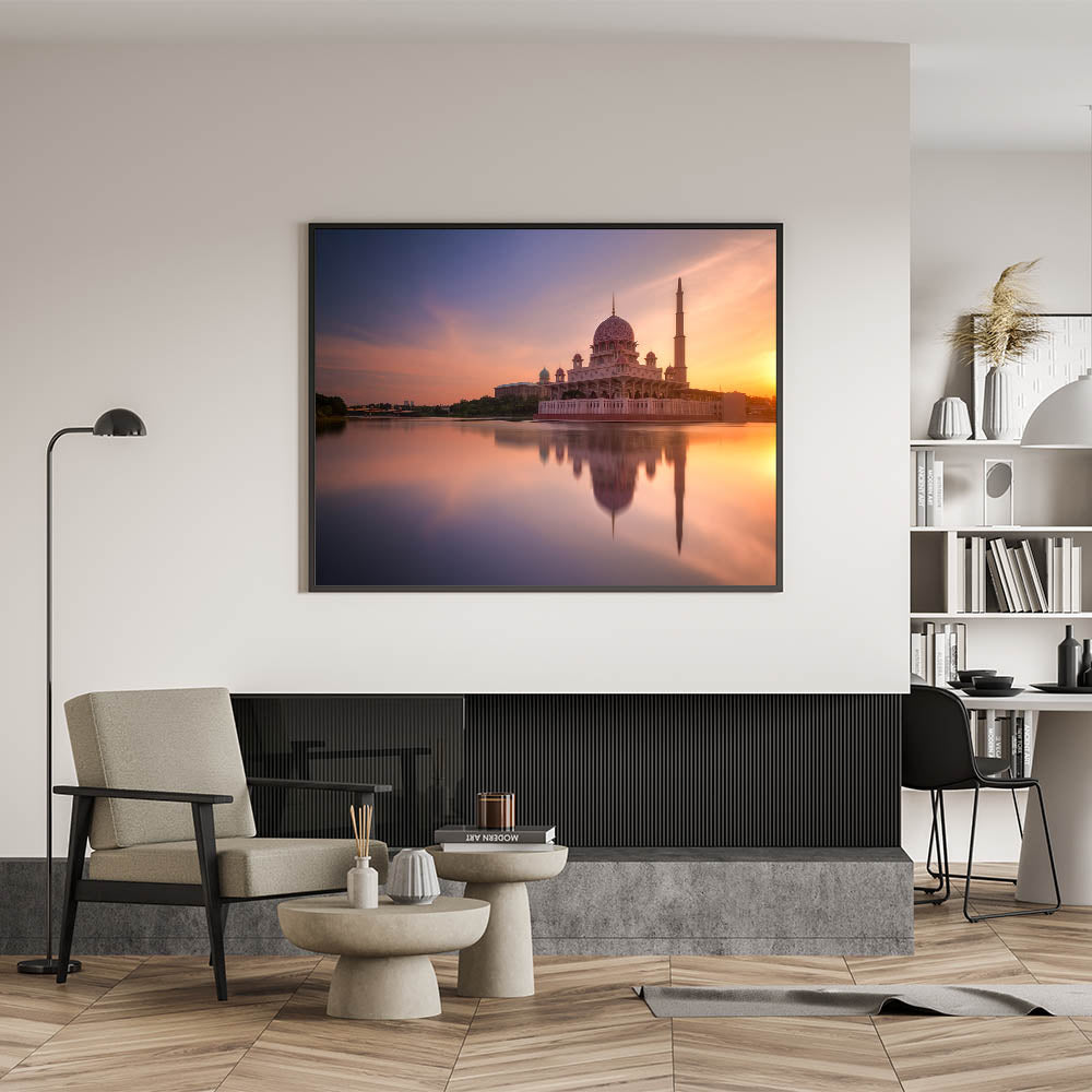 Bask in the serene beauty of Malaysia’s Putra Mosque with this stunning Malaysia Scenery Canvas. Capturing the mosque at sunrise, the soft golden light bathes the iconic structure, reflecting gently in the calm waters below. The subtle transitions between pink, peach, and golden hues in the sky create a peaceful and calming atmosphere, making this artwork a perfect addition to any room looking to evoke tranquility.