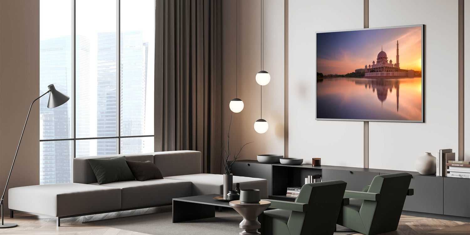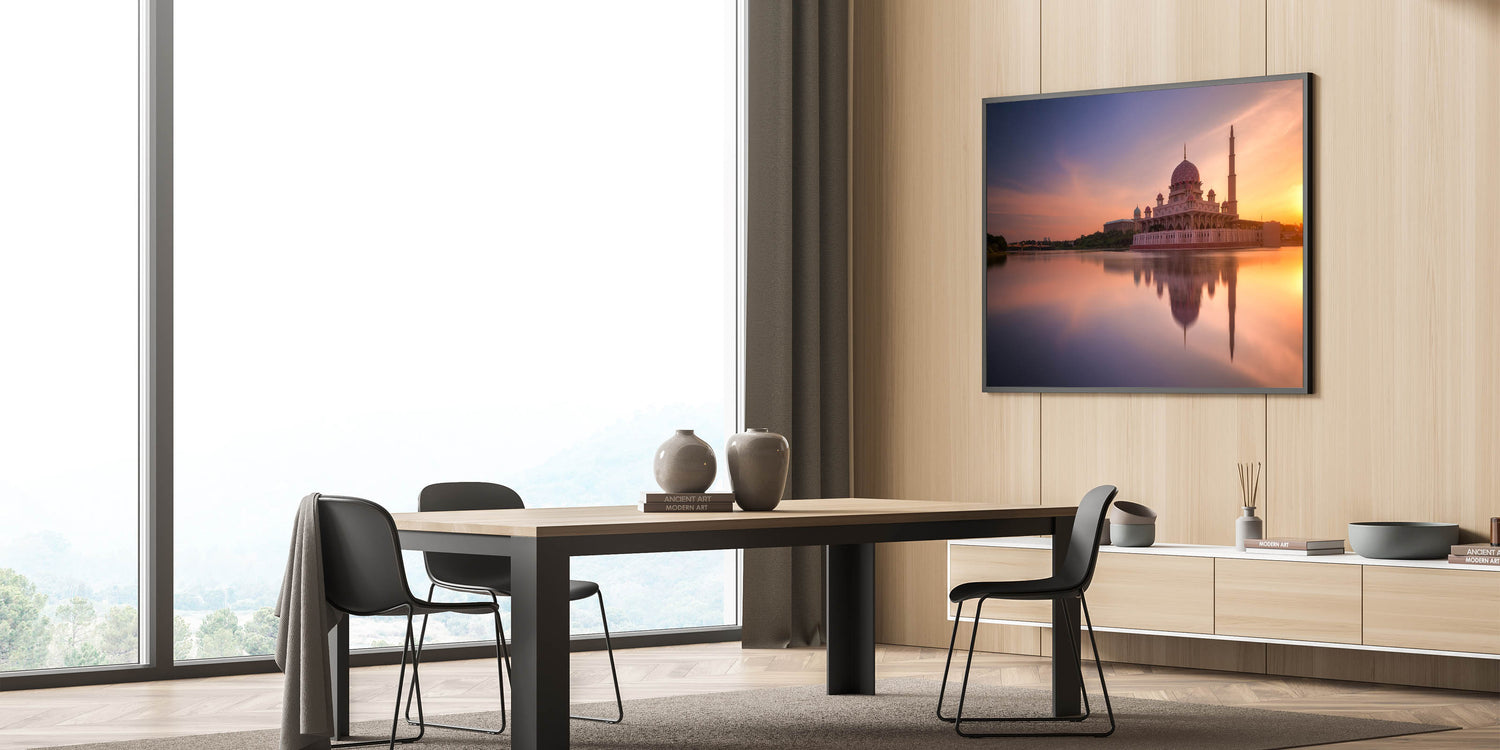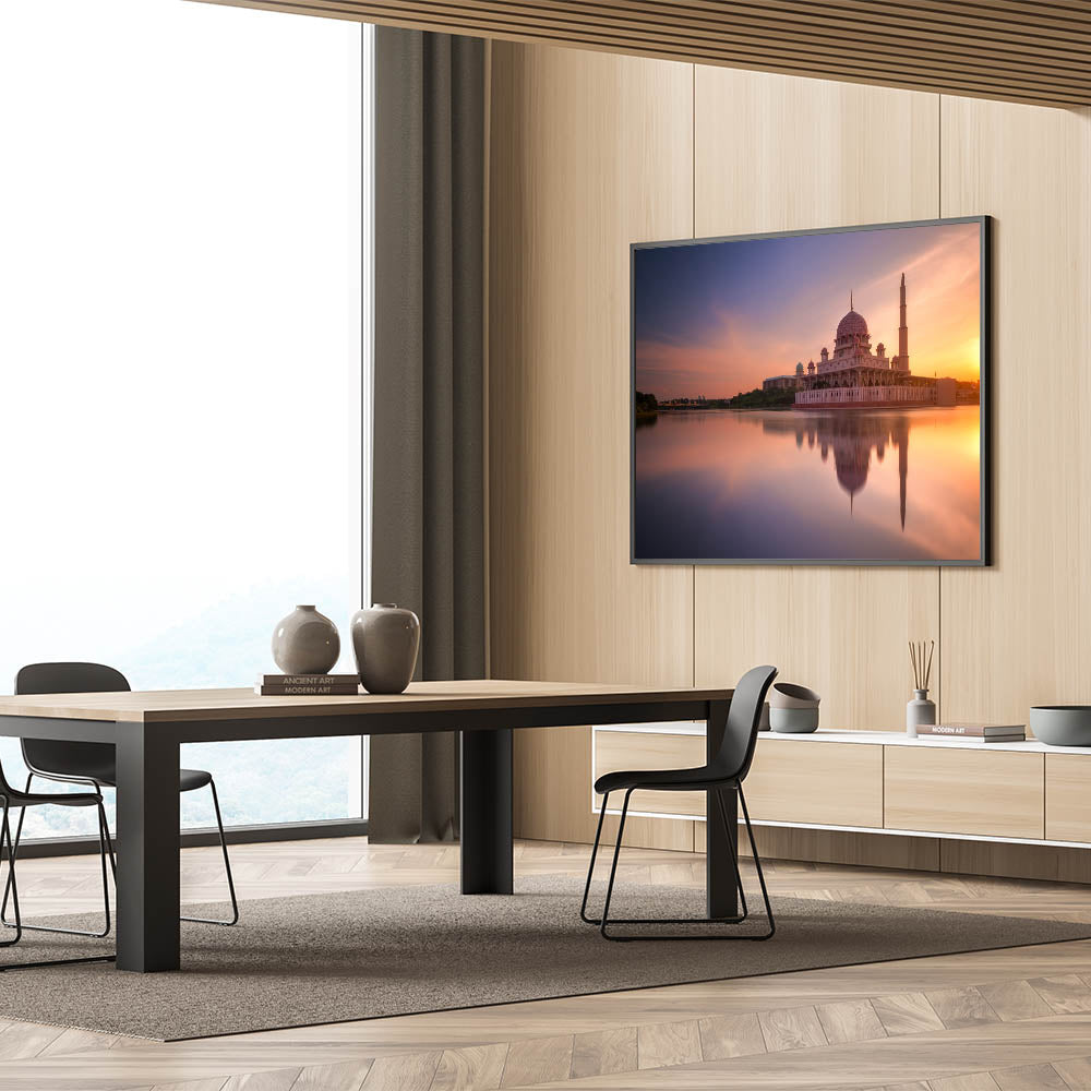 Bask in the serene beauty of Malaysia’s Putra Mosque with this stunning Malaysia Scenery Canvas. Capturing the mosque at sunrise, the soft golden light bathes the iconic structure, reflecting gently in the calm waters below. The subtle transitions between pink, peach, and golden hues in the sky create a peaceful and calming atmosphere, making this artwork a perfect addition to any room looking to evoke tranquility.