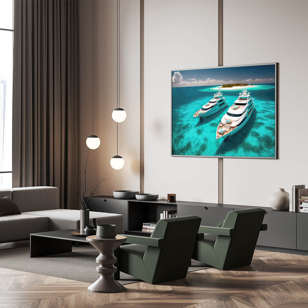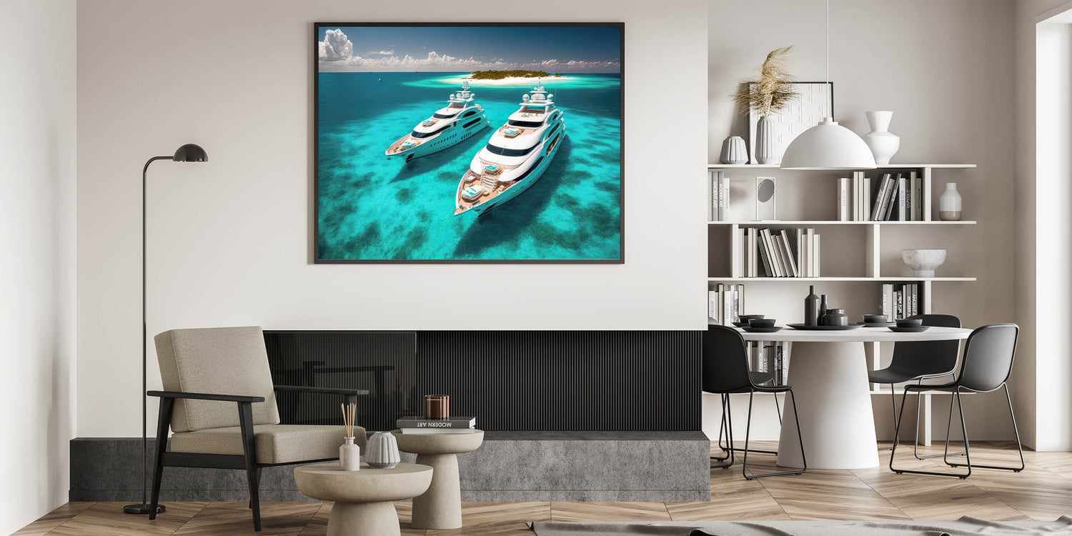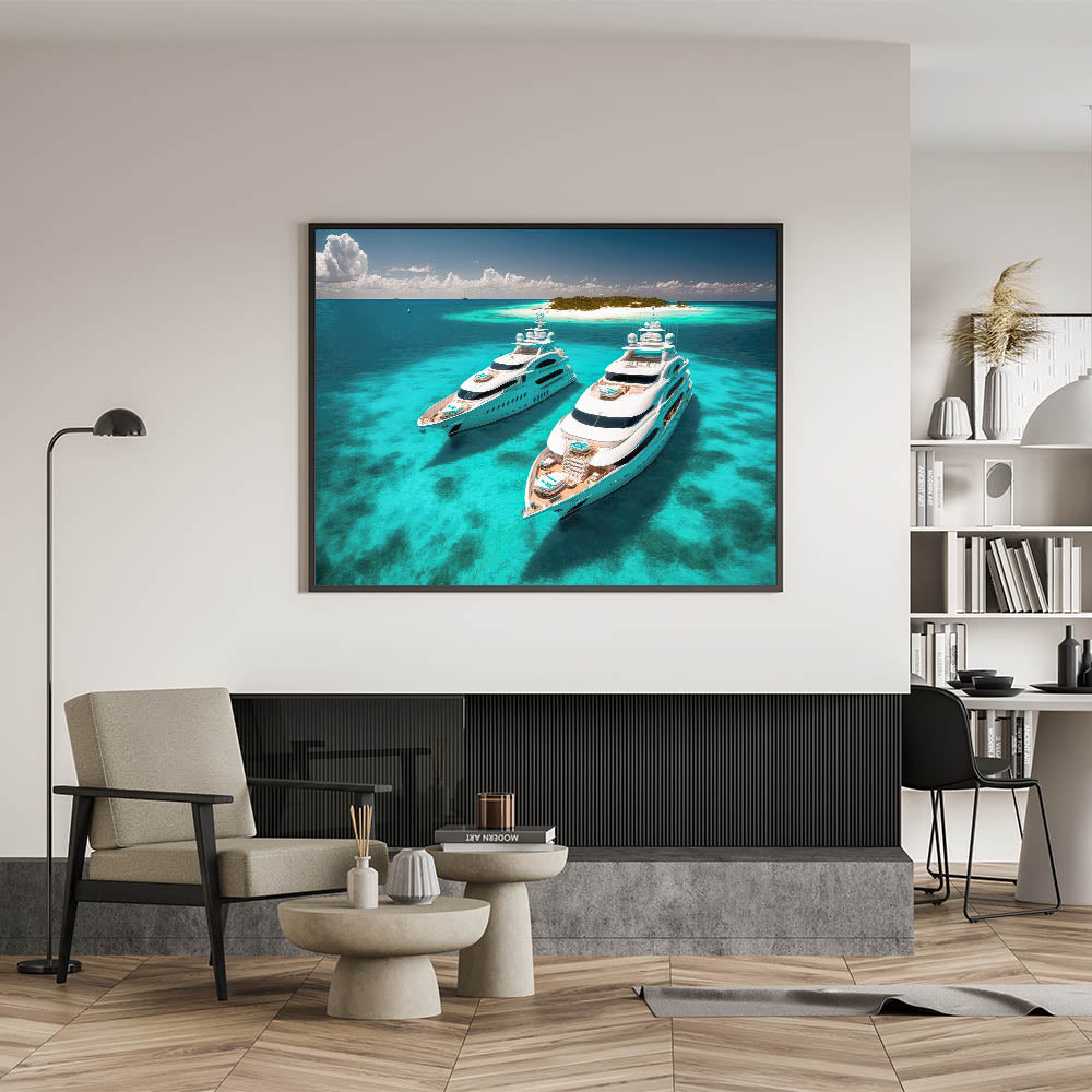 Capture the essence of luxury and tranquility with this breathtaking wall art featuring two stunning yachts anchored in the crystal-clear turquoise waters of the Maldives. The serene tropical backdrop of a small, uninhabited island adds an extra layer of exotic beauty to this scene. The yachts, bathed in sunlight, reflect the epitome of island paradise, making this piece perfect for any room looking for a coastal touch. Whether you're a lover of tropical island decor or a fan of luxury ocean photography, this artwork is sure to bring a serene and elegant atmosphere to your space.