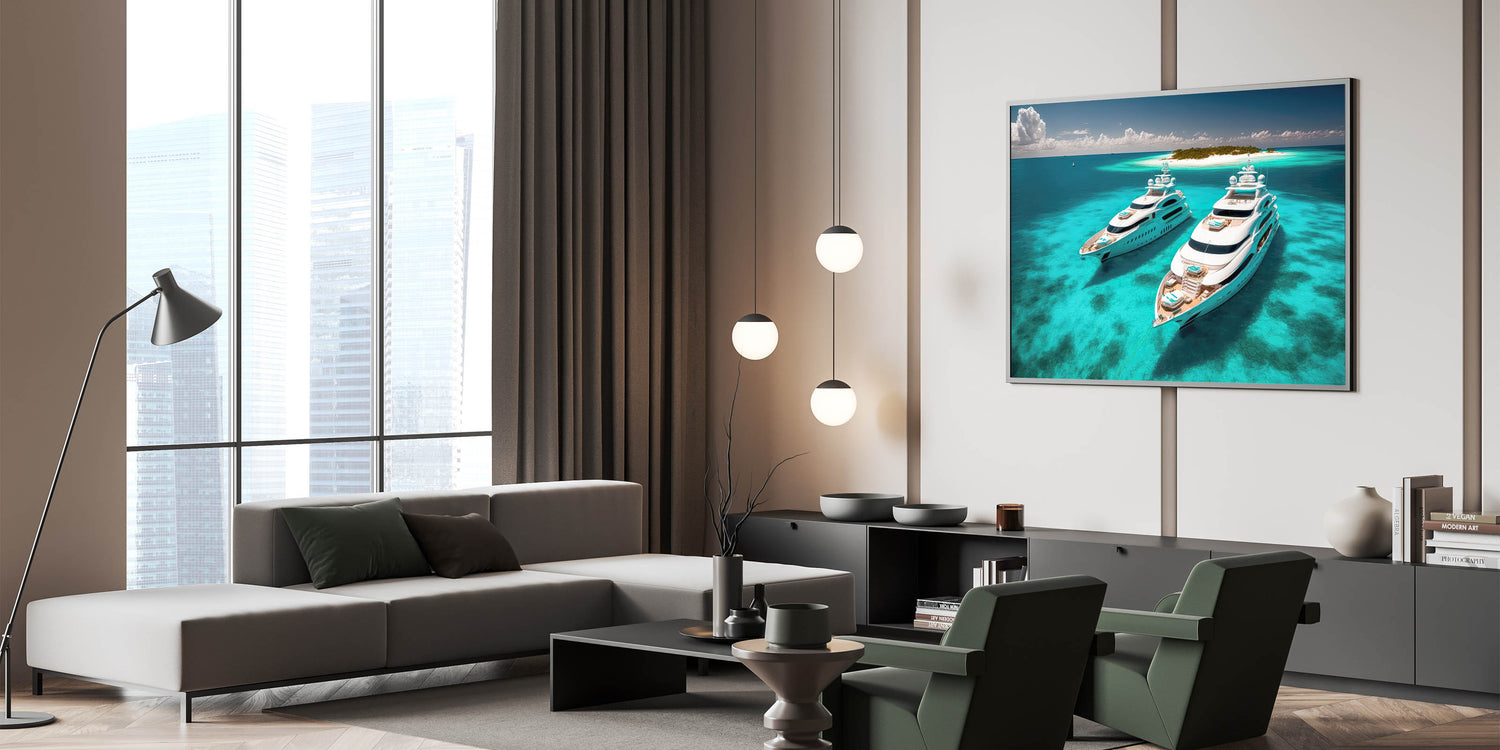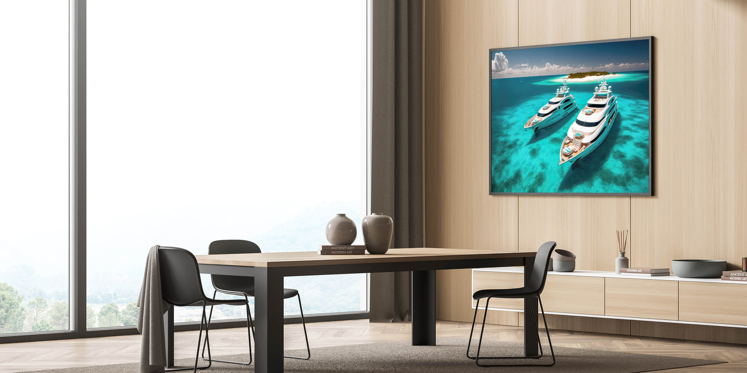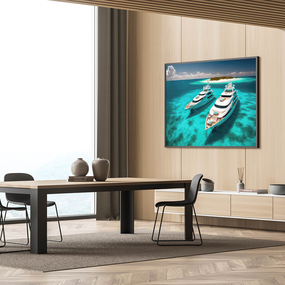 Capture the essence of luxury and tranquility with this breathtaking wall art featuring two stunning yachts anchored in the crystal-clear turquoise waters of the Maldives. The serene tropical backdrop of a small, uninhabited island adds an extra layer of exotic beauty to this scene. The yachts, bathed in sunlight, reflect the epitome of island paradise, making this piece perfect for any room looking for a coastal touch. Whether you're a lover of tropical island decor or a fan of luxury ocean photography, this artwork is sure to bring a serene and elegant atmosphere to your space.