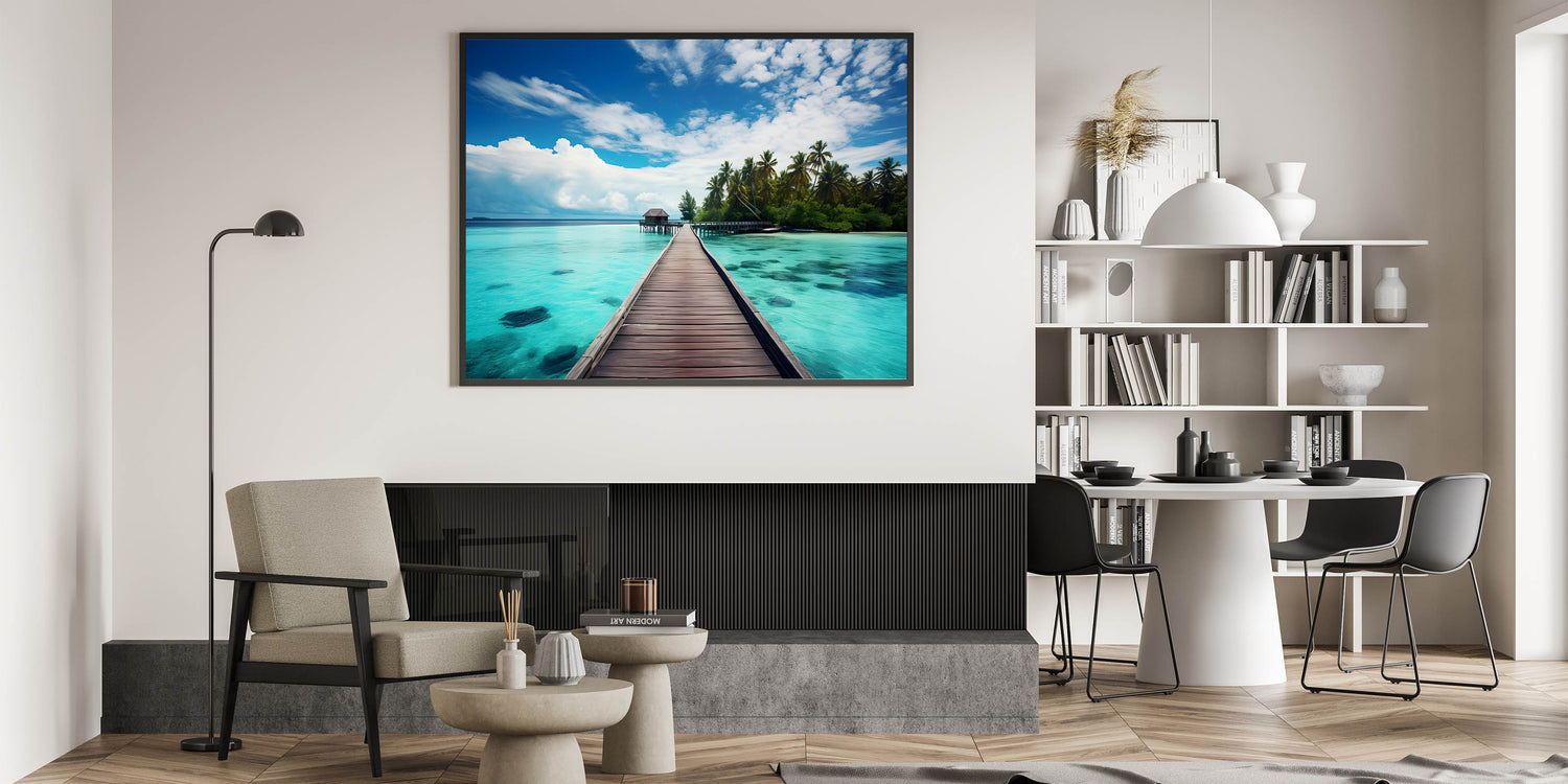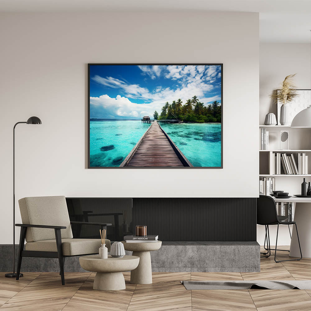 Immerse yourself in the tranquil beauty of the Maldives with this stunning ocean view wall art. Featuring a picturesque wooden boardwalk extending over crystal-clear turquoise waters, this artwork captures the essence of a tropical paradise. The lush greenery of the palm trees and the vibrant blue sky offer a serene escape, perfect for enhancing your home decor with a touch of island luxury.