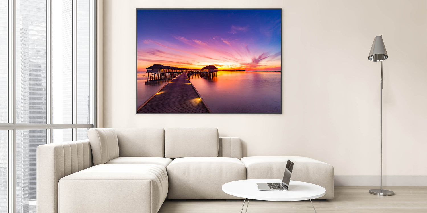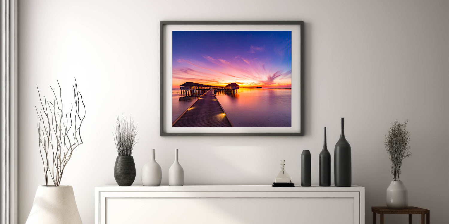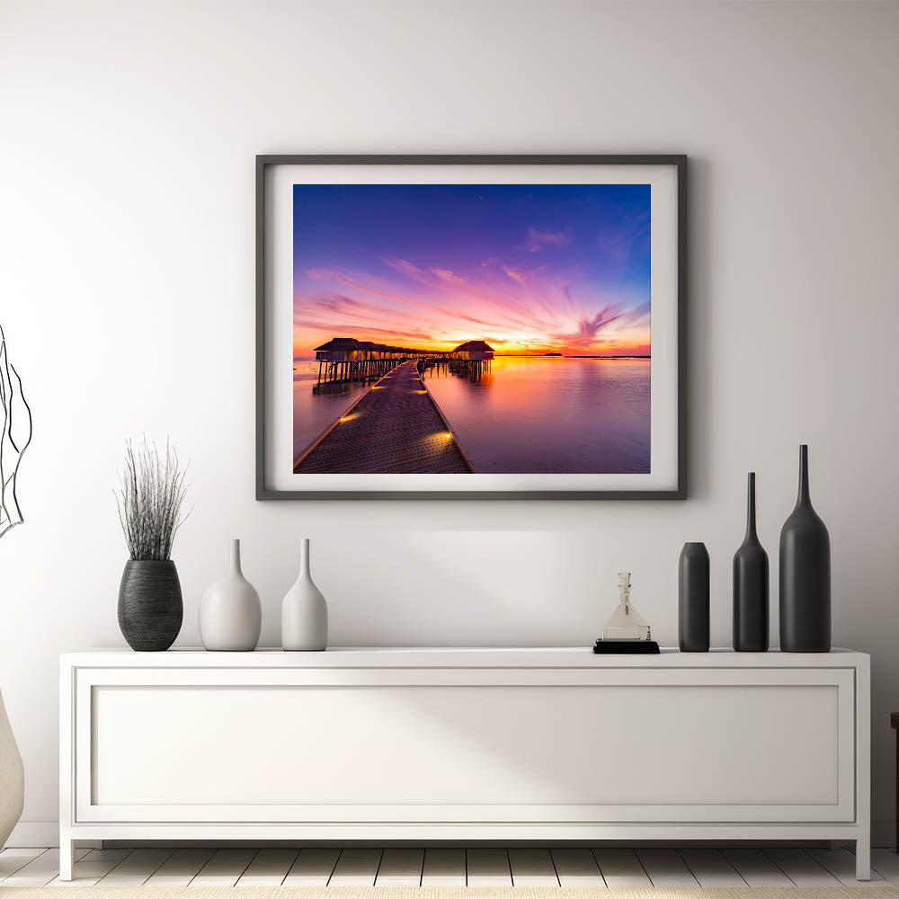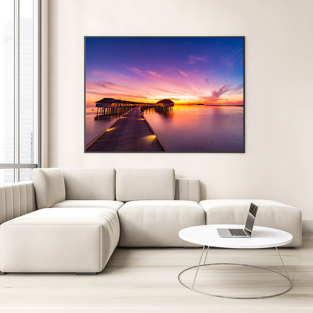 - High-quality Maldives canvas prints showcasing vibrant ocean views and stunning sunsets.