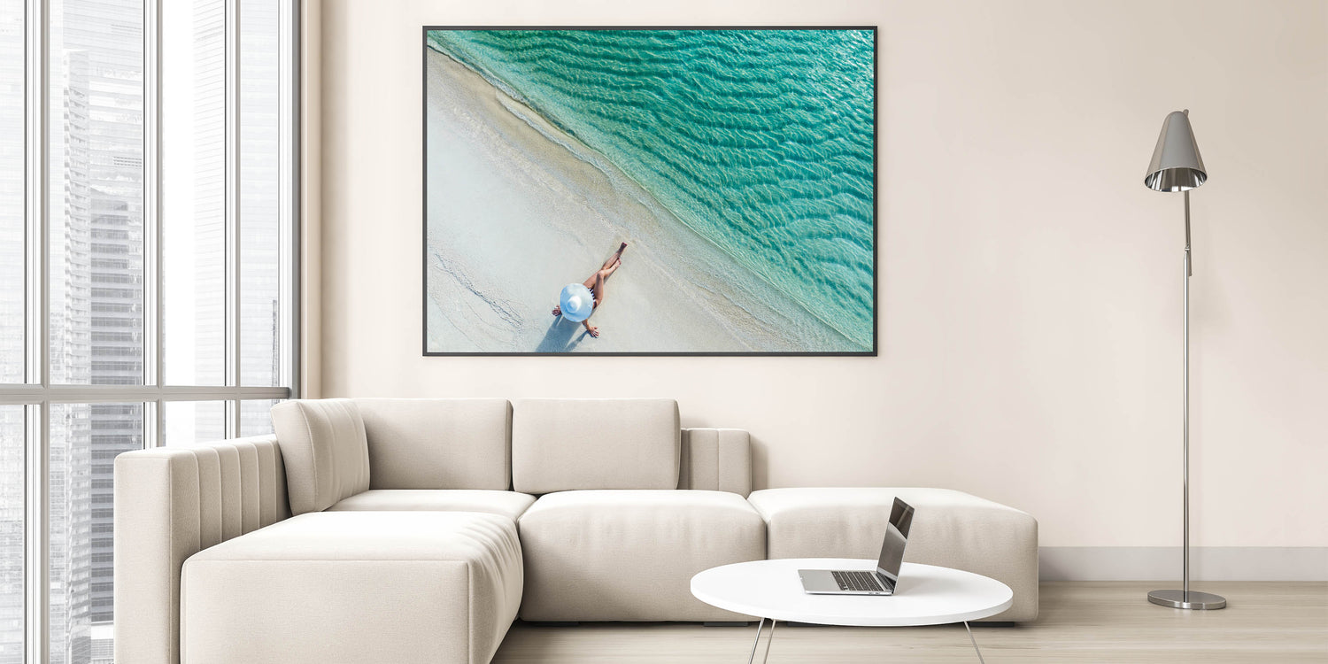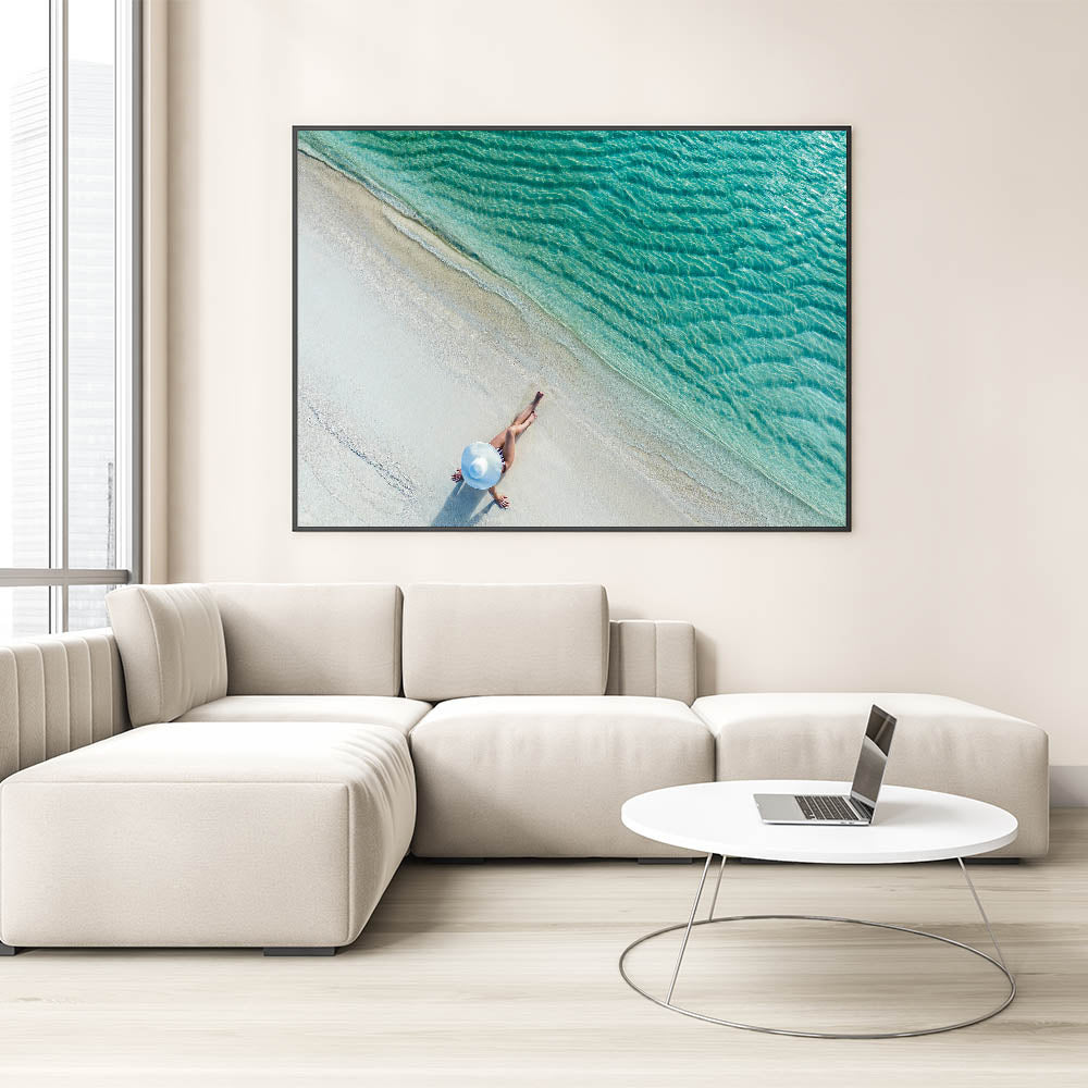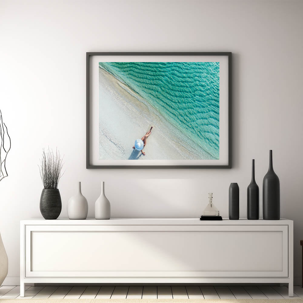 Bring the calming serenity of the Maldives into your home with this stunning wall art. Featuring a tranquil beach scene with a person relaxing on soft white sands by the crystal-clear turquoise waters, this artwork captures the essence of relaxation. Perfect for creating a peaceful and calming atmosphere, this print is ideal for any room that needs a touch of tropical serenity.