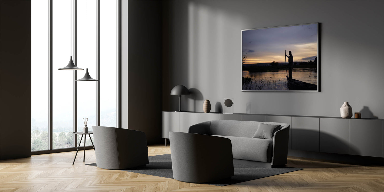 - Serene Visuals: The soft hues of the sunset and the silhouette create a harmonious and calming effect, ideal for relaxation spaces.