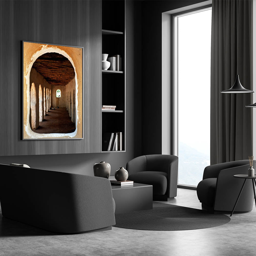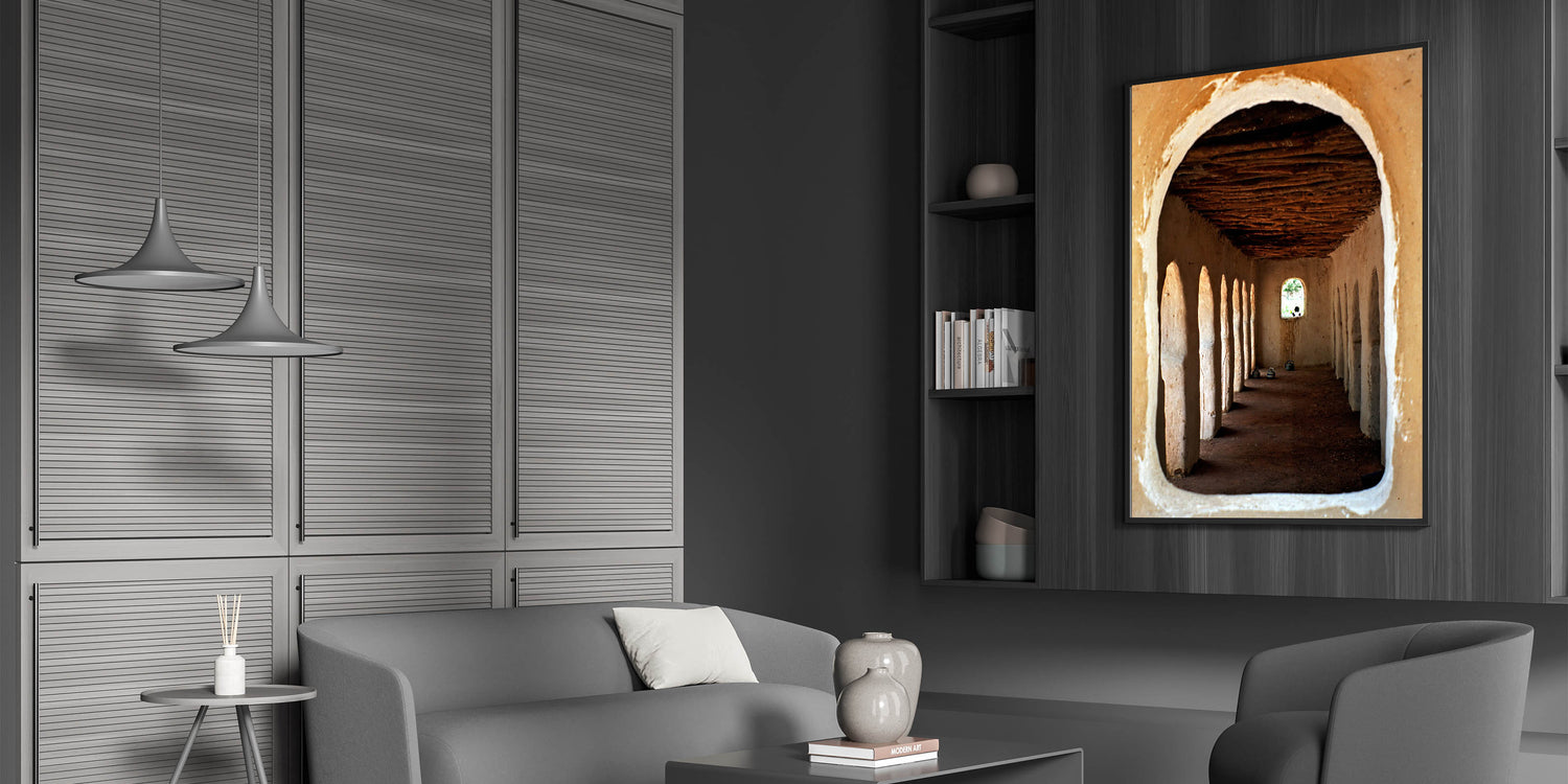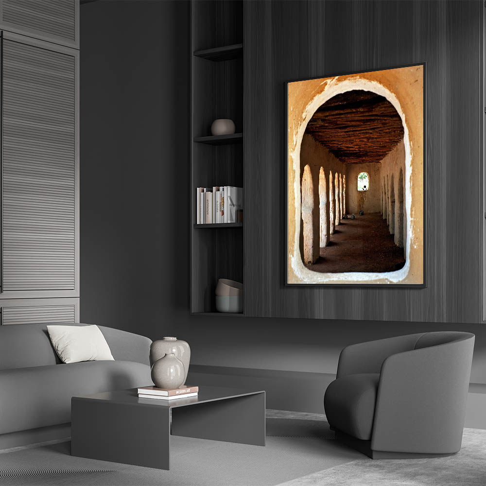 Immerse yourself in the rich cultural heritage of Mali with this captivating piece of wall art, showcasing traditional African architecture. The image beautifully captures the rustic charm of a historical structure, with its arched doorways and textured walls leading the eye toward a distant window. This artwork not only serves as a visual representation of Mali’s cultural essence but also adds an element of history and depth to your living space.
