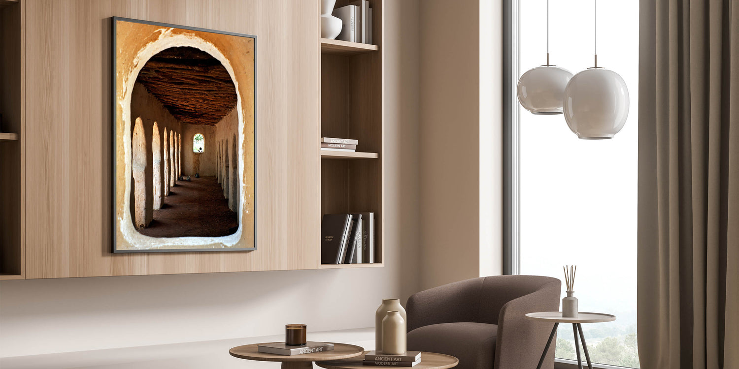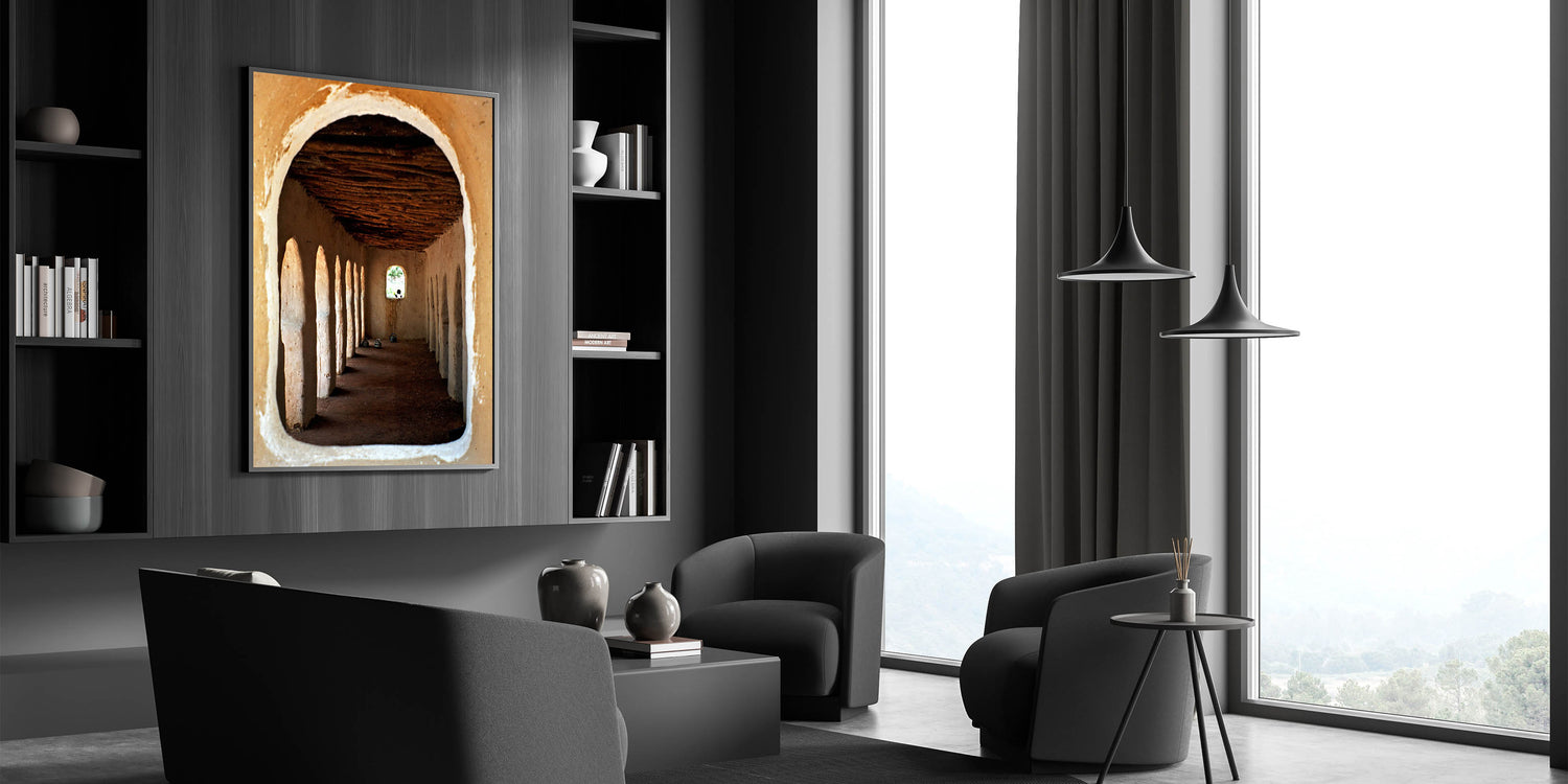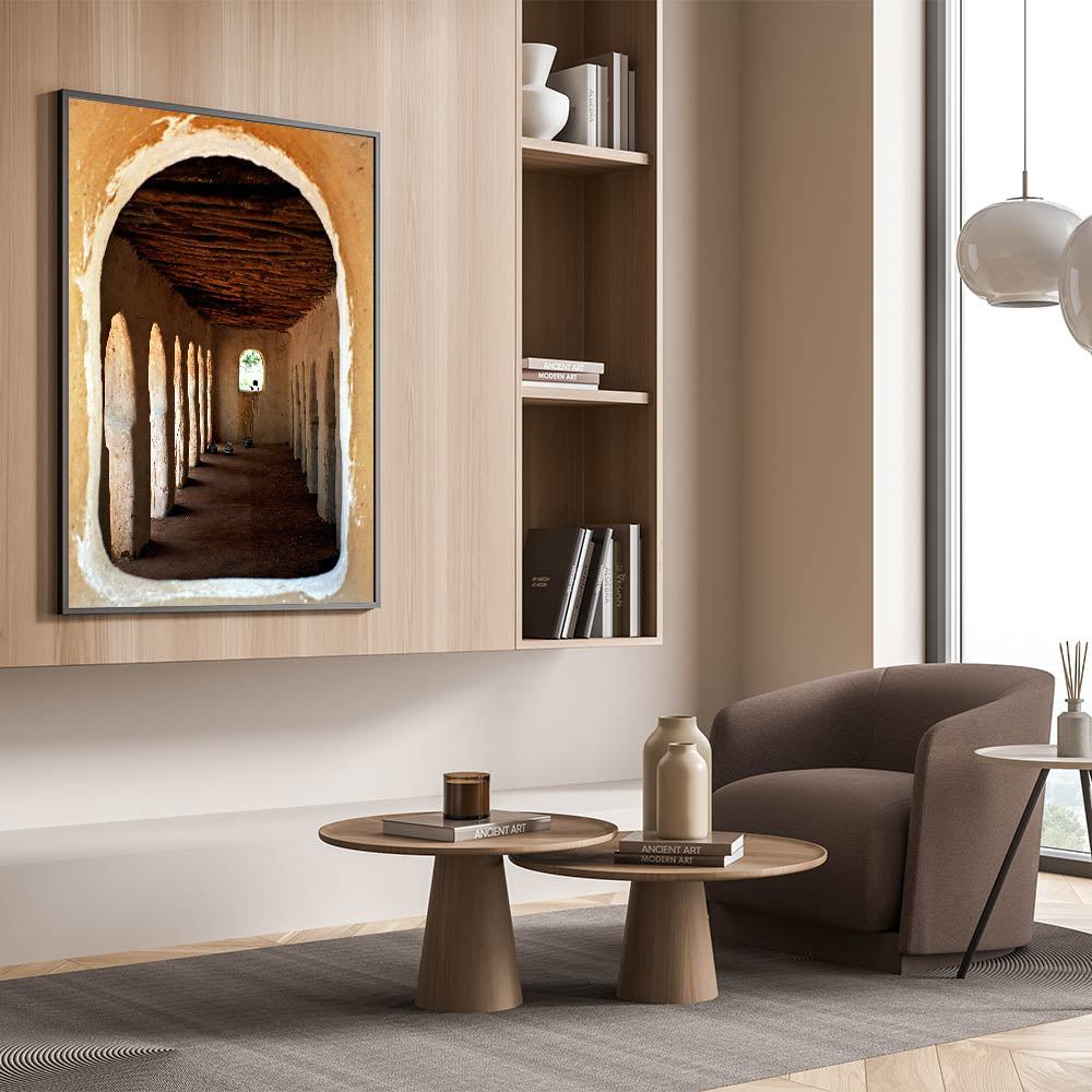 Immerse yourself in the rich cultural heritage of Mali with this captivating piece of wall art, showcasing traditional African architecture. The image beautifully captures the rustic charm of a historical structure, with its arched doorways and textured walls leading the eye toward a distant window. This artwork not only serves as a visual representation of Mali’s cultural essence but also adds an element of history and depth to your living space.