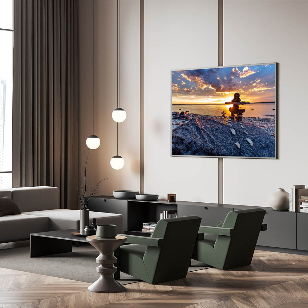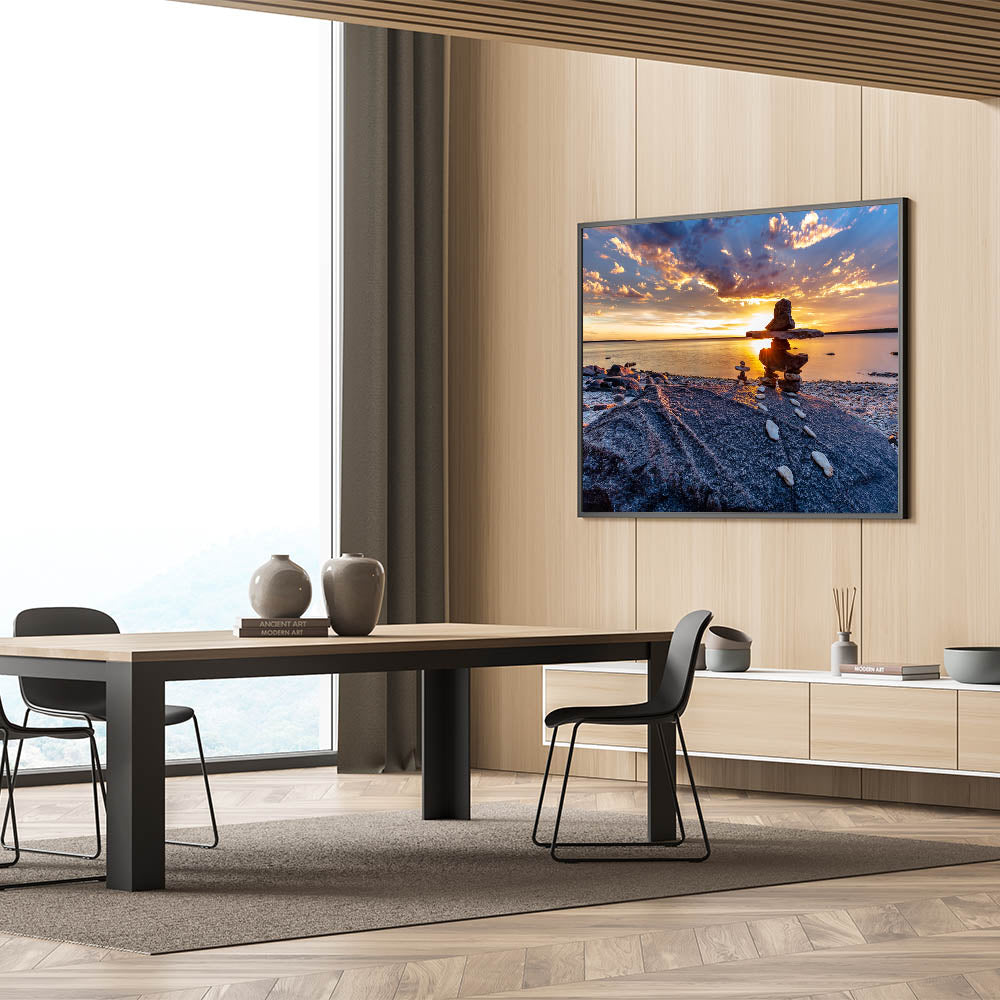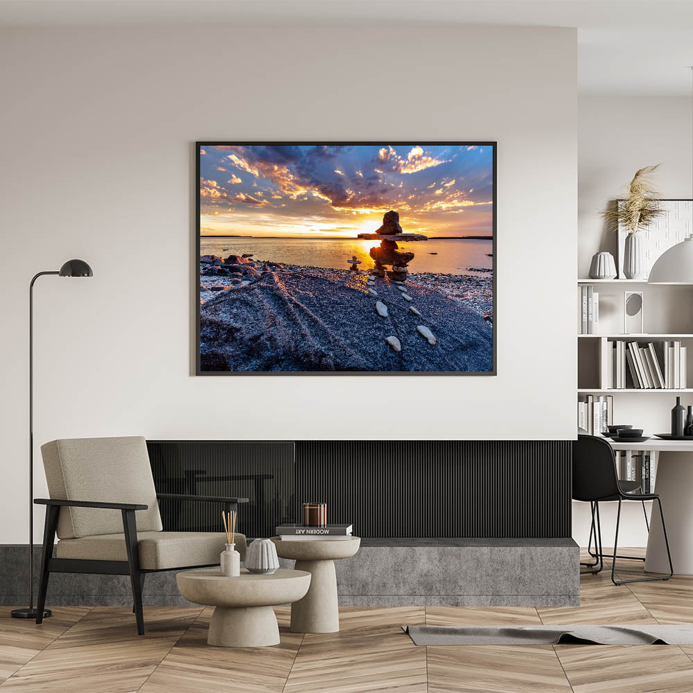 Celebrate the beauty and symbolism of the Inukshuk with this breathtaking Manitoba sunset wall art. Set against a serene lake backdrop, this stone sculpture is illuminated by the golden hues of the setting sun, creating a tranquil and meaningful scene. The Inukshuk, a symbol of guidance and community, adds a cultural and natural touch to this stunning artwork, making it perfect for nature lovers and those who appreciate the heritage of the land.