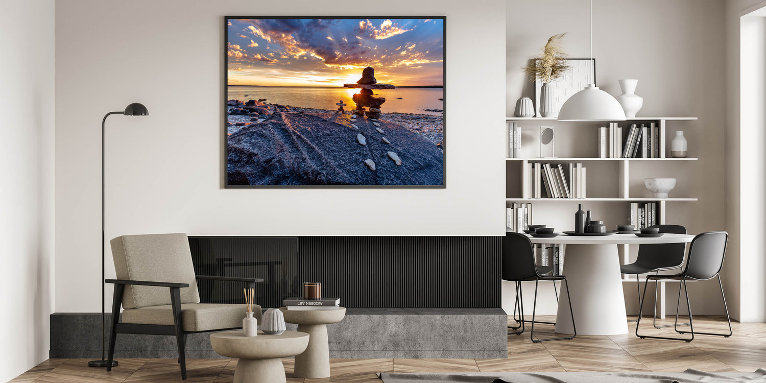 Manitoba Inukshuk Sunset - Peaceful Lakeside Stone Sculpture Wall Art