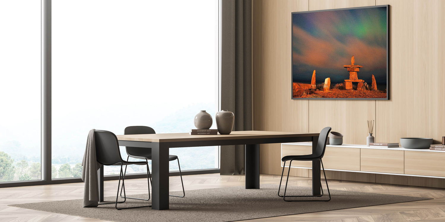 Embrace the cultural significance of the inukshuk under the mesmerizing Northern Lights with this stunning Manitoba wall art. The ancient stone structure, a symbol of guidance and community, stands tall against the vibrant backdrop of the aurora borealis, casting its glow across the night sky. The rich, warm tones of the inukshuk contrast beautifully with the ethereal greens and blues of the aurora, making this artwork a captivating addition to any space.