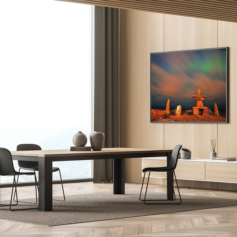 - Captures the natural beauty of the aurora and the timeless presence of the inukshuk
