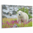 - Showcases a polar bear in its natural habitat, surrounded by native flowers and rocky terrain