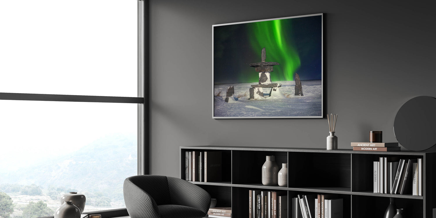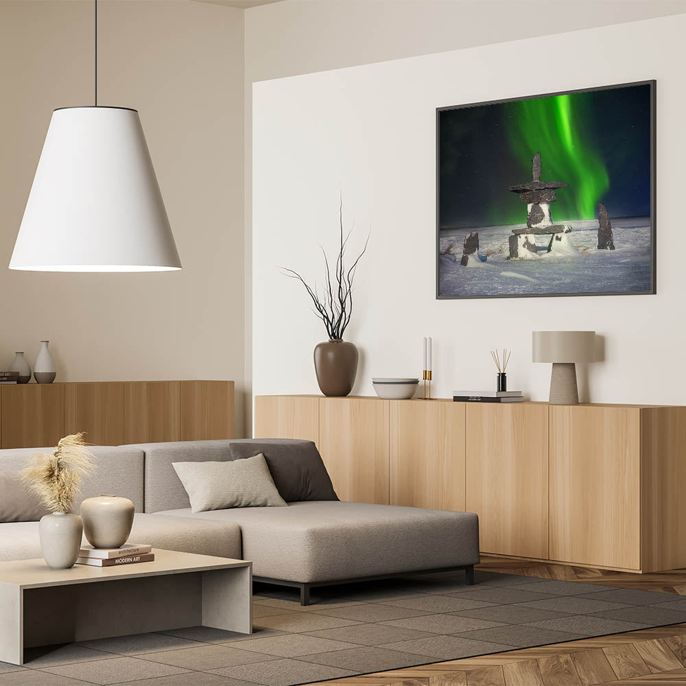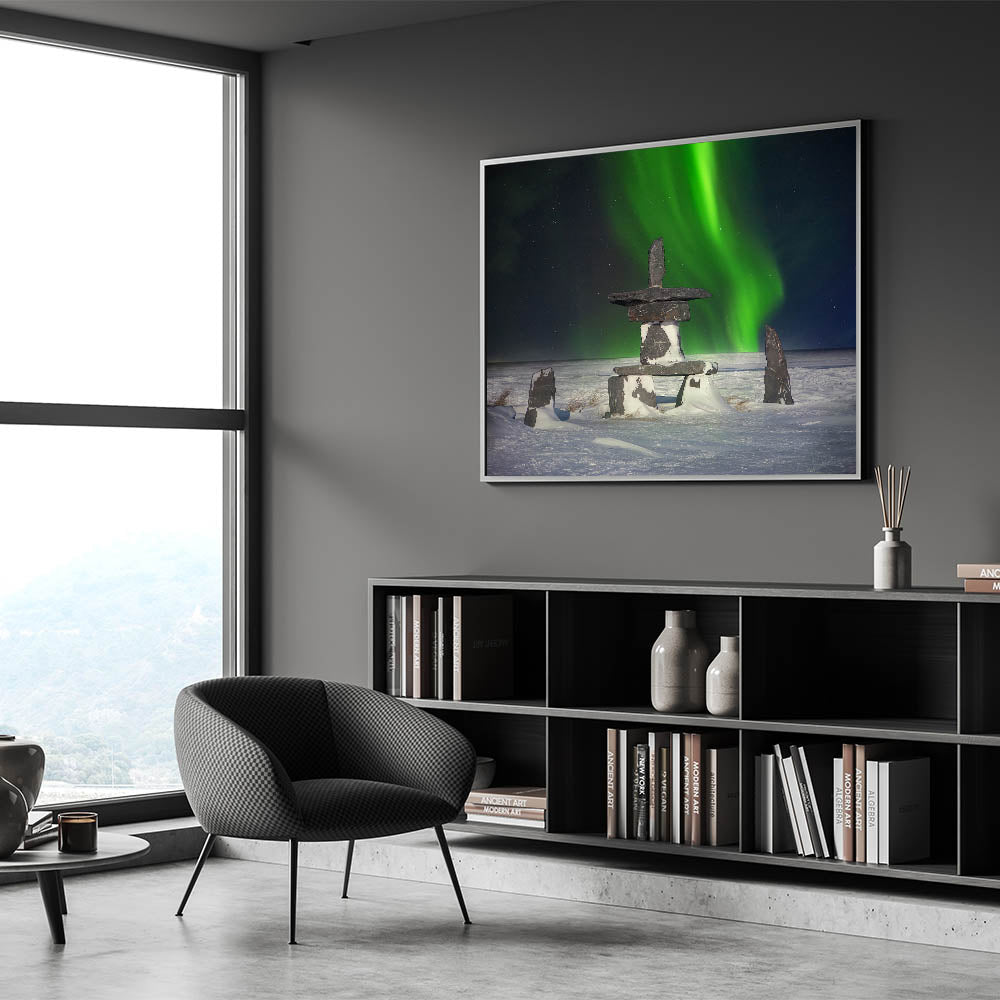 Bring the serenity of the Northern Lights and the cultural significance of the inukshuk into your home with this stunning winter wall art. Perfect for adding a touch of beauty and history to any space, this piece will inspire wonder and tranquility. Make it a part of your decor today!