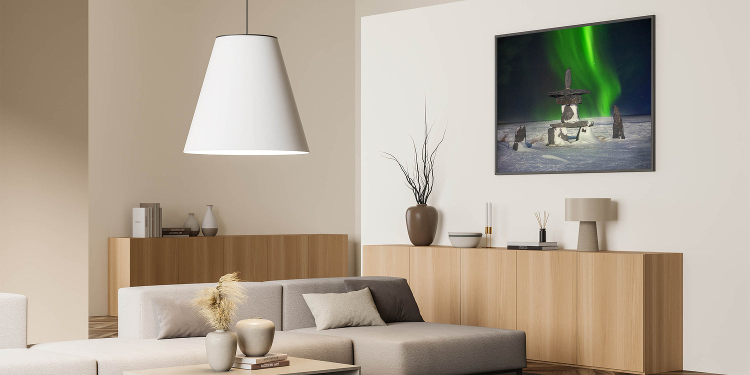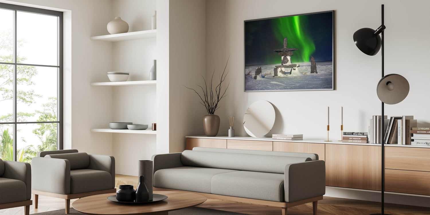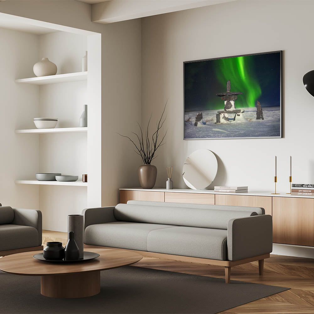 Bring the serenity of the Northern Lights and the cultural significance of the inukshuk into your home with this stunning winter wall art. Perfect for adding a touch of beauty and history to any space, this piece will inspire wonder and tranquility. Make it a part of your decor today!