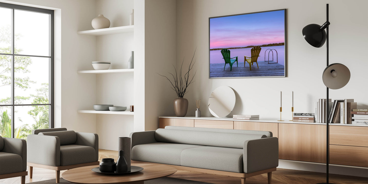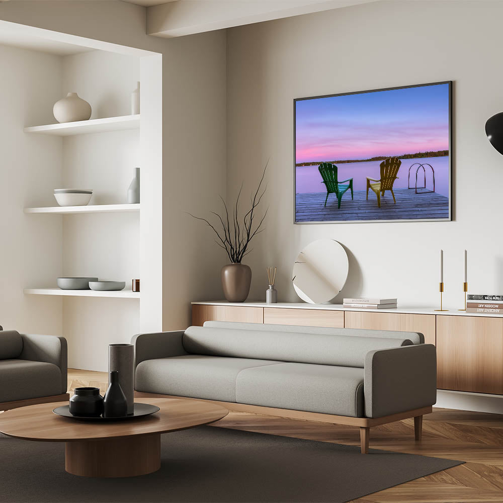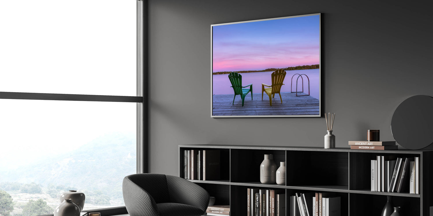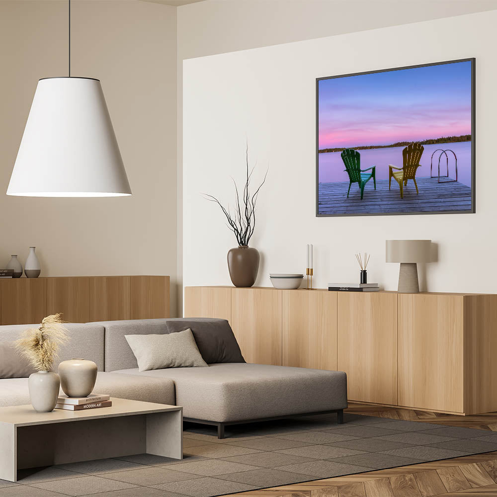 Bring the tranquility of a peaceful Manitoba evening into your home with this captivating wall art. Featuring two colorful Adirondack chairs on a wooden dock, the scene overlooks a calm lake bathed in the soft hues of sunset. The inviting colors of the sky and the stillness of the water create a serene atmosphere, perfect for anyone who loves nature and peaceful moments by the water.