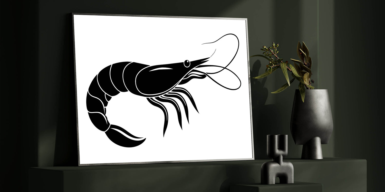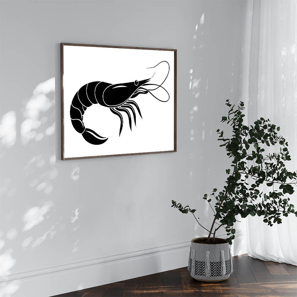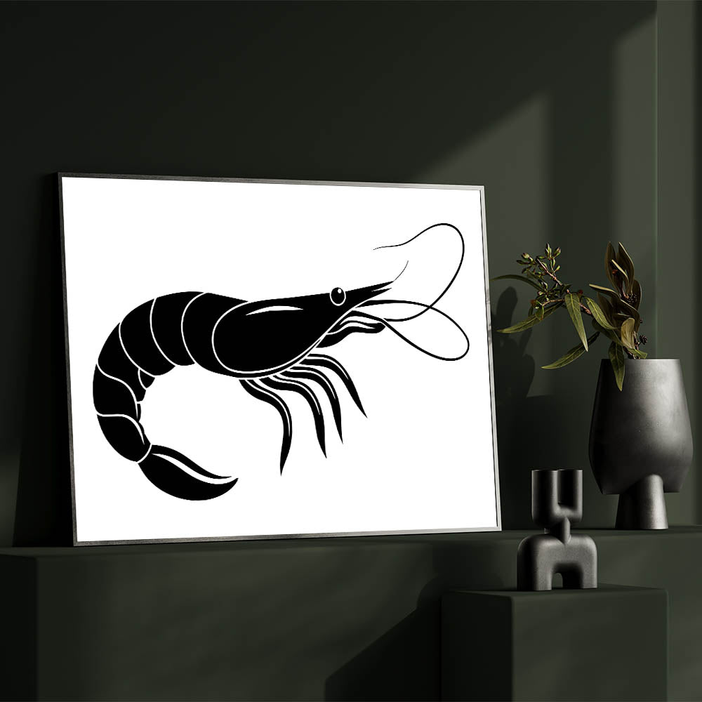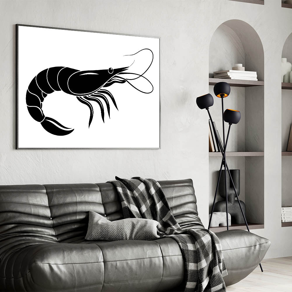 • Minimalist Design: Bold black shrimp illustration on a clean white background, available in various formats such as stretched canvas, framed prints, and acrylic glass.