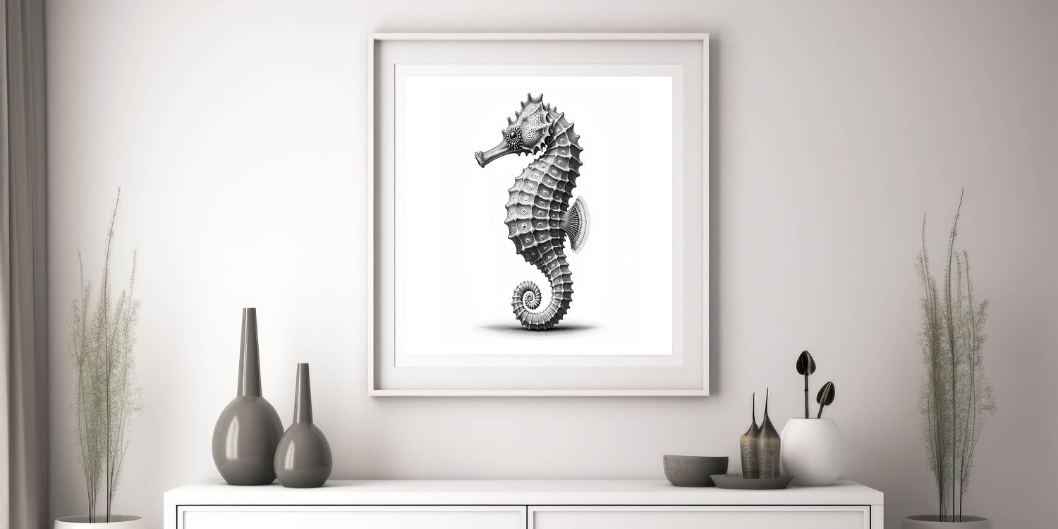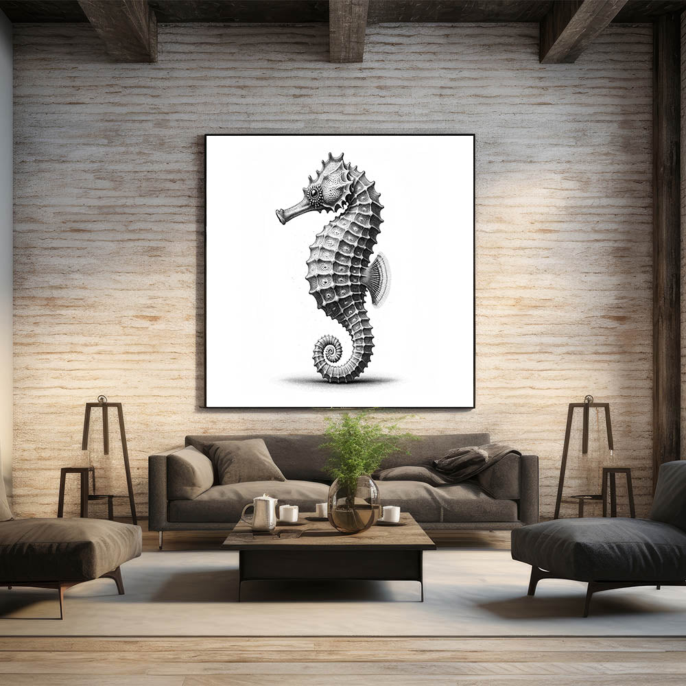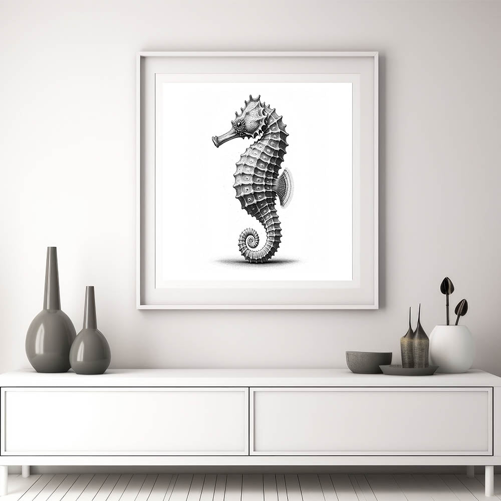 Introduce a touch of refined elegance to your space with this monochrome seahorse wall art. The detailed black and white design captures the intricate texture and form of the seahorse, making it an exquisite addition to any room. This artwork is perfect for those who appreciate minimalist design and the timeless appeal of monochromatic decor.