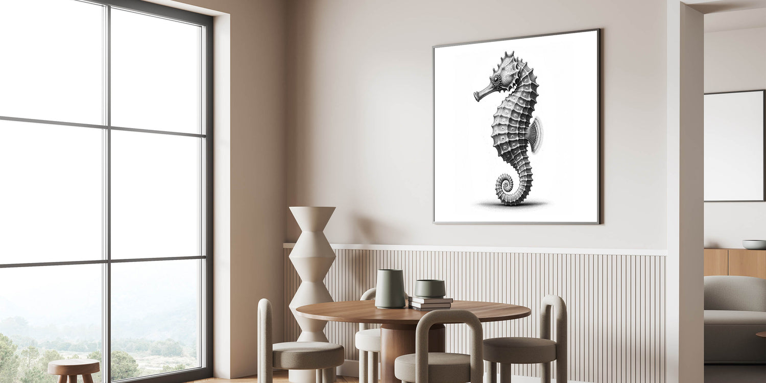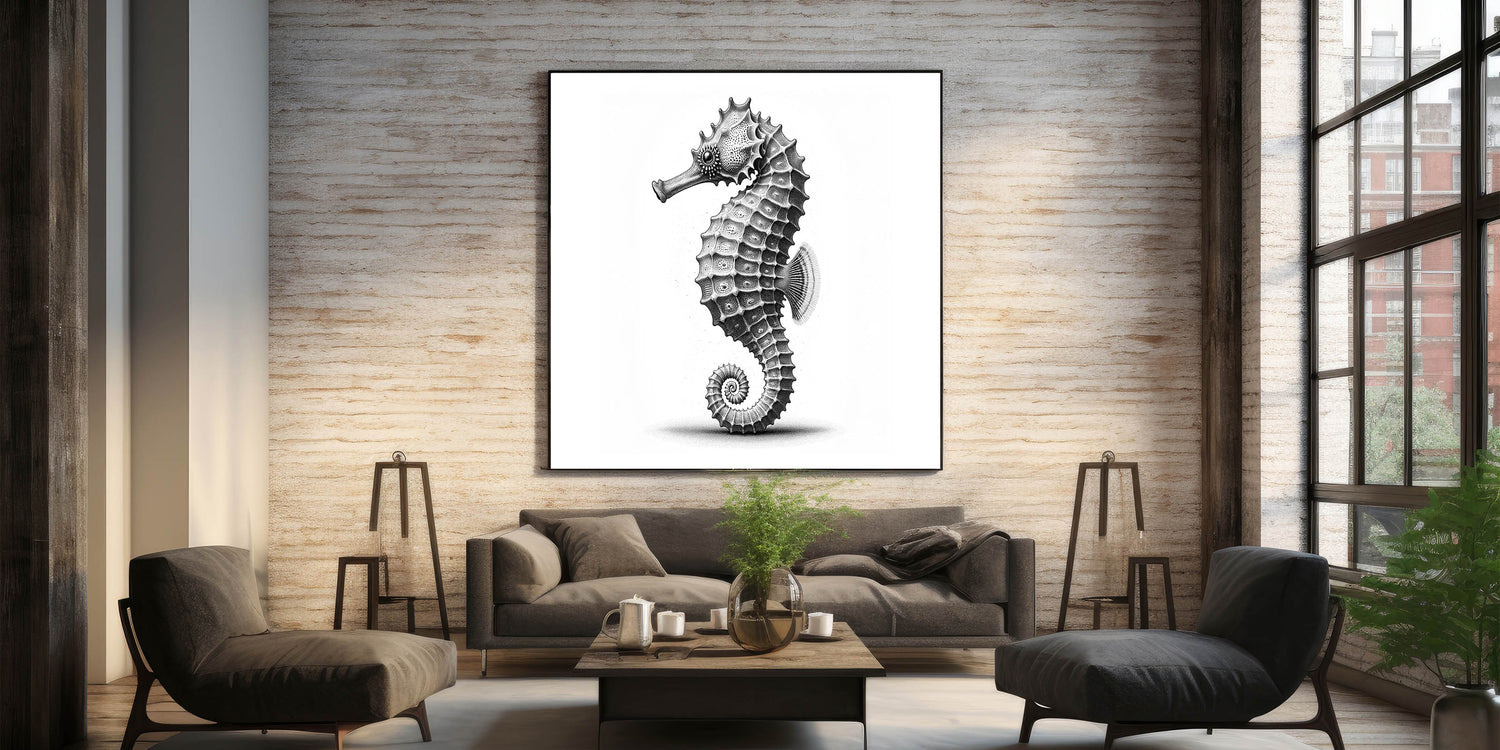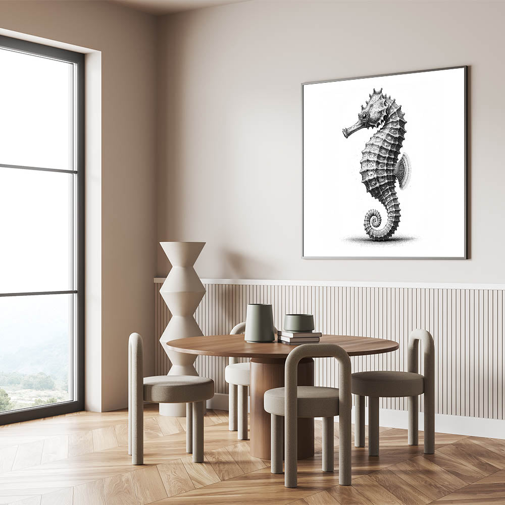 Introduce a touch of refined elegance to your space with this monochrome seahorse wall art. The detailed black and white design captures the intricate texture and form of the seahorse, making it an exquisite addition to any room. This artwork is perfect for those who appreciate minimalist design and the timeless appeal of monochromatic decor.