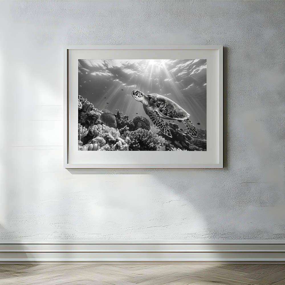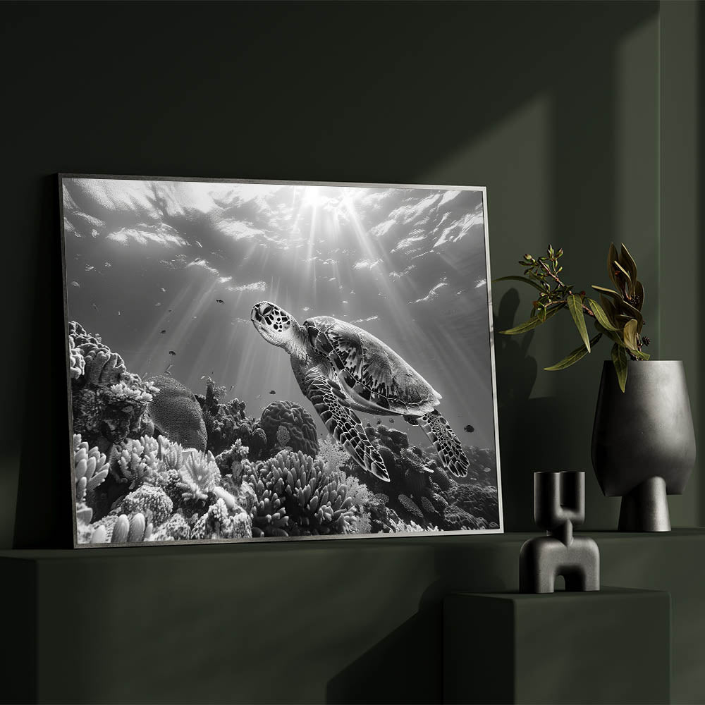 Elevate your space with this Monochrome Turtle Wall Art, a striking piece that combines the elegance of black and white photography with the serenity of marine life. This stunning canvas print captures a sea turtle gracefully swimming through an underwater world, bathed in soft rays of sunlight. Perfect for modern and minimalist decor, this artwork adds a sophisticated and tranquil touch to any room.