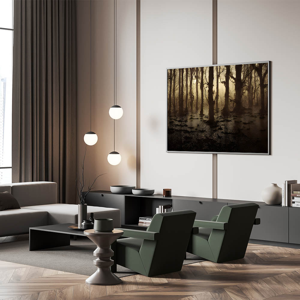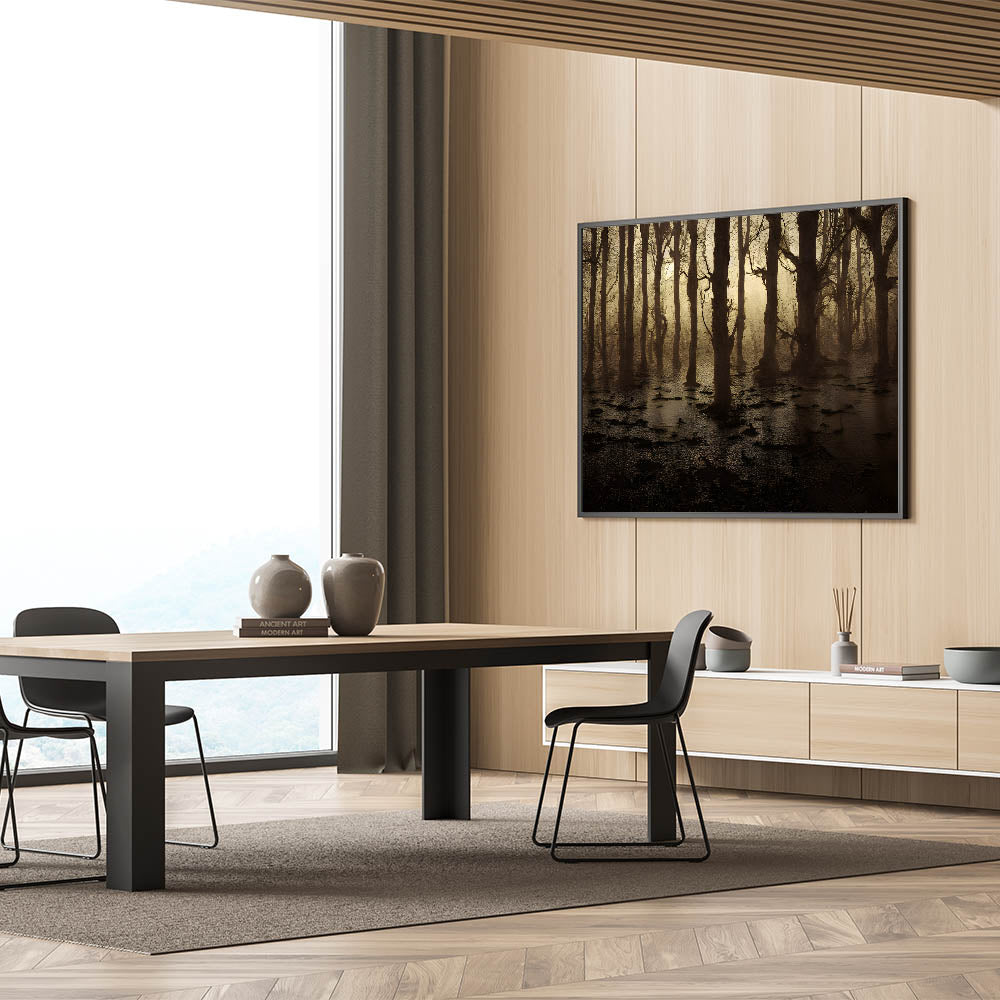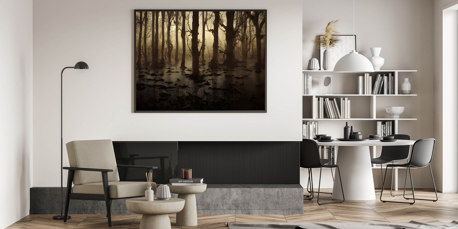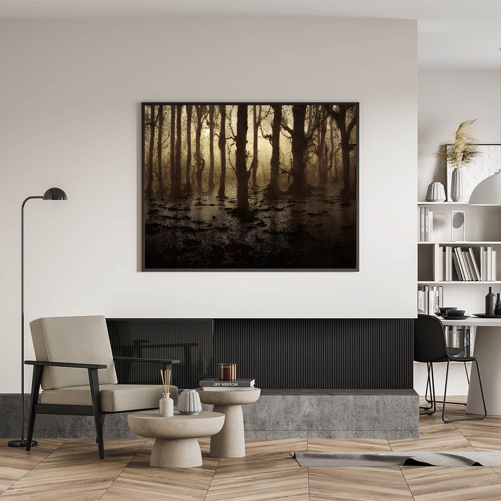 Transform your space with this evocative swamp forest view, where the interplay of light and darkness creates a hauntingly beautiful scene. This artwork is perfect for anyone looking to add a unique and atmospheric element to their decor. Discover our full collection of marsh and swamp wall art to find the perfect piece for your home.