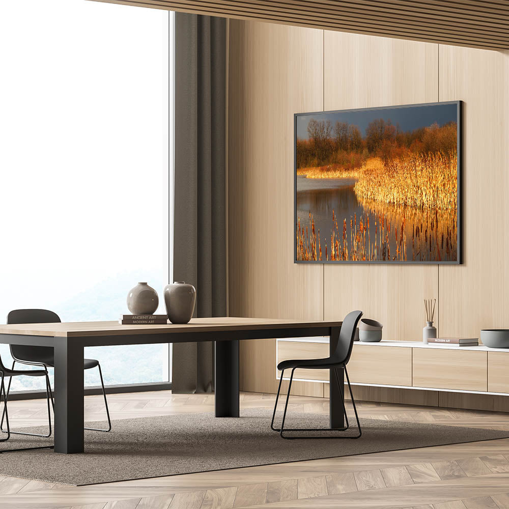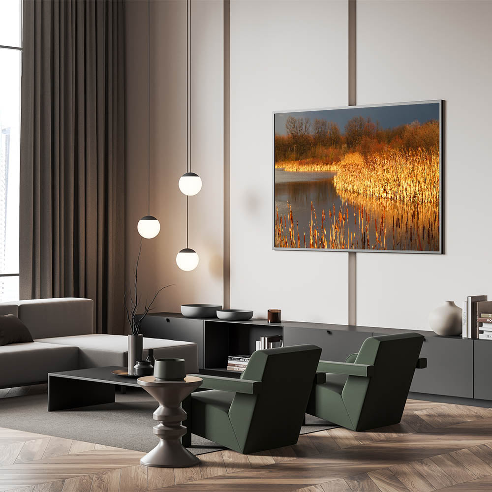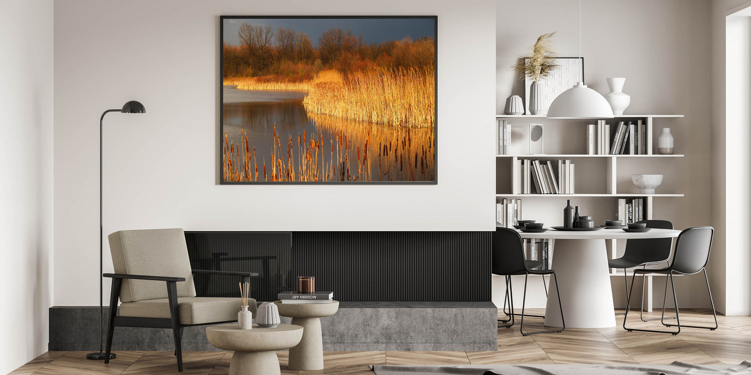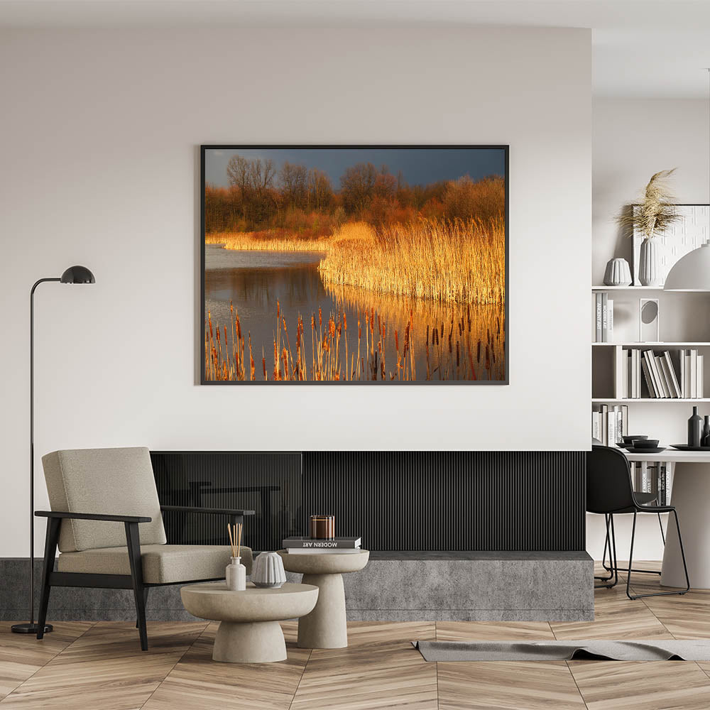 Transform your space with this beautiful depiction of golden marsh reeds at sunset, where the interplay of light and nature creates a soothing and radiant ambiance. Perfect for nature lovers and those looking to add a peaceful, golden element to their decor. Explore our collection of marsh and swamp wall art to find the perfect piece for your home.