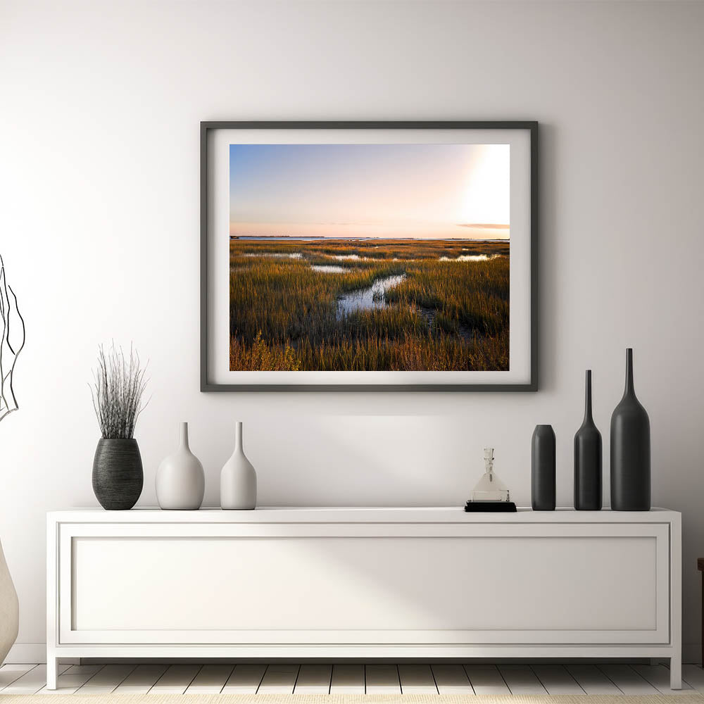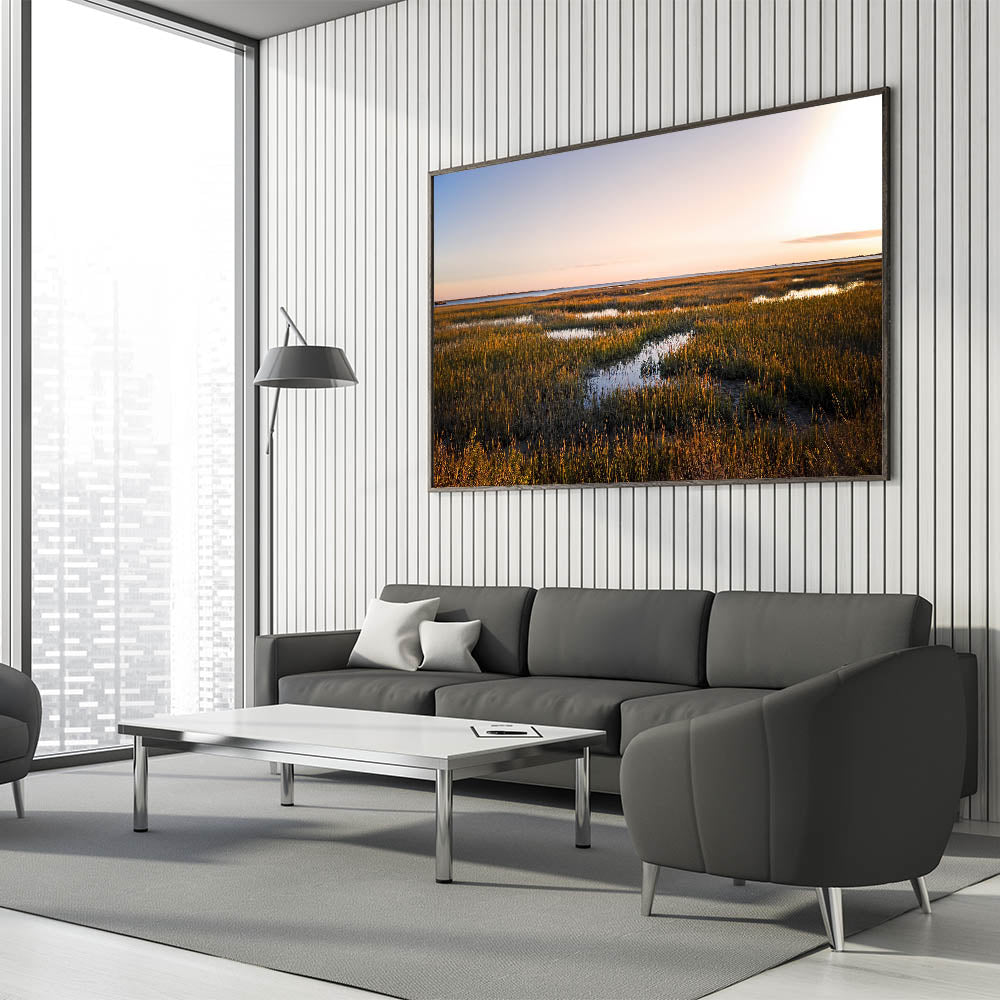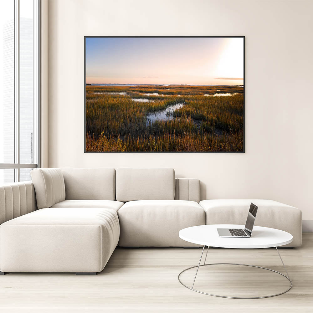 This golden marshland wall art is a beautiful addition to any home, offering a moment of calm and reflection with its serene sunset scene.