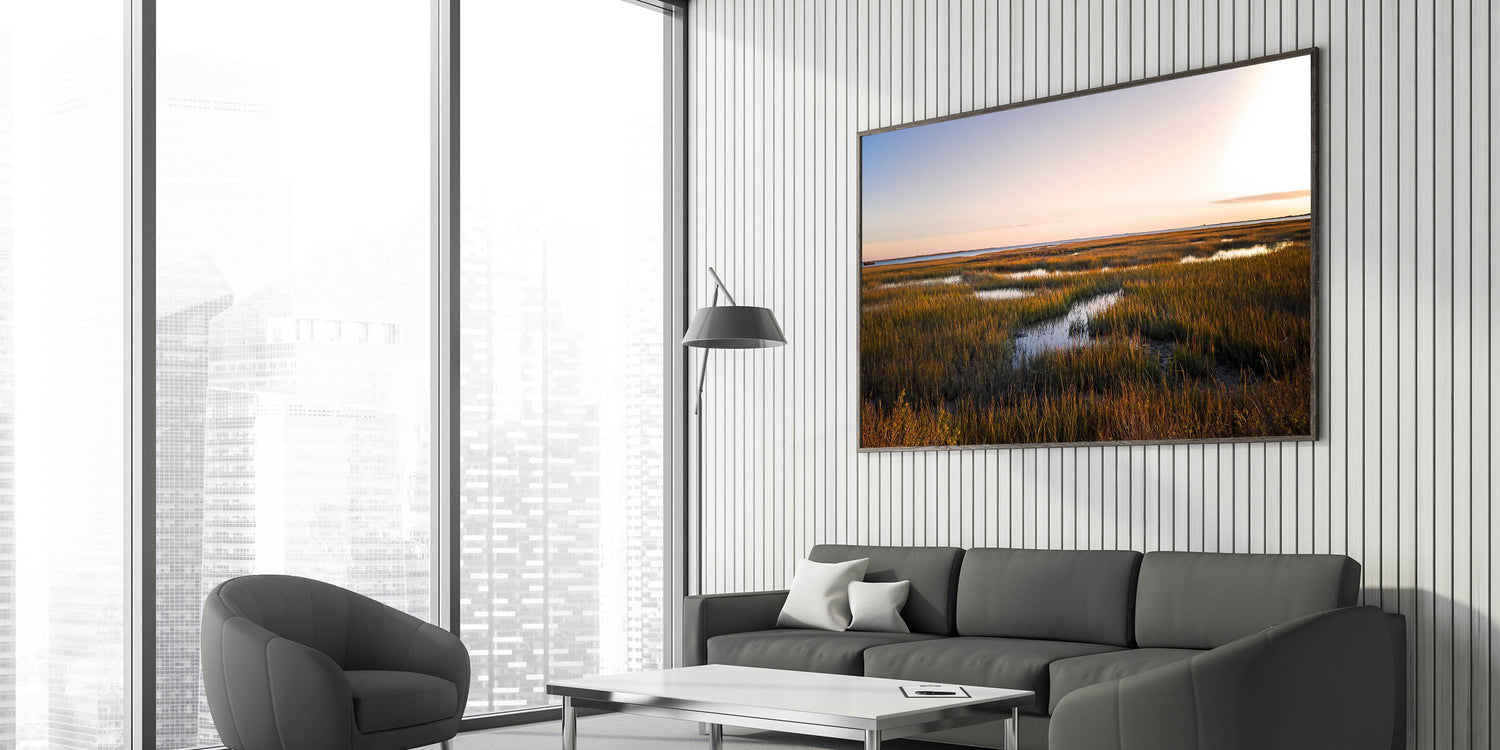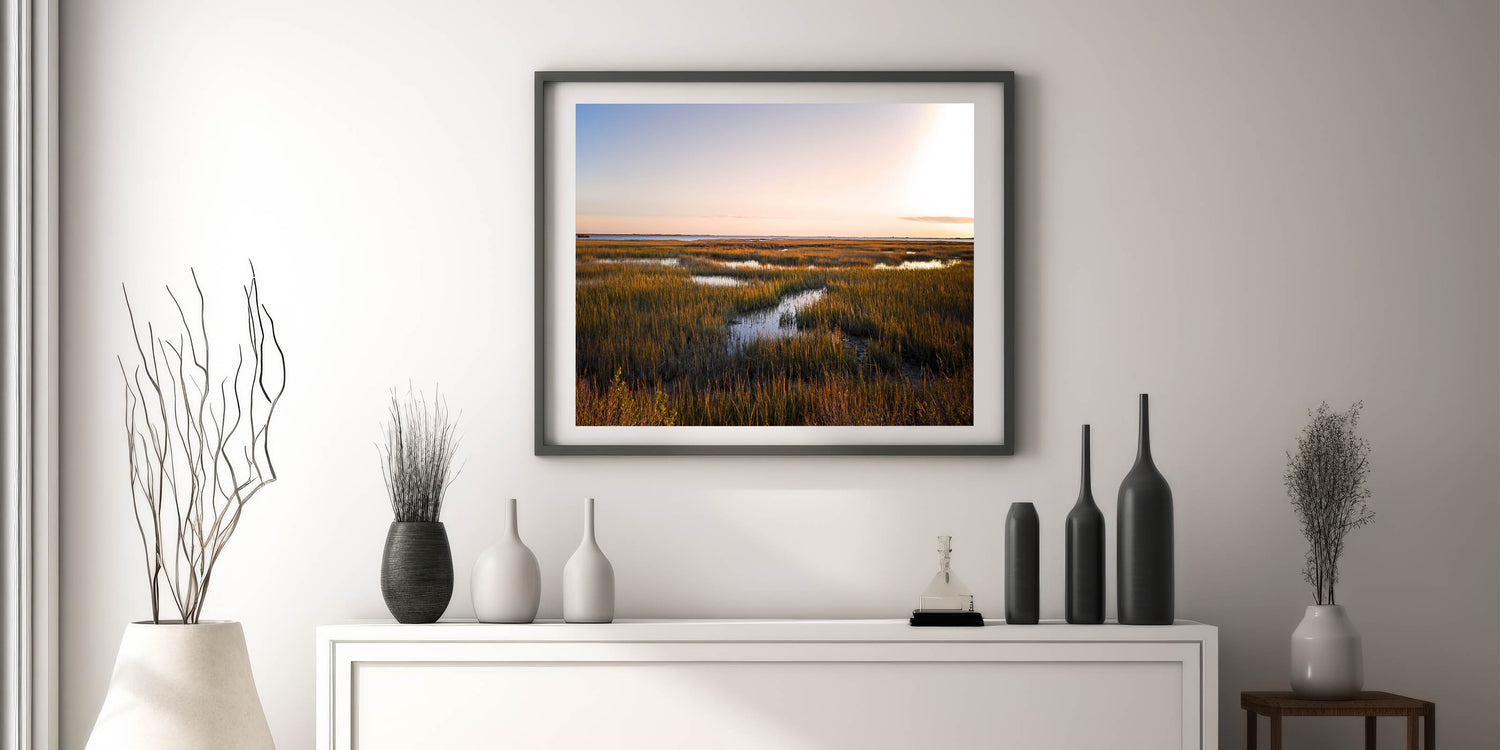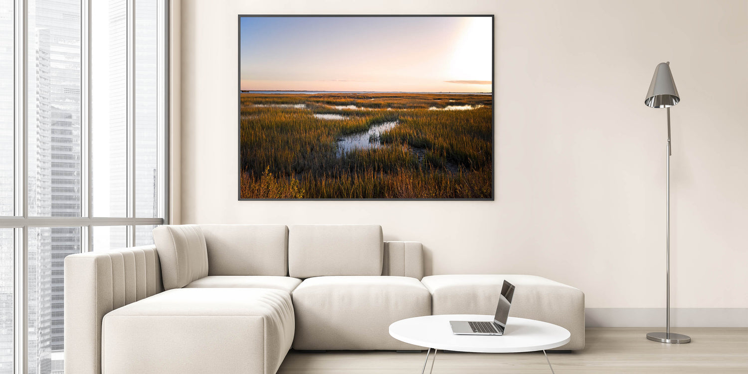 This golden marshland wall art is a beautiful addition to any home, offering a moment of calm and reflection with its serene sunset scene.