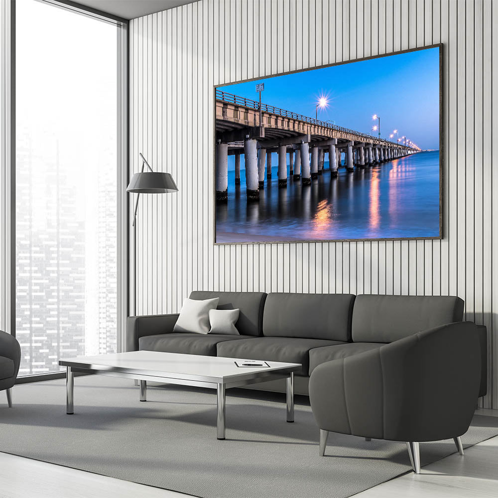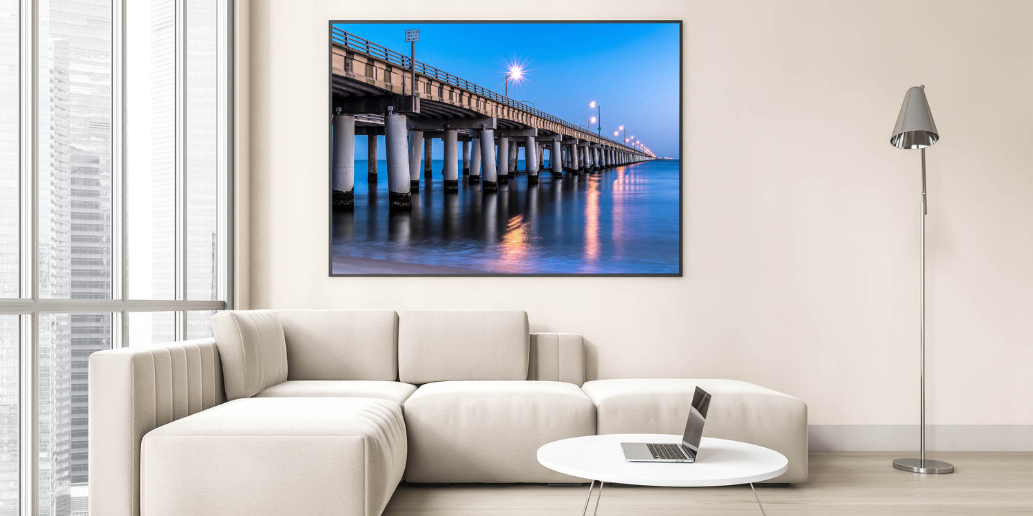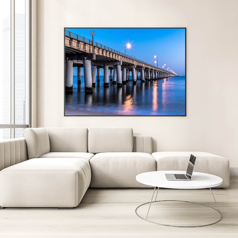 Transform your living space with this elegant Chesapeake Bay Canvas Print featuring a beautifully illuminated bridge at night, stretching over the calm waters of the bay. The soft reflections of the lights on the water combined with the deep blue tones of the evening sky create a tranquil and sophisticated atmosphere. This scene perfectly captures the essence of Maryland Coastal Scenery, making it a striking addition to any room.
