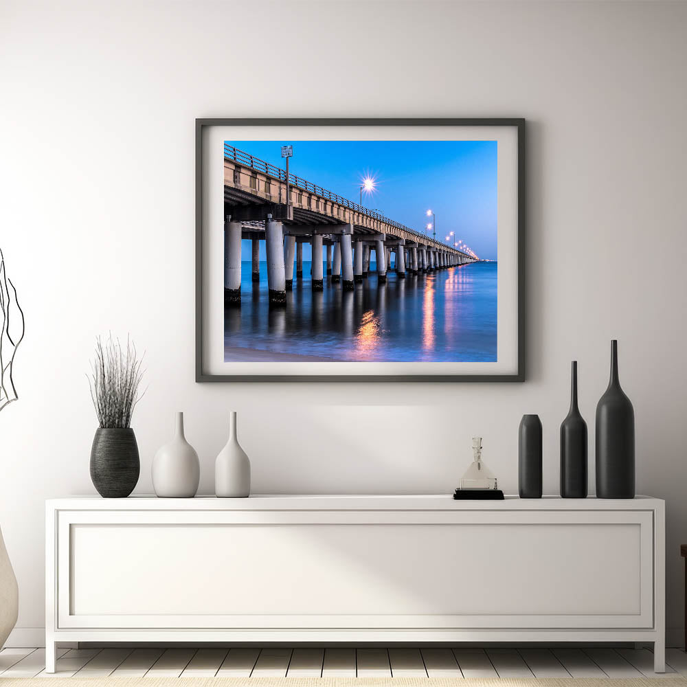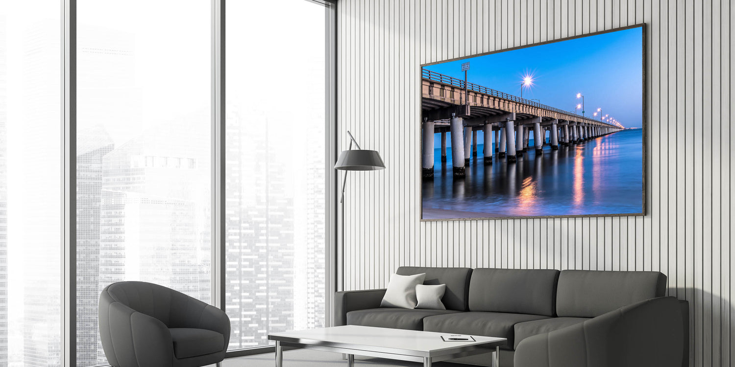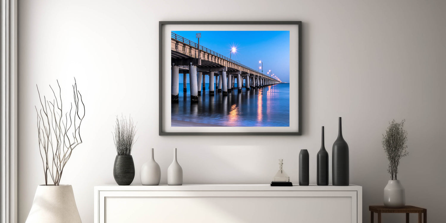 Transform your living space with this elegant Chesapeake Bay Canvas Print featuring a beautifully illuminated bridge at night, stretching over the calm waters of the bay. The soft reflections of the lights on the water combined with the deep blue tones of the evening sky create a tranquil and sophisticated atmosphere. This scene perfectly captures the essence of Maryland Coastal Scenery, making it a striking addition to any room.