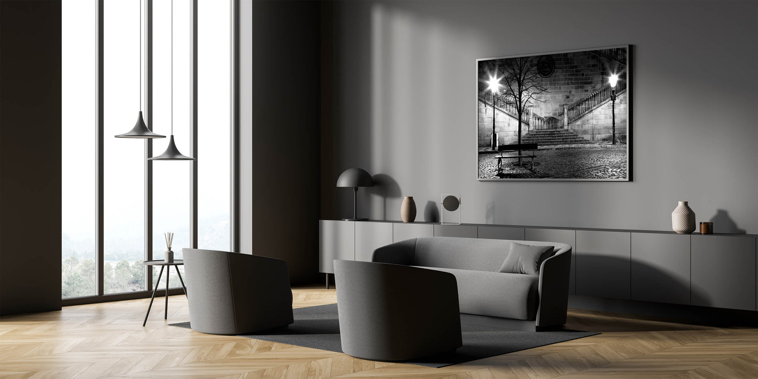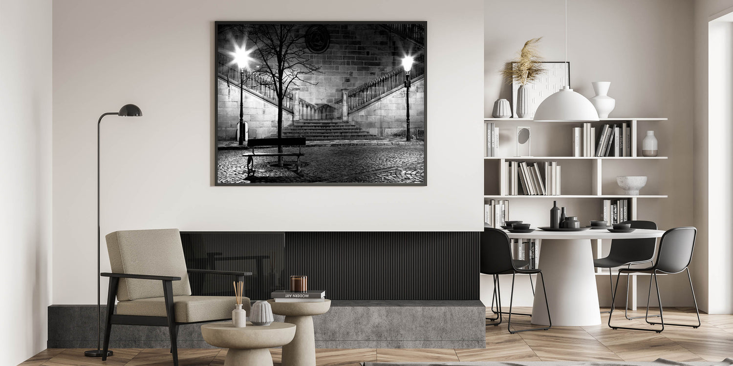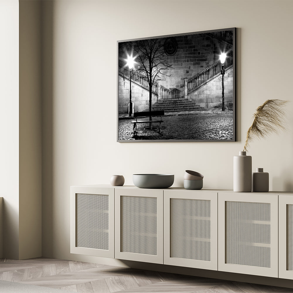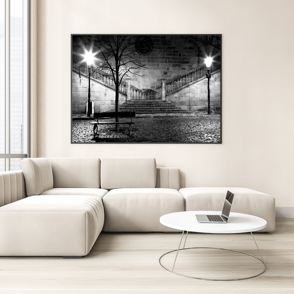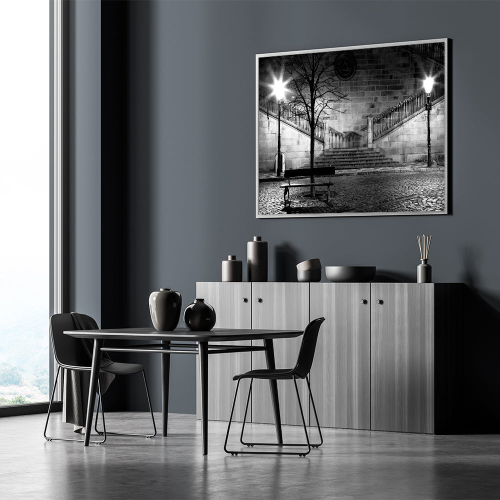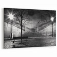 Add a touch of elegance and solitude to your space with this masonry wall art capturing a black-and-white night scene. This stunning brick and stone art piece evokes a sense of quiet stillness, featuring a beautifully lit streetlamp, empty bench, and dramatic stone staircase. The soft glow of the streetlights highlights the intricate details of the masonry canvas print, making it the perfect addition to a minimalist or modern setting.