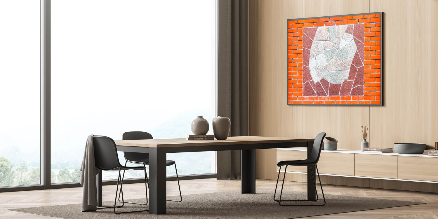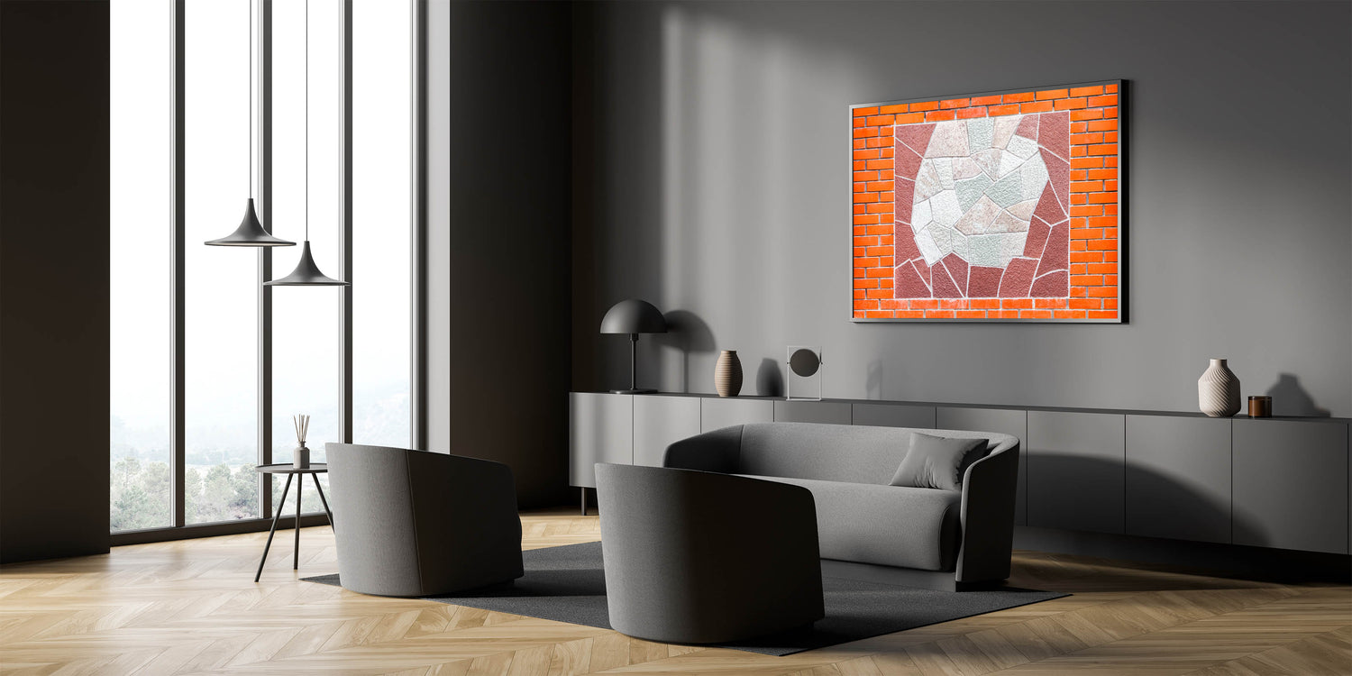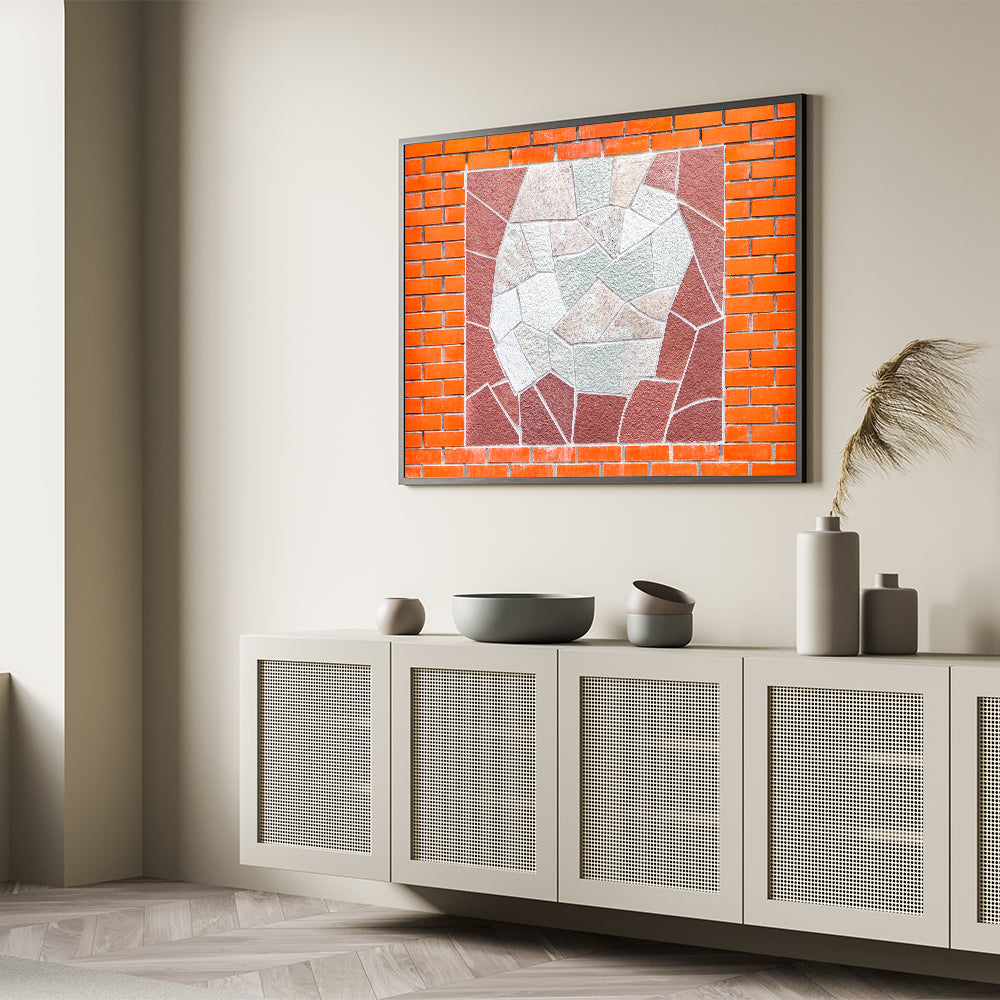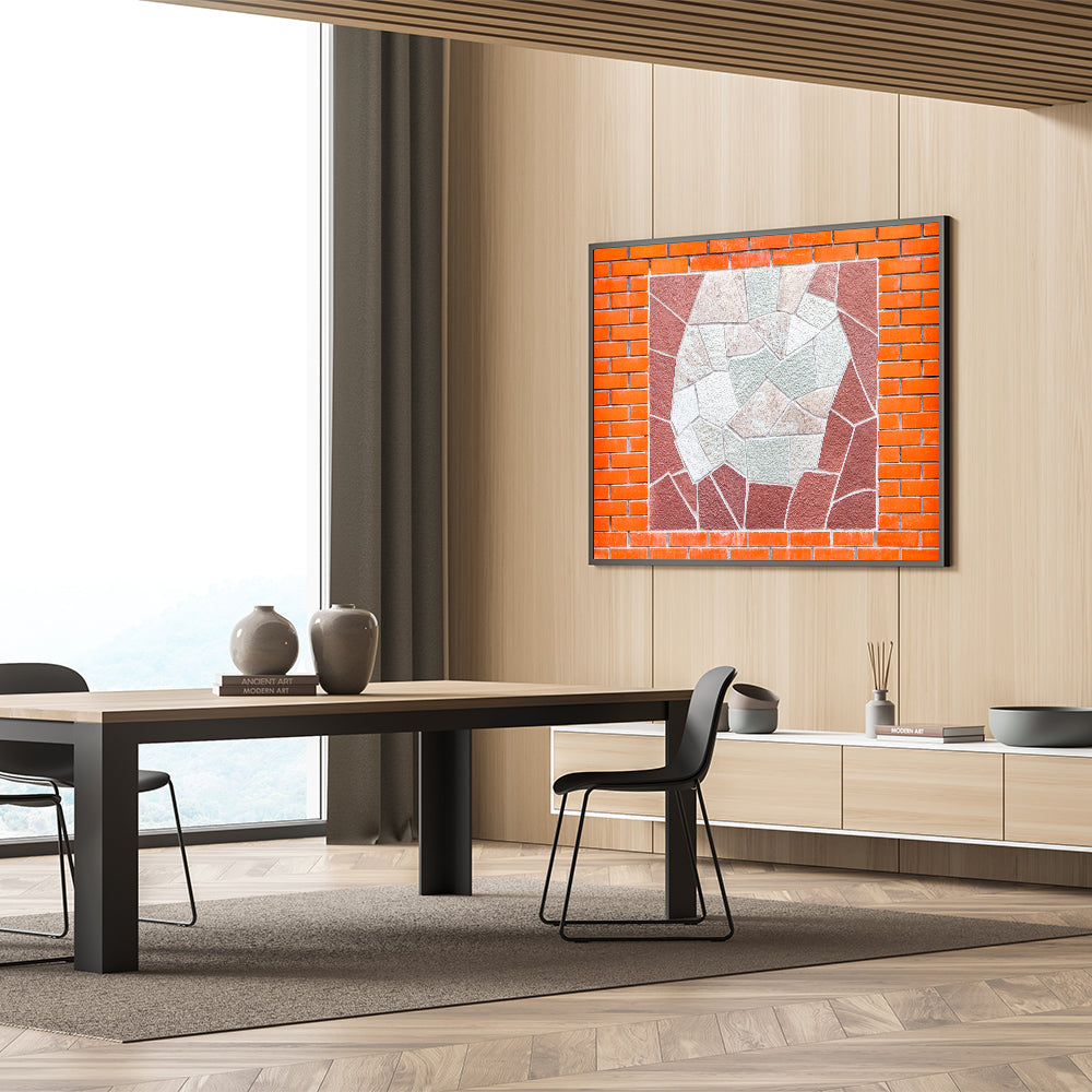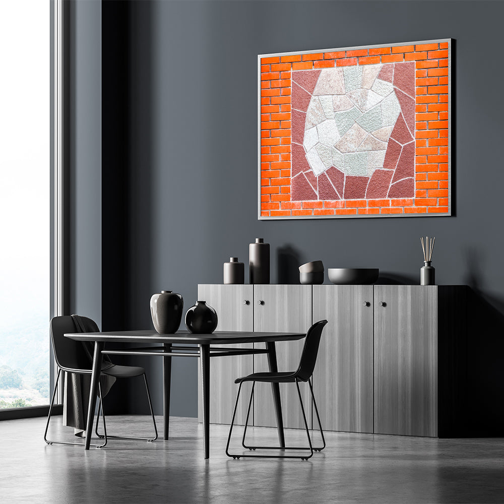 This vibrant masonry wall art features a colorful mosaic design set within a striking red brick wall, bringing together intricate stone patterns and bold architectural elements. The contrasting shapes and colors of the mosaic create a dynamic focal point that adds a touch of artistic flair to any space. Perfect for lovers of architectural wall art and modern design, this artwork is available in multiple formats, including canvas prints, framed prints, and acrylic glass, making it versatile for any decor style.