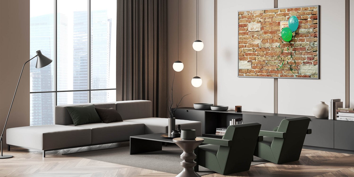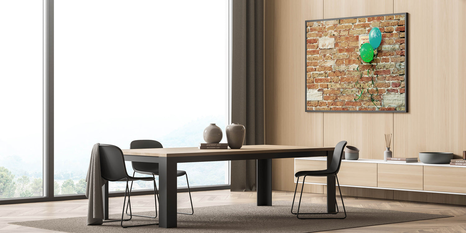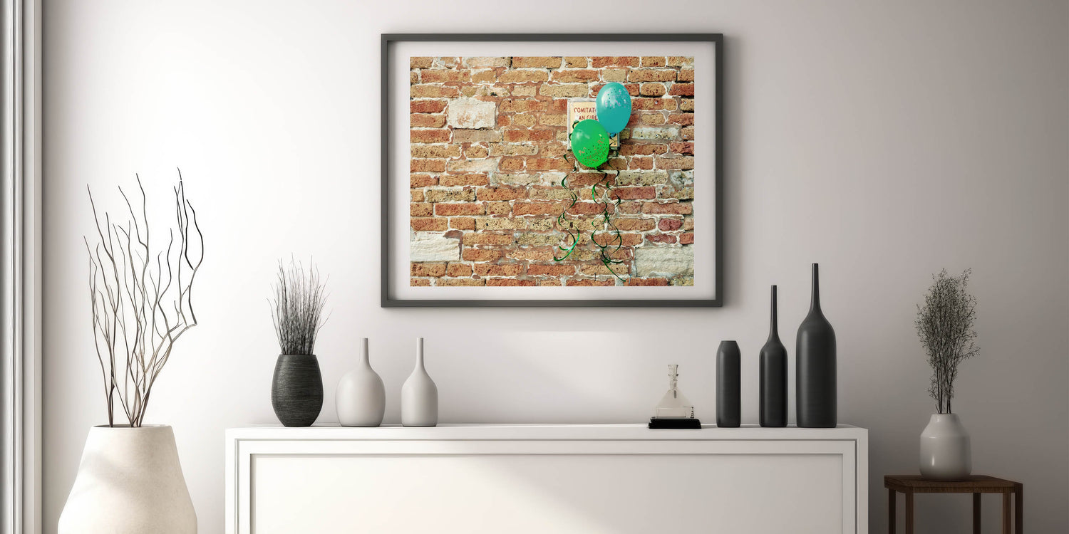 Transform your living space with this captivating Masonry Wall Art featuring a vibrant, rustic brick wall adorned with festive green and blue balloons. This unique blend of traditional architectural style and playful elements brings warmth and personality to any room. Perfect for those who appreciate Brick and Stone Art and want to infuse their decor with a touch of charm and whimsy.