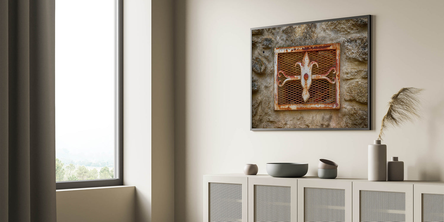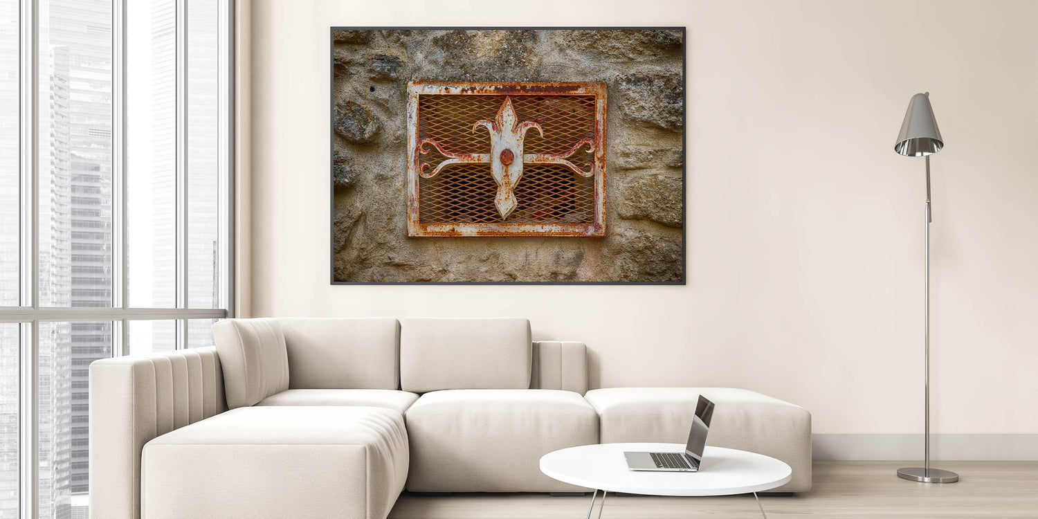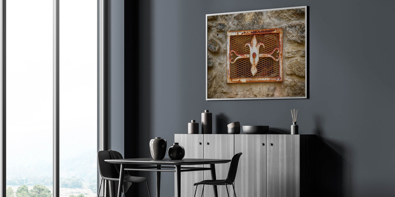 Add a touch of industrial charm to your space with this unique Masonry Wall Art, featuring a weathered metal grate over a textured stone wall. The rustic elegance of this piece showcases the beauty of aged materials and architectural details, perfect for fans of Brick and Stone Art or Rustic Masonry Decor. This design brings a sense of history and character to any room, making it a standout piece in your home or office.