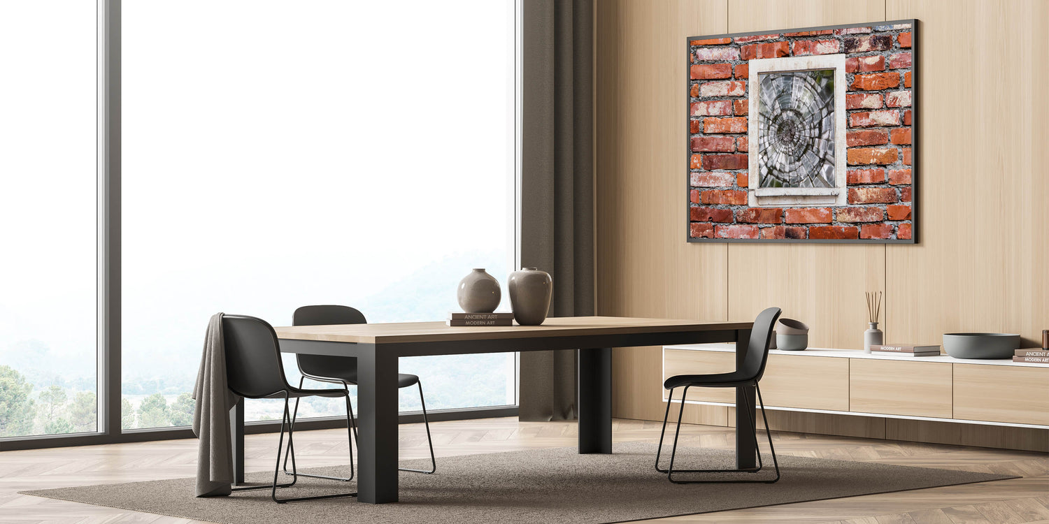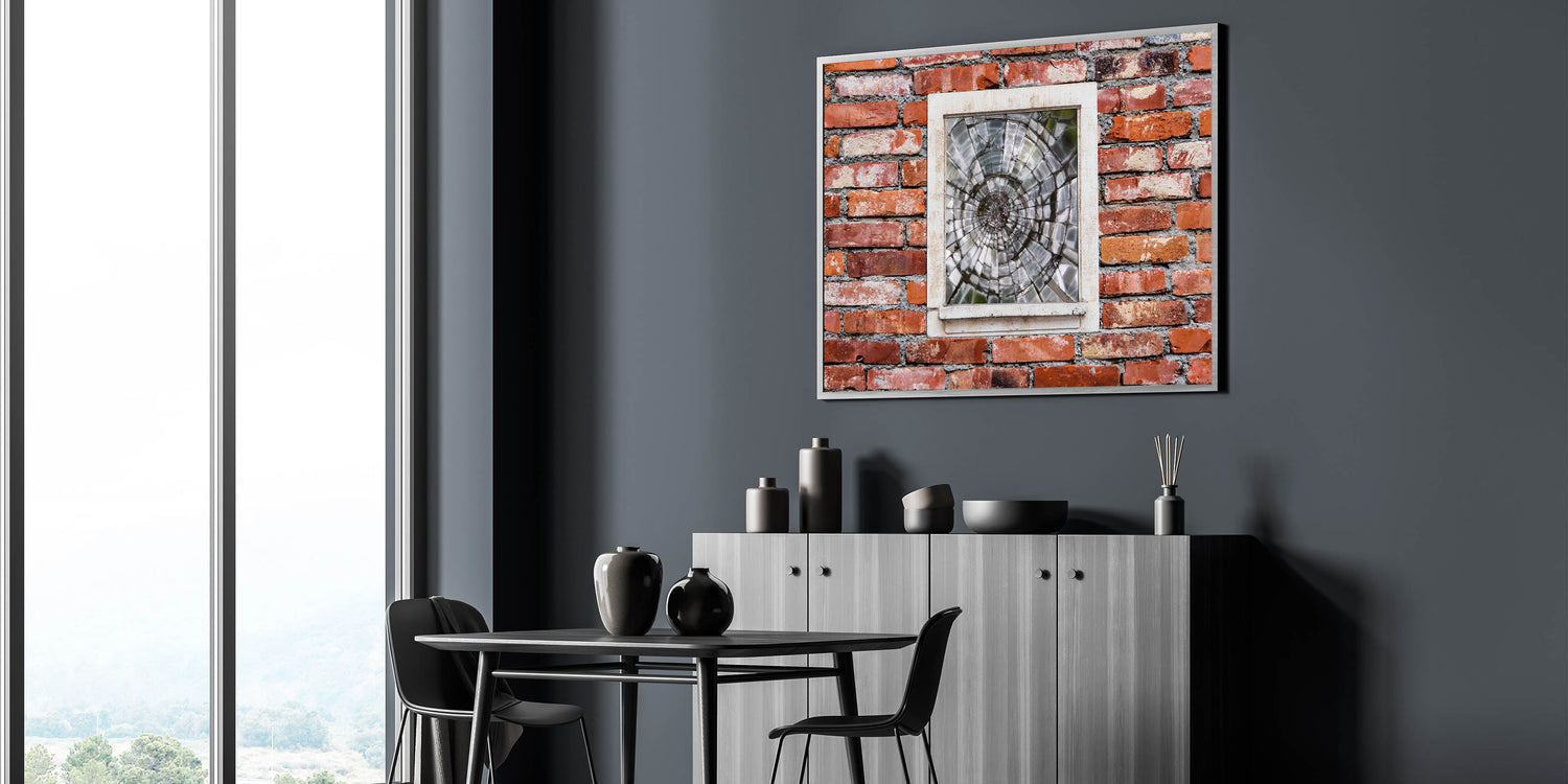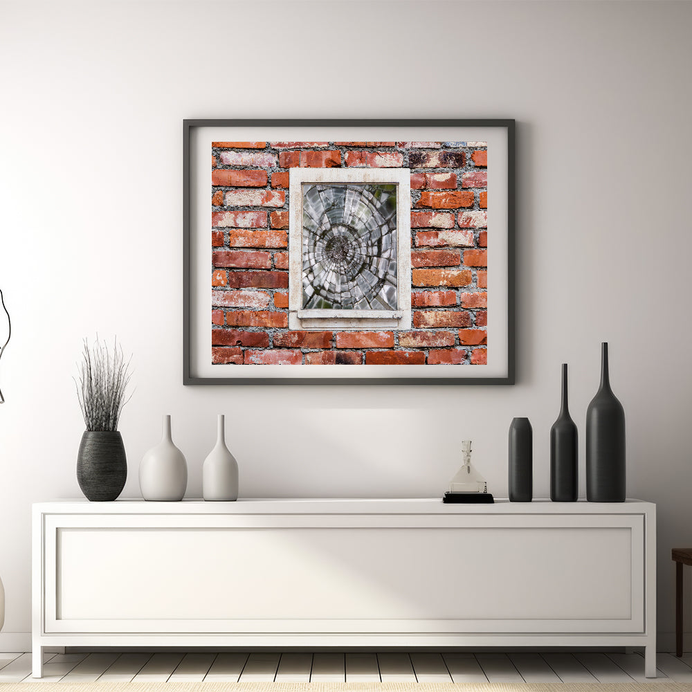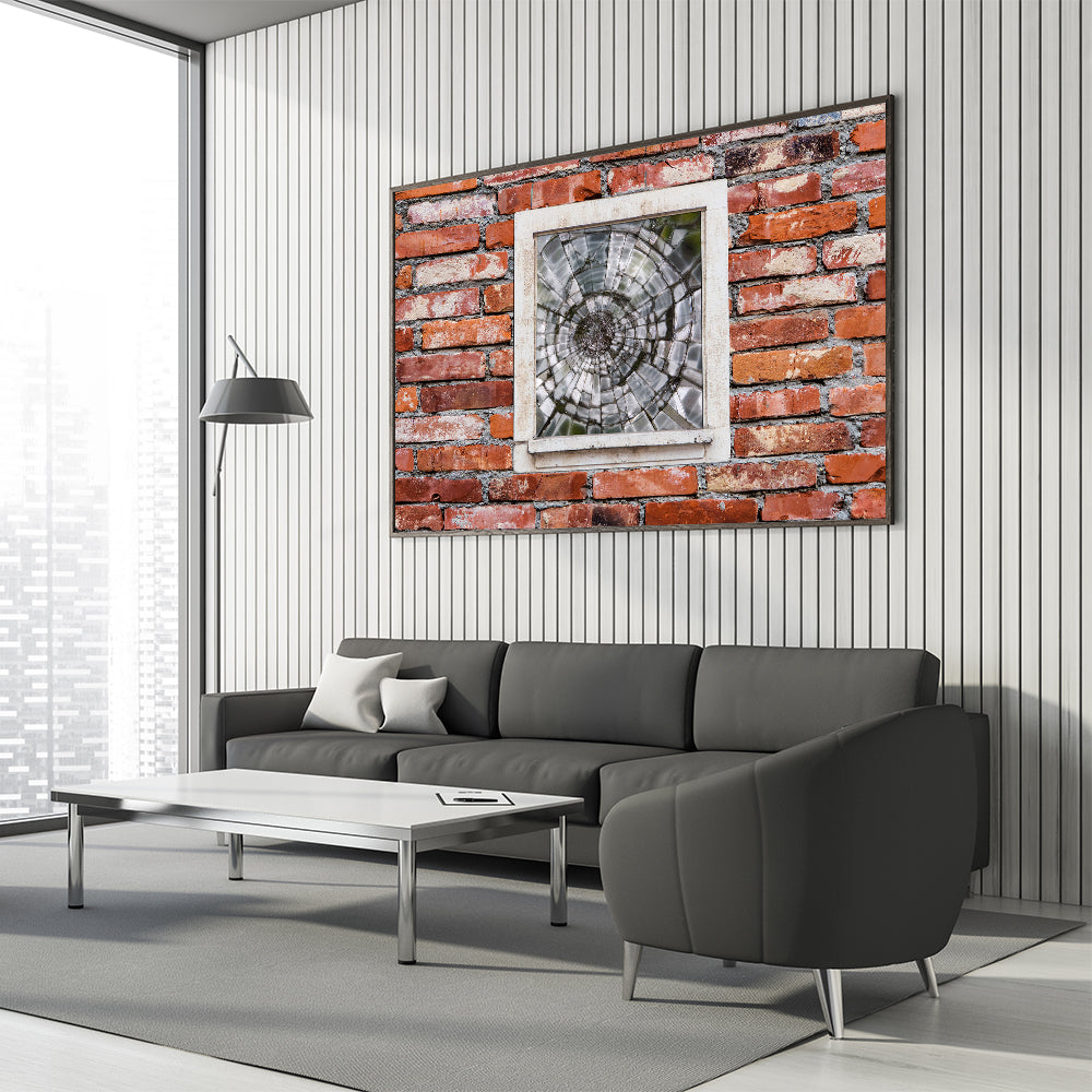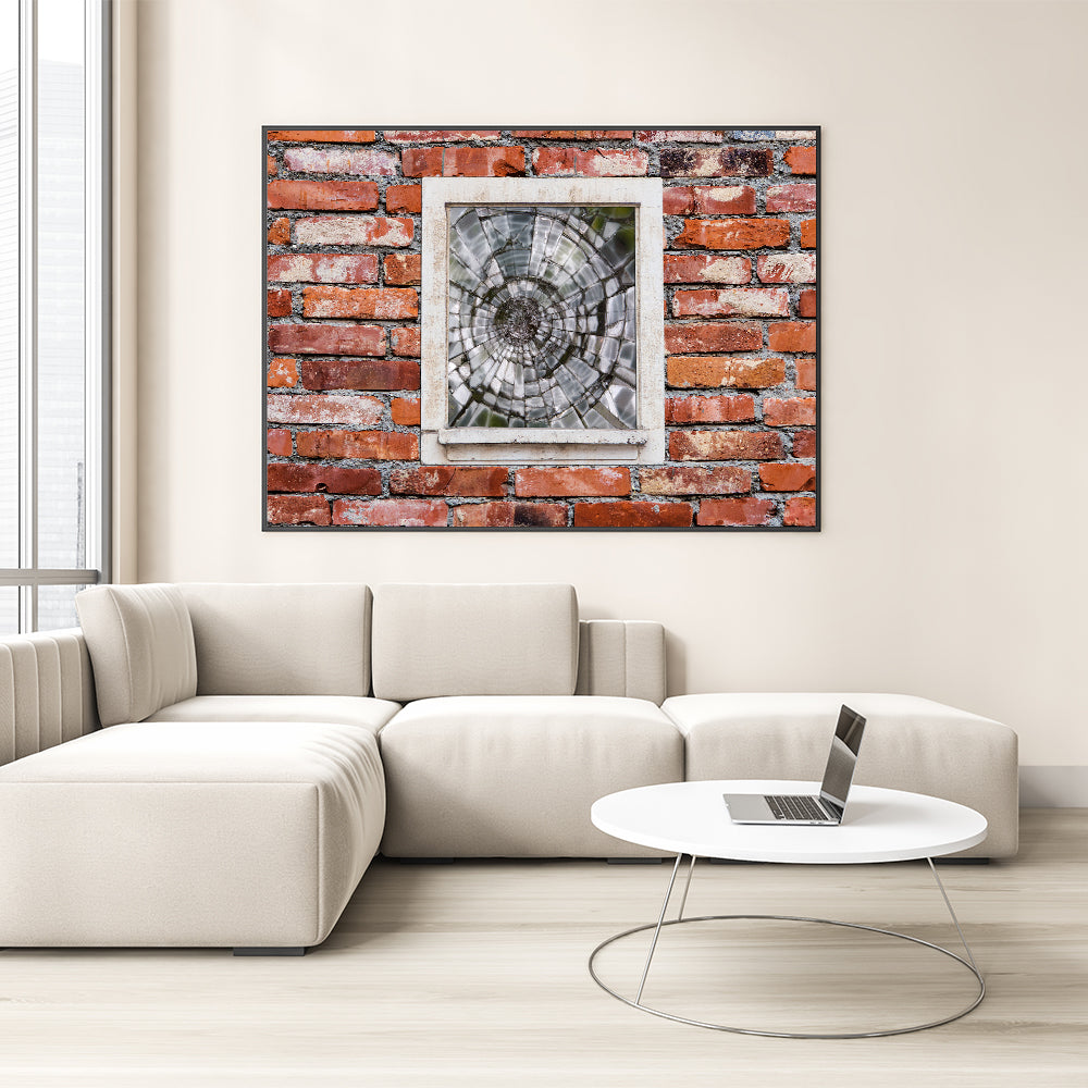 This striking piece of masonry wall art features a shattered glass window set into a rustic red brick wall, capturing a moment frozen in time. The contrast between the smooth, fractured glass and the rugged texture of the bricks creates a dynamic visual that speaks to both beauty and imperfection. Ideal for lovers of architectural wall art and urban decor, this artwork adds character and depth to any room. Available in various formats, including canvas prints, framed prints, and acrylic glass.