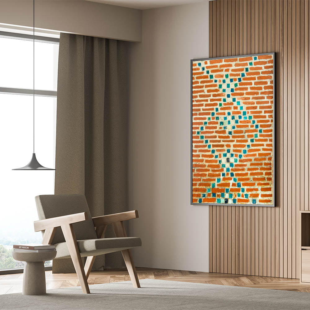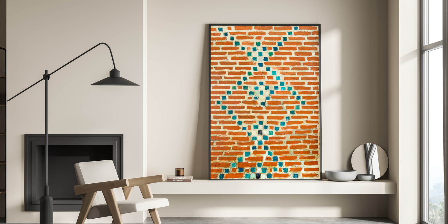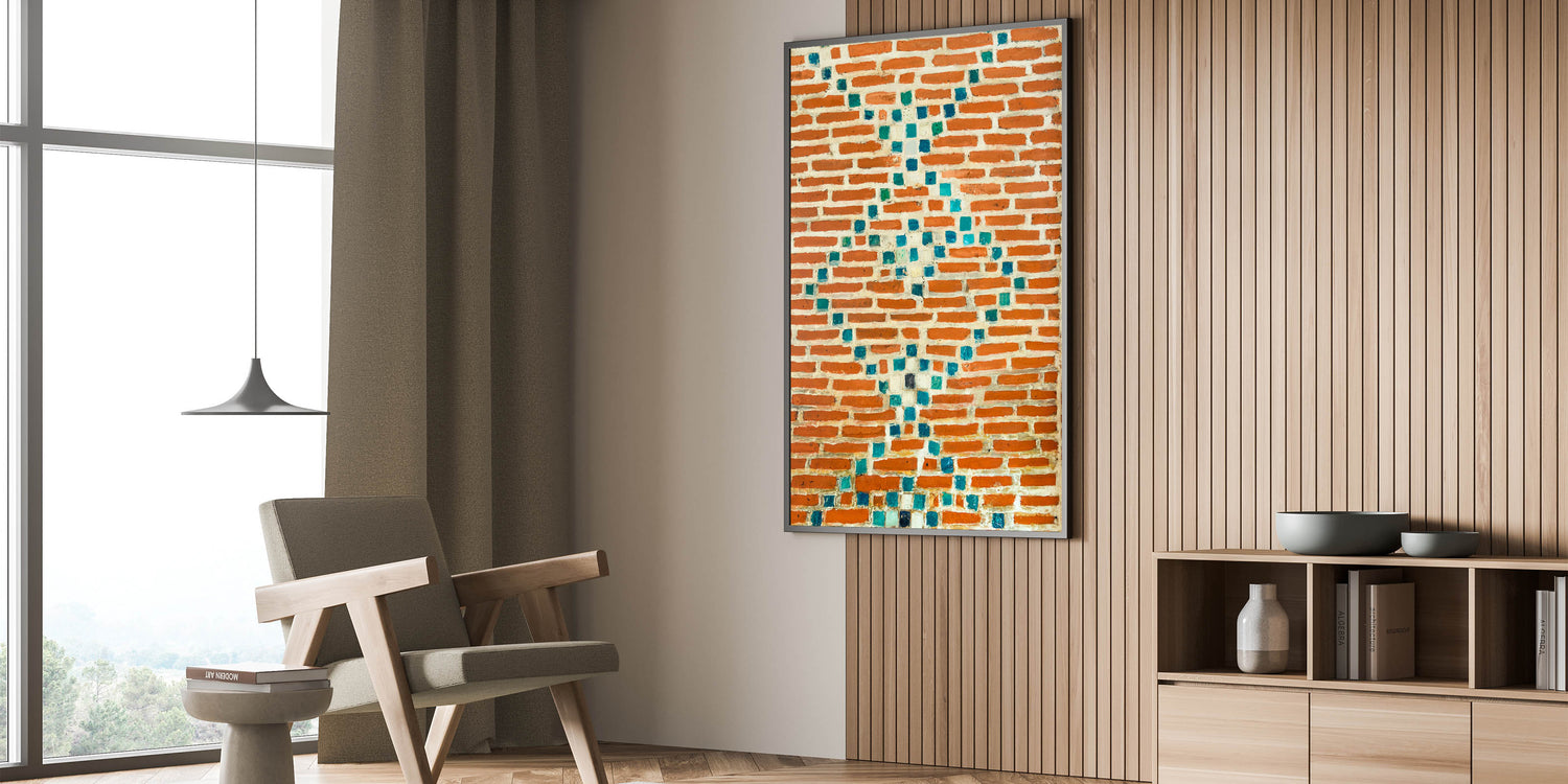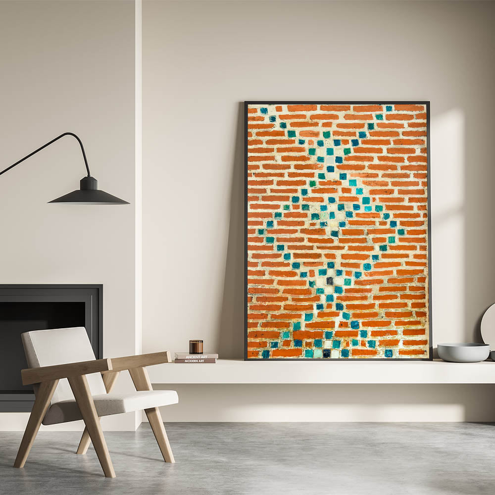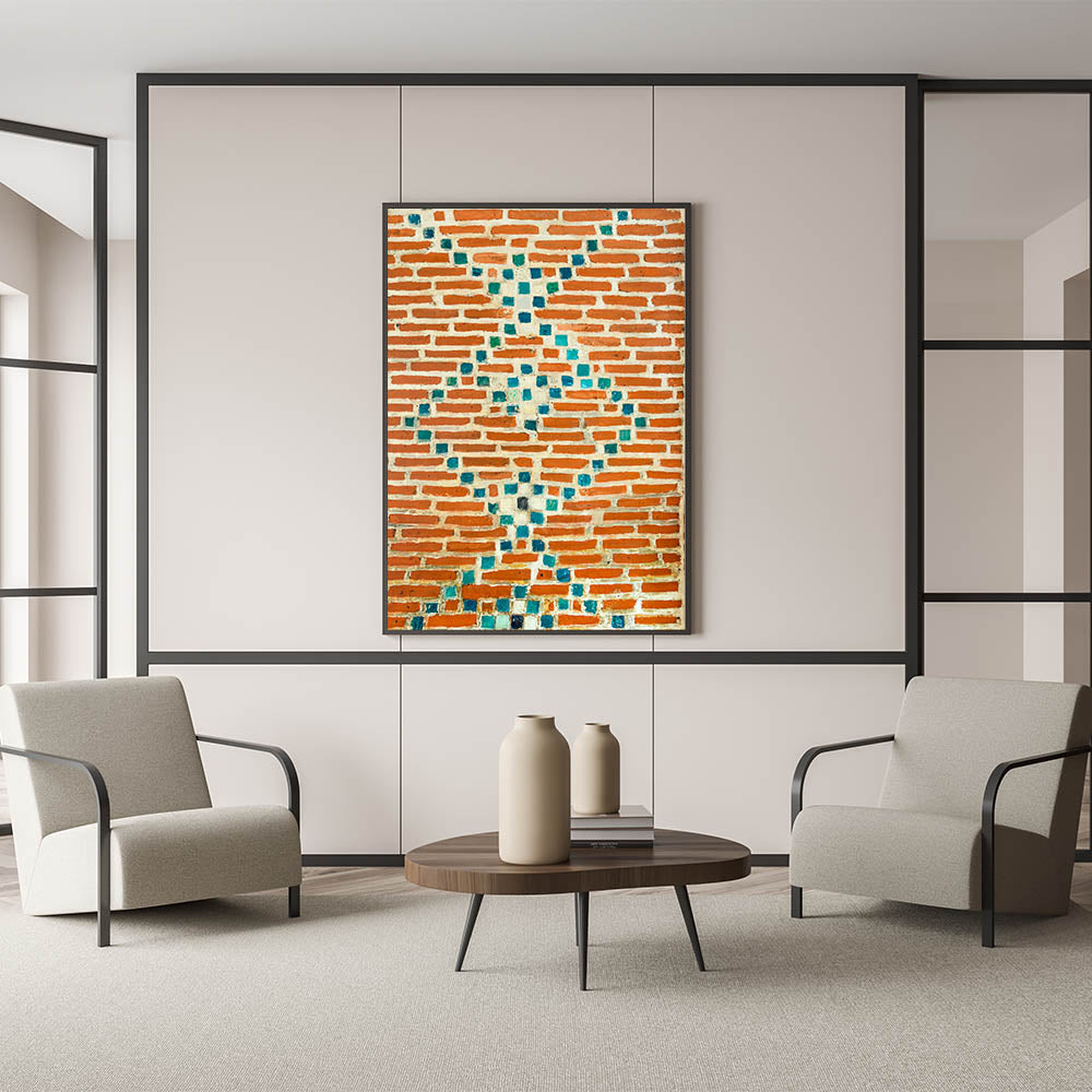 Infuse your space with color and texture using this masonry wall art featuring a stunning mosaic design. The contrast between the vibrant turquoise tiles and the red bricks brings a unique and artistic touch to any room. This brick and stone art is perfect for adding a pop of color to your walls while embracing the rustic charm of masonry canvas prints. Whether you're aiming for a modern or eclectic style, this masonry artwork for walls will fit right in.