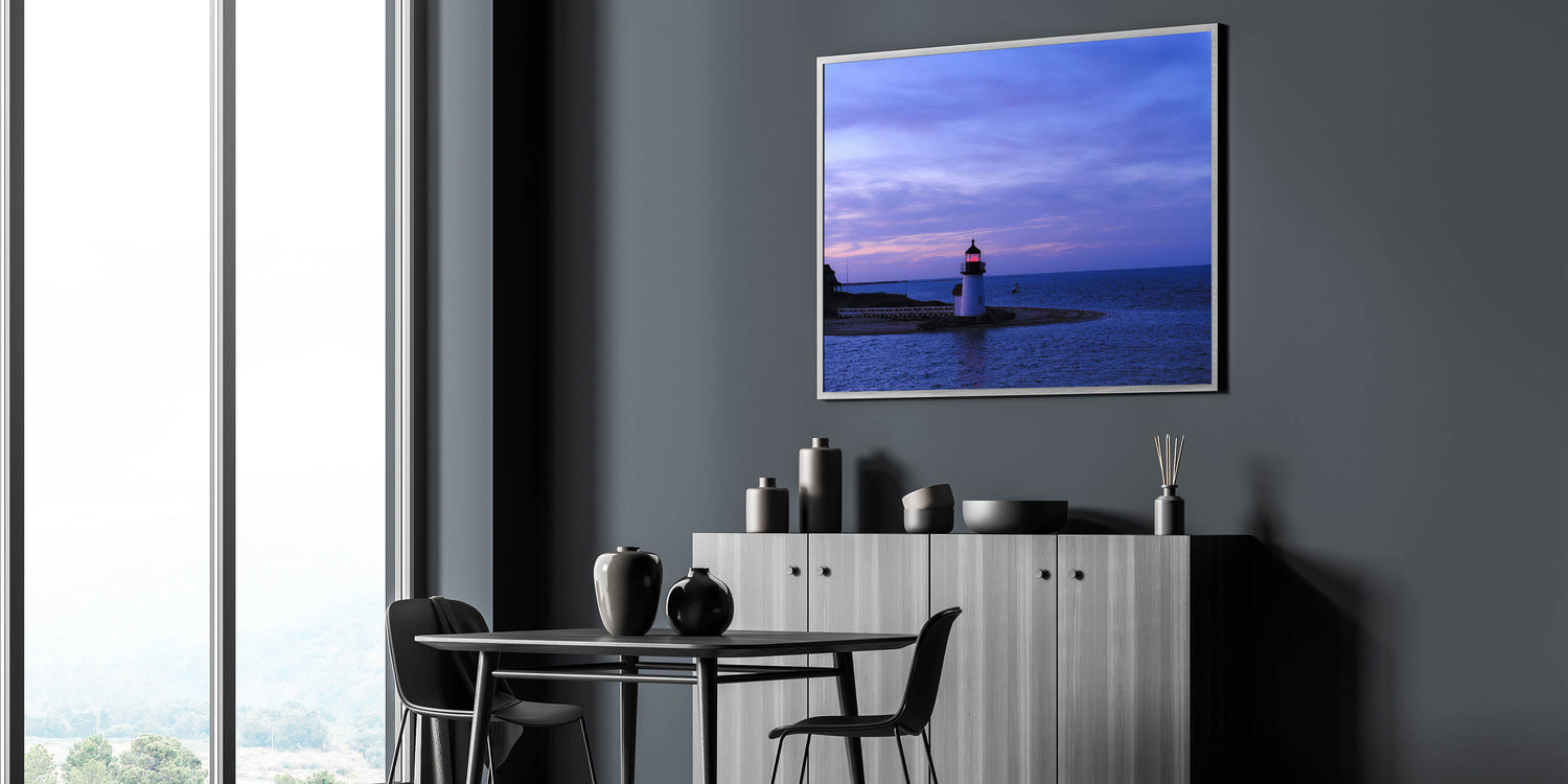 Capture the serene beauty of Nantucket with this stunning lighthouse scene at dusk, showcasing the island's iconic coastal landscape. This piece from our Nantucket Wall Art Collection highlights the charm and peaceful ambiance of Nantucket's shores, perfect for adding a touch of tranquility to your home decor.