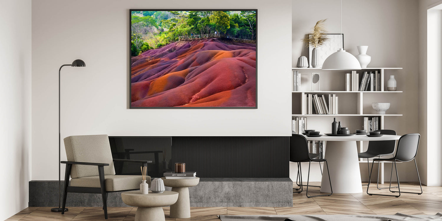Discover the natural wonder of the Seven-Colored Earth in Mauritius with this vibrant wall art. Showcasing the striking hues of red, purple, and orange, this piece captures the unique beauty of this iconic African landscape, making it a stunning addition to any room.