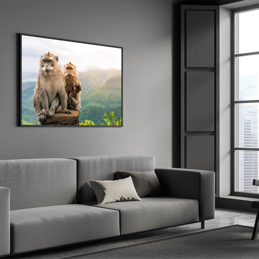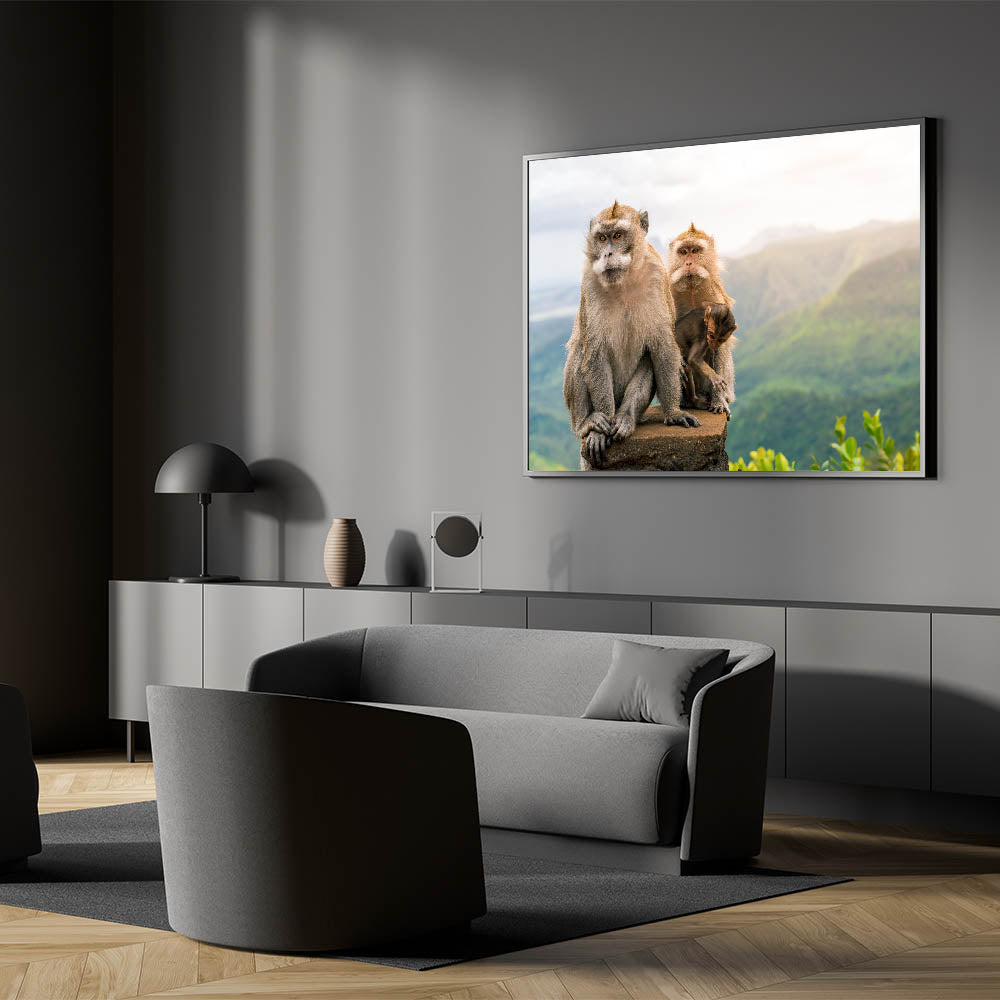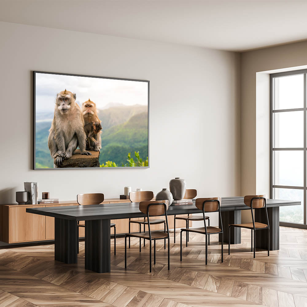 Experience the natural beauty of Mauritius with this captivating wall art, featuring a family of monkeys perched on a stone ledge with the island’s lush greenery in the background. This piece from our Mauritius Art Collection brings the vibrant wildlife of the African island into your home, showcasing a unique moment of tranquility and connection with nature.