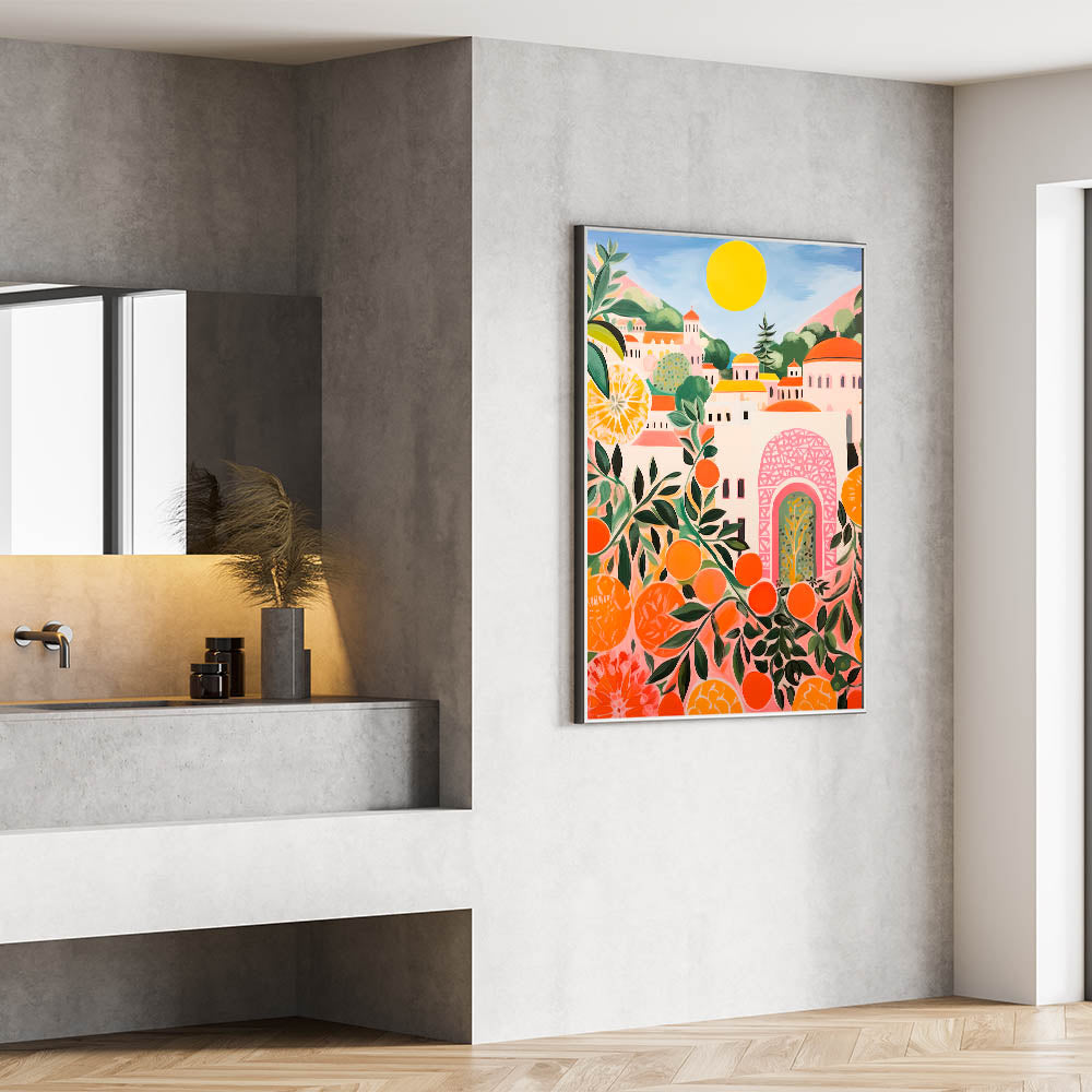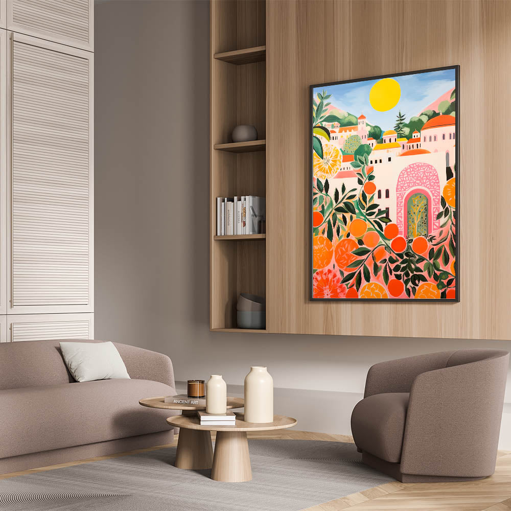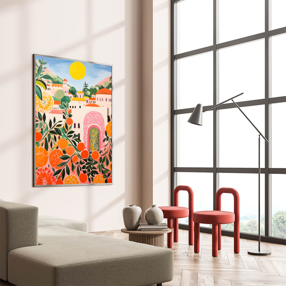 Immerse your space in the bold vibrancy of maximalism with this eclectic wall art piece, showcasing a stunning citrus grove against a backdrop of colorful architecture and a radiant sun. This design masterfully blends warm oranges, lush greens, and soft pinks to create a striking composition, perfect for anyone looking to make a statement in their home decor.