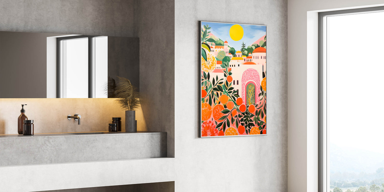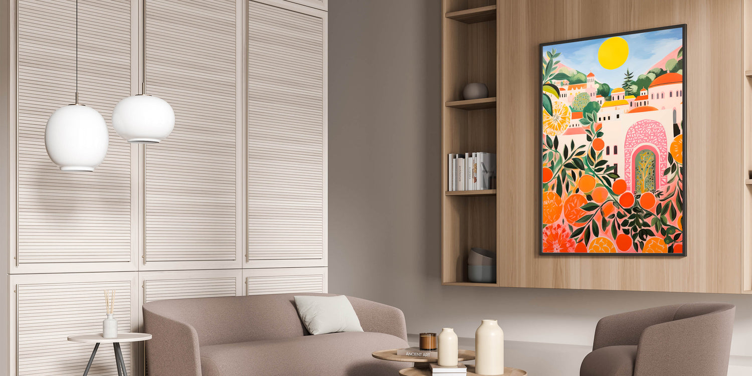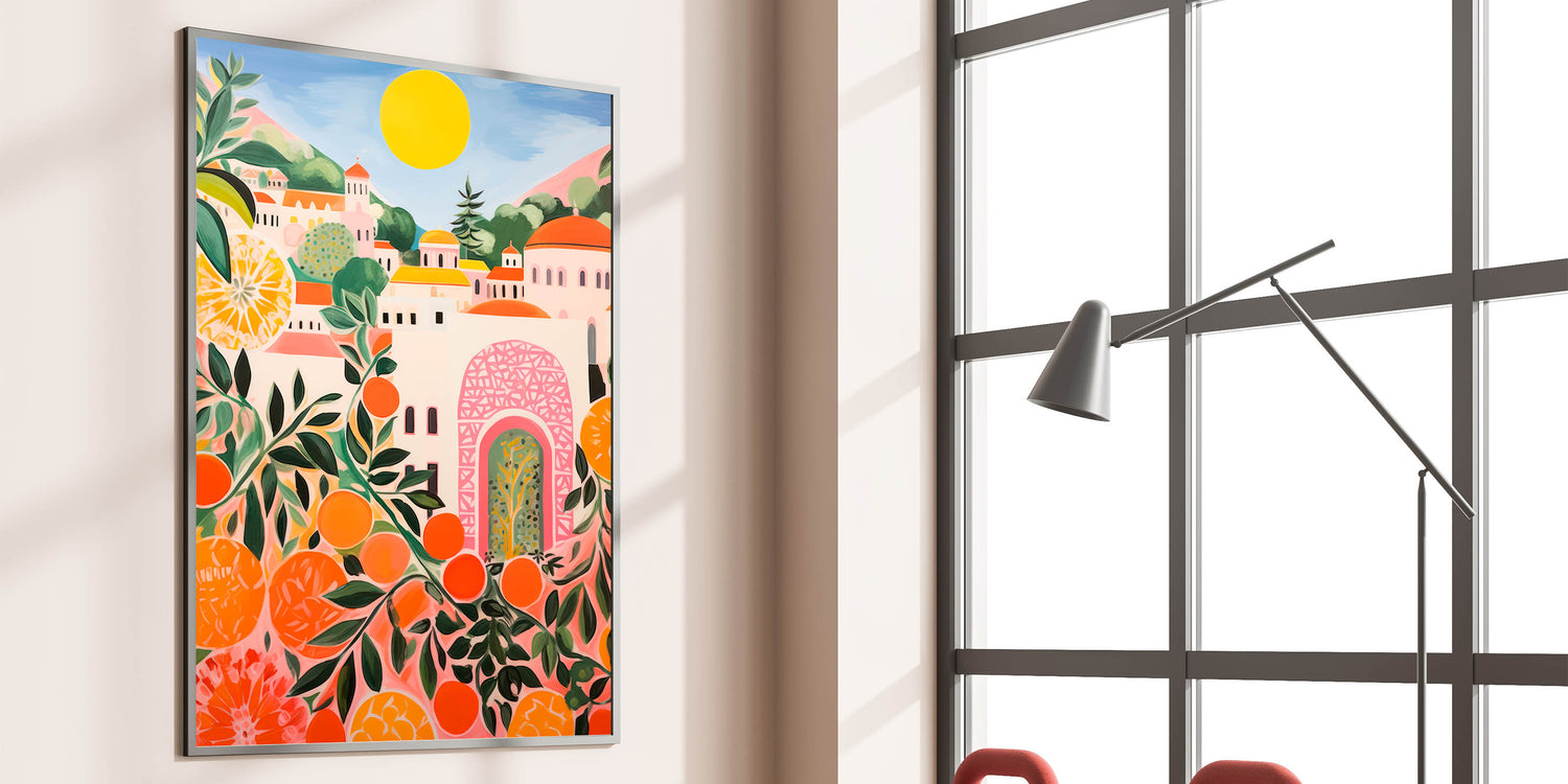 Immerse your space in the bold vibrancy of maximalism with this eclectic wall art piece, showcasing a stunning citrus grove against a backdrop of colorful architecture and a radiant sun. This design masterfully blends warm oranges, lush greens, and soft pinks to create a striking composition, perfect for anyone looking to make a statement in their home decor.