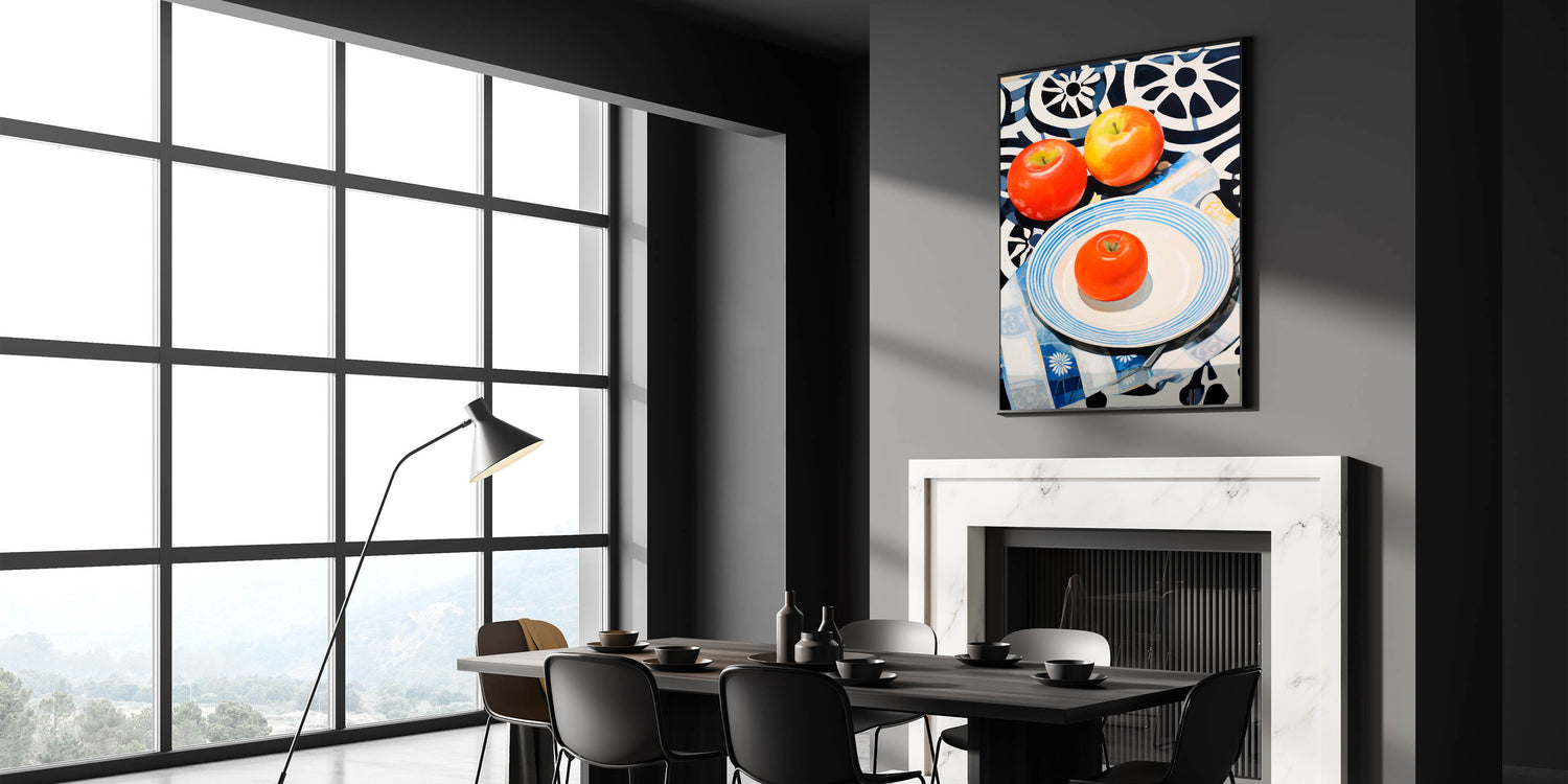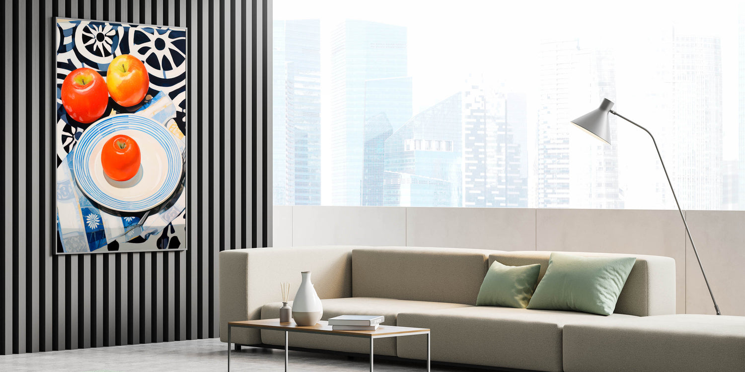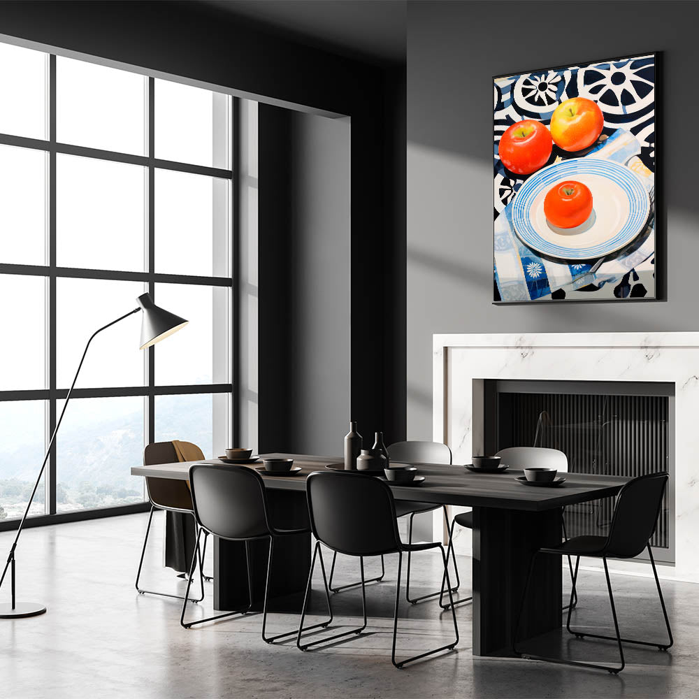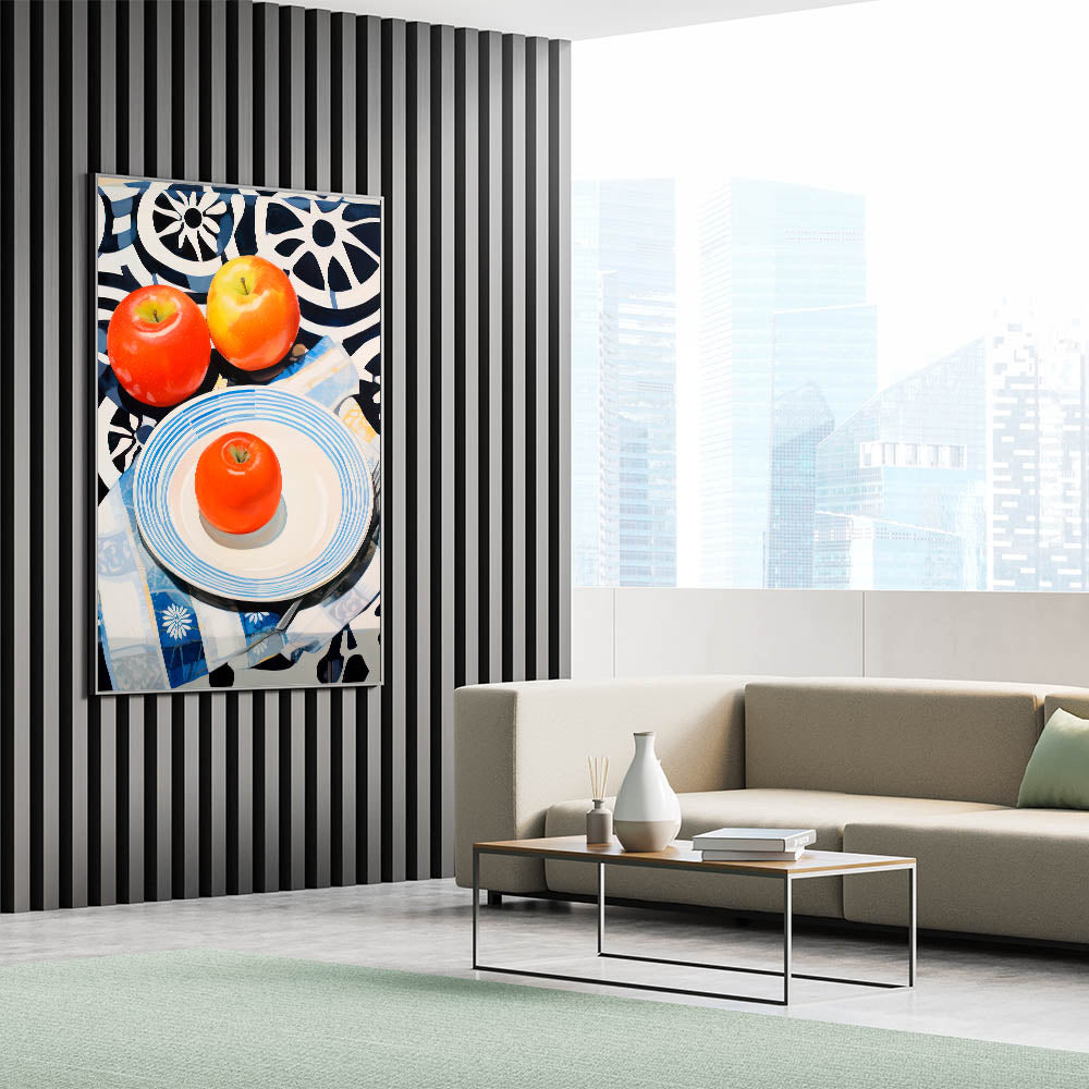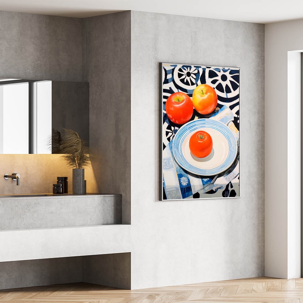 Elevate your home decor with this vibrant maximalist wall art, featuring a bold still life composition of vivid apples on a striking patterned background. The rich red apples stand out against a blue-and-white striped plate and ornate black-and-white patterns, creating a dynamic and eye-catching focal point. This eclectic design blends everyday objects with artistic flair, perfect for those who appreciate bold, vibrant home decor.