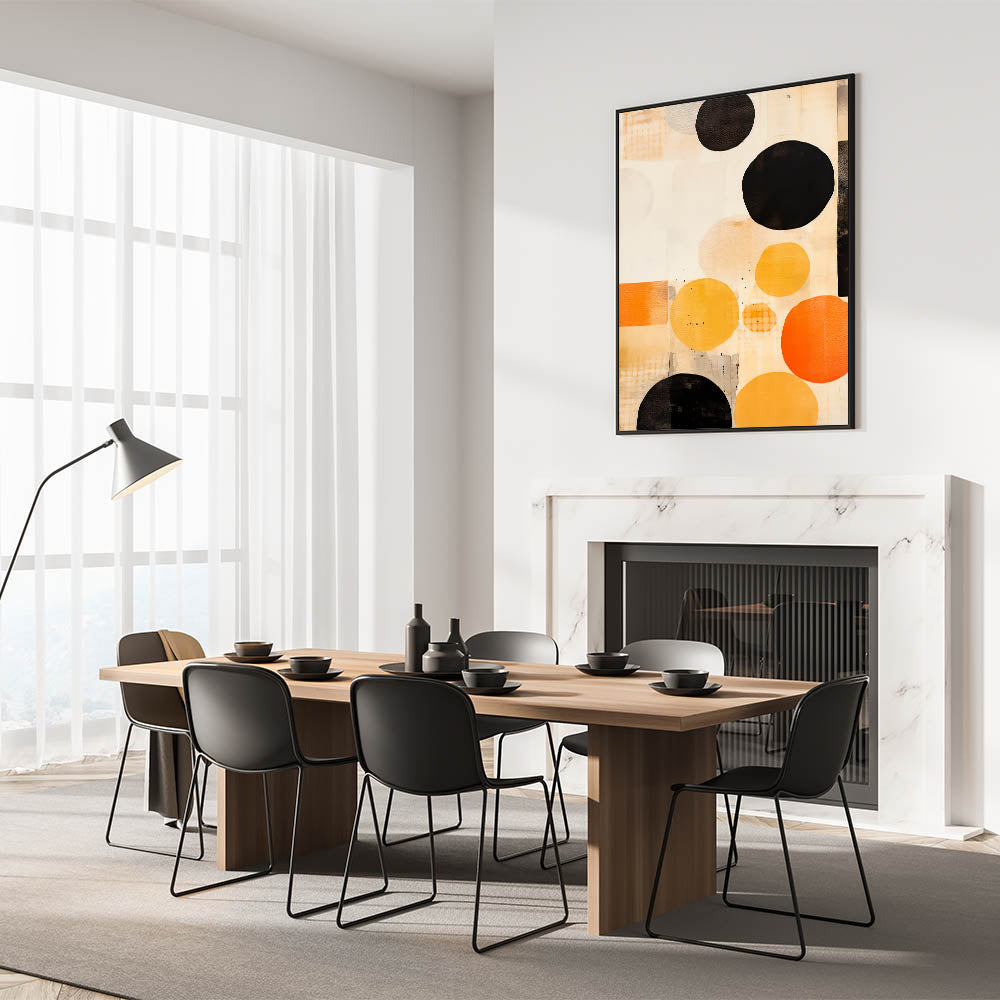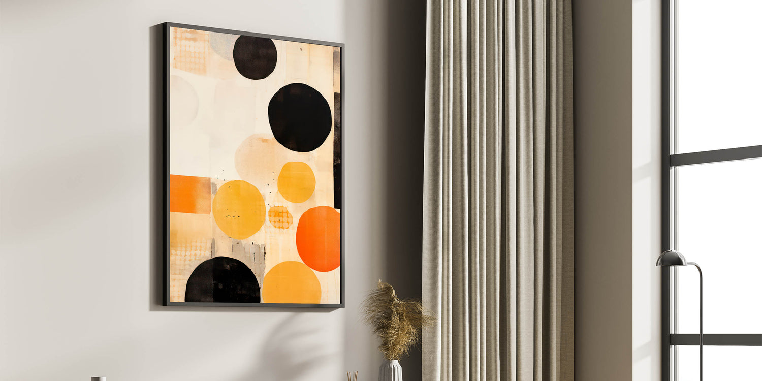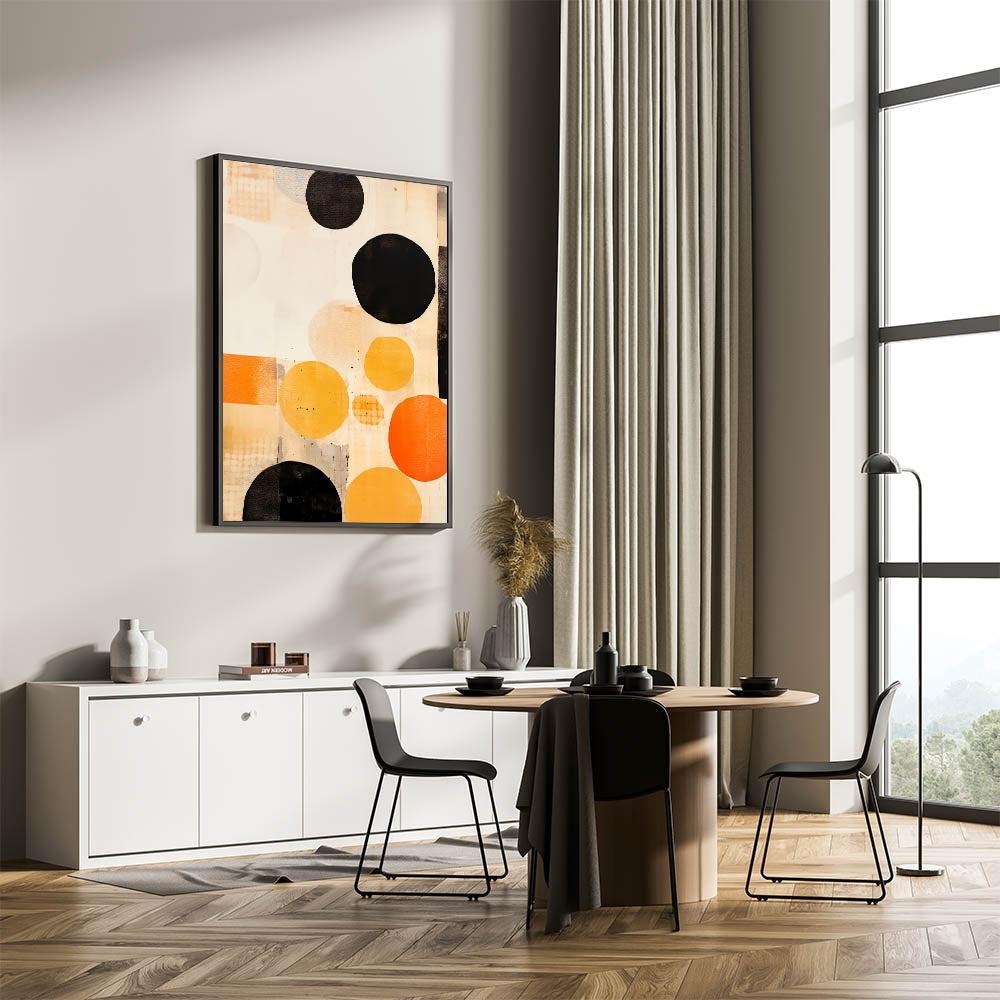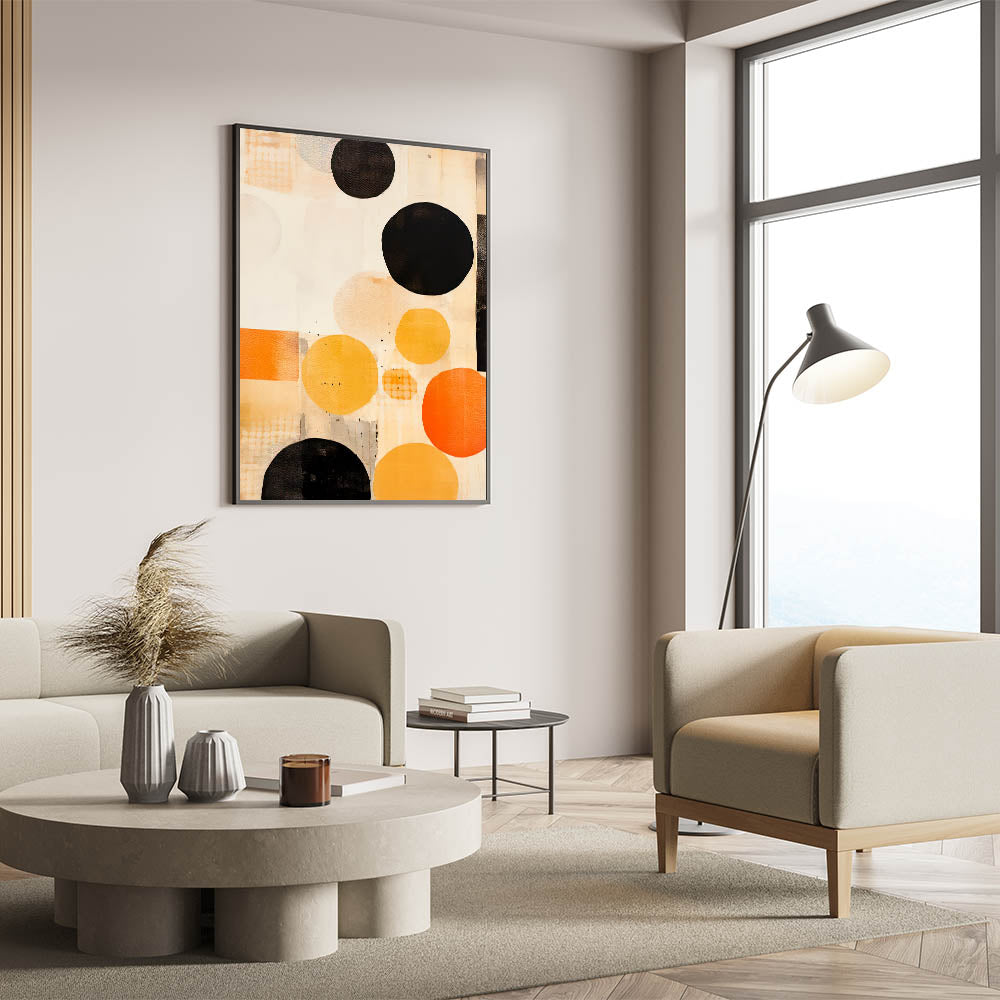 Bring a touch of bold maximalism to your space with this stunning abstract wall art. Featuring a dynamic arrangement of circular forms in warm shades of yellow and orange contrasted with deep black, this piece exudes a sense of modern eclecticism. The interplay of colors and shapes adds depth and movement, making it perfect for enhancing the character of any room. Whether you're decorating a living room, bedroom, or office, this unique design will serve as a striking focal point.