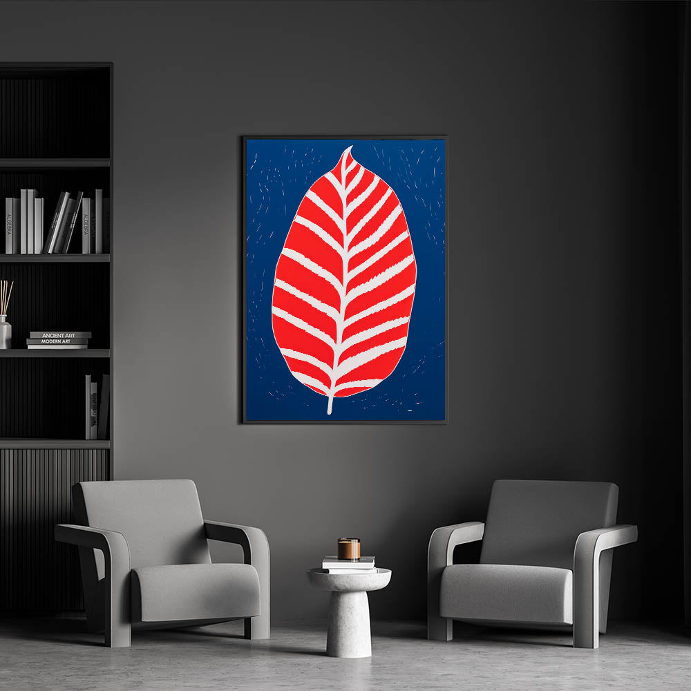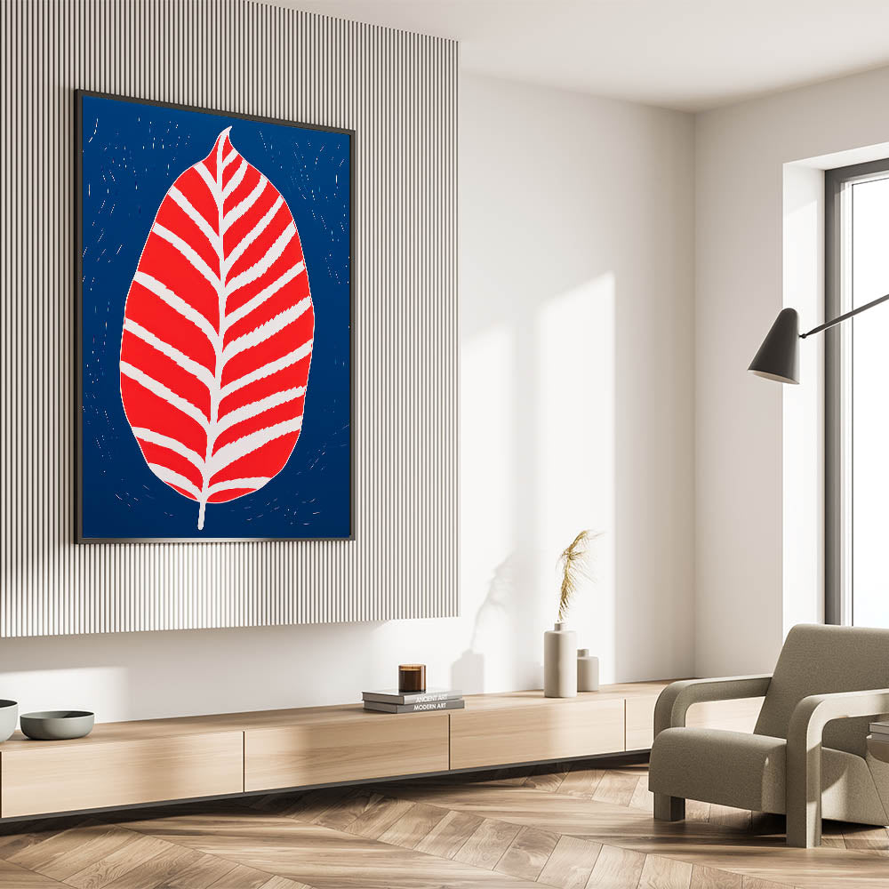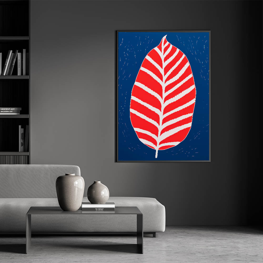 Add a striking touch of maximalism to your decor with this bold abstract wall art, featuring a vivid red leaf set against a deep blue background. The artwork's minimalist design is complemented by its vibrant color palette, creating a captivating visual that brings a contemporary flair to any space. Perfect for eclectic and modern interiors, this piece is an eye-catching statement wall art that adds energy and personality to living rooms, bedrooms, or creative studios. The simple yet dynamic design showcases the beauty of color contrast, making it a versatile choice for enhancing your decor.