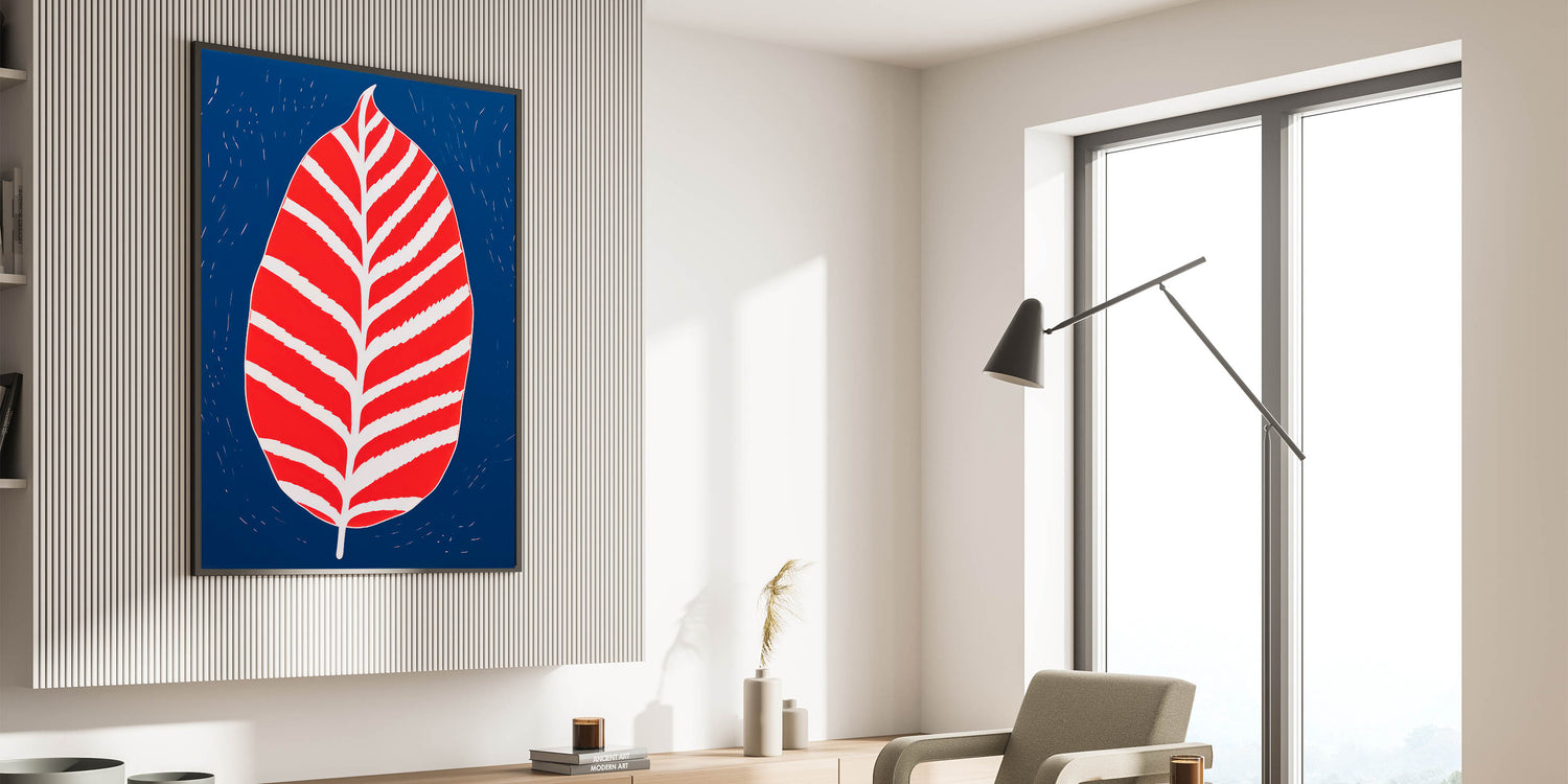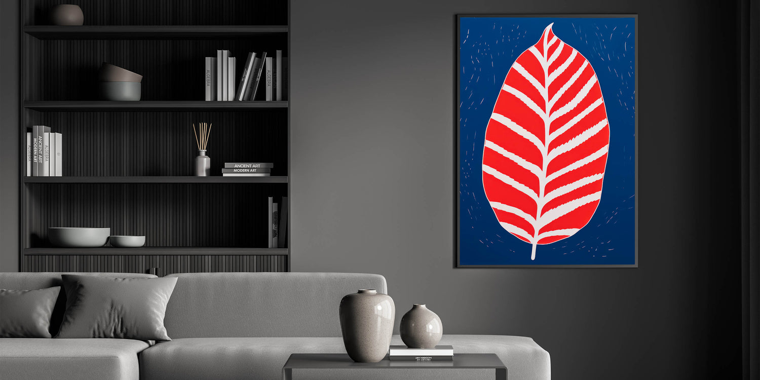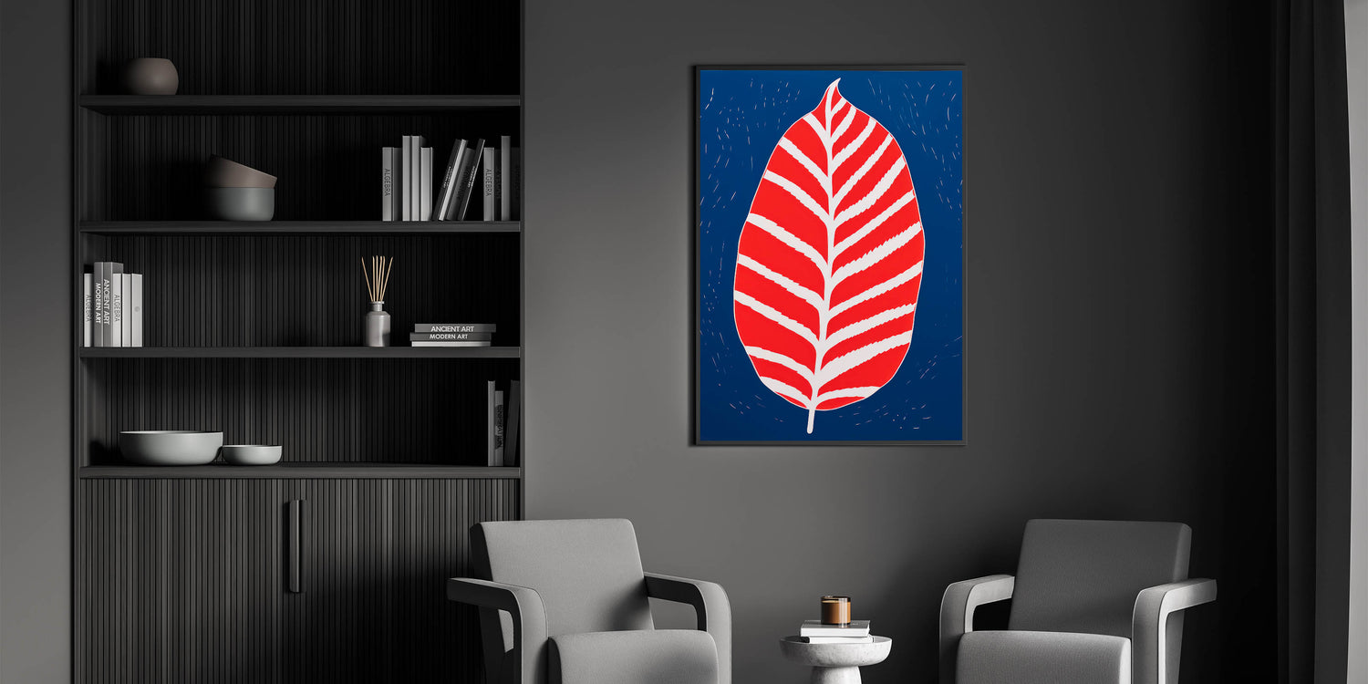 Add a striking touch of maximalism to your decor with this bold abstract wall art, featuring a vivid red leaf set against a deep blue background. The artwork's minimalist design is complemented by its vibrant color palette, creating a captivating visual that brings a contemporary flair to any space. Perfect for eclectic and modern interiors, this piece is an eye-catching statement wall art that adds energy and personality to living rooms, bedrooms, or creative studios. The simple yet dynamic design showcases the beauty of color contrast, making it a versatile choice for enhancing your decor.