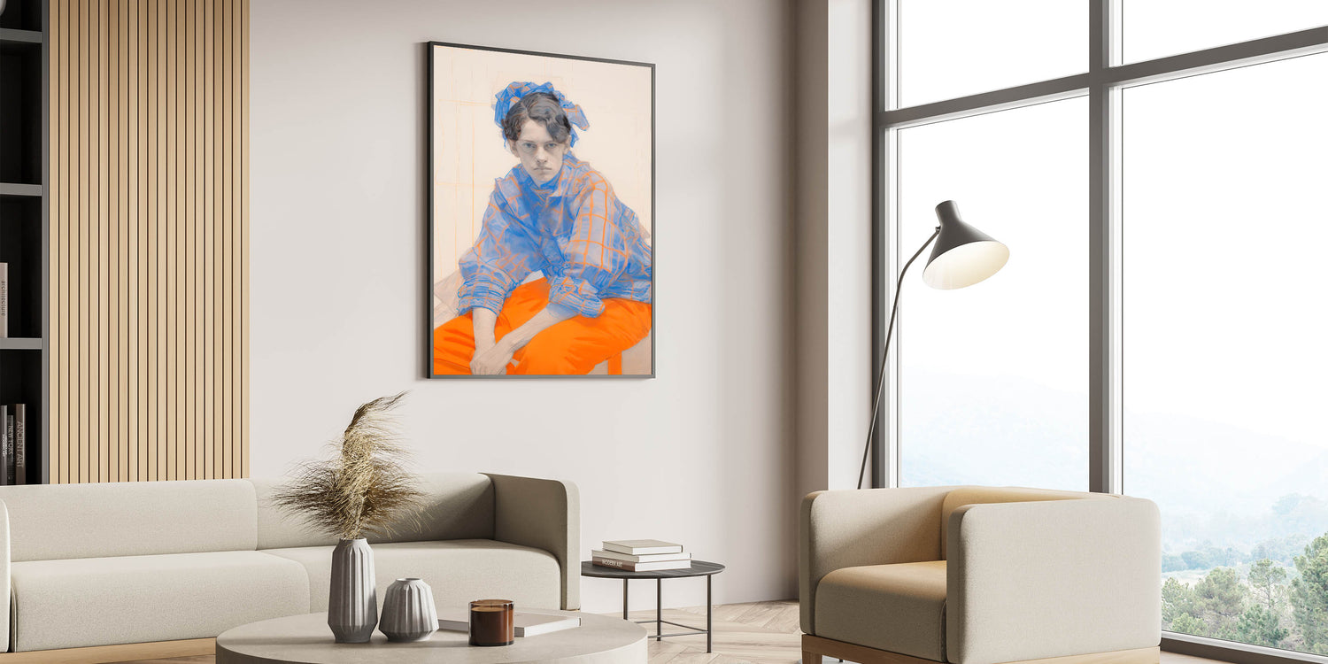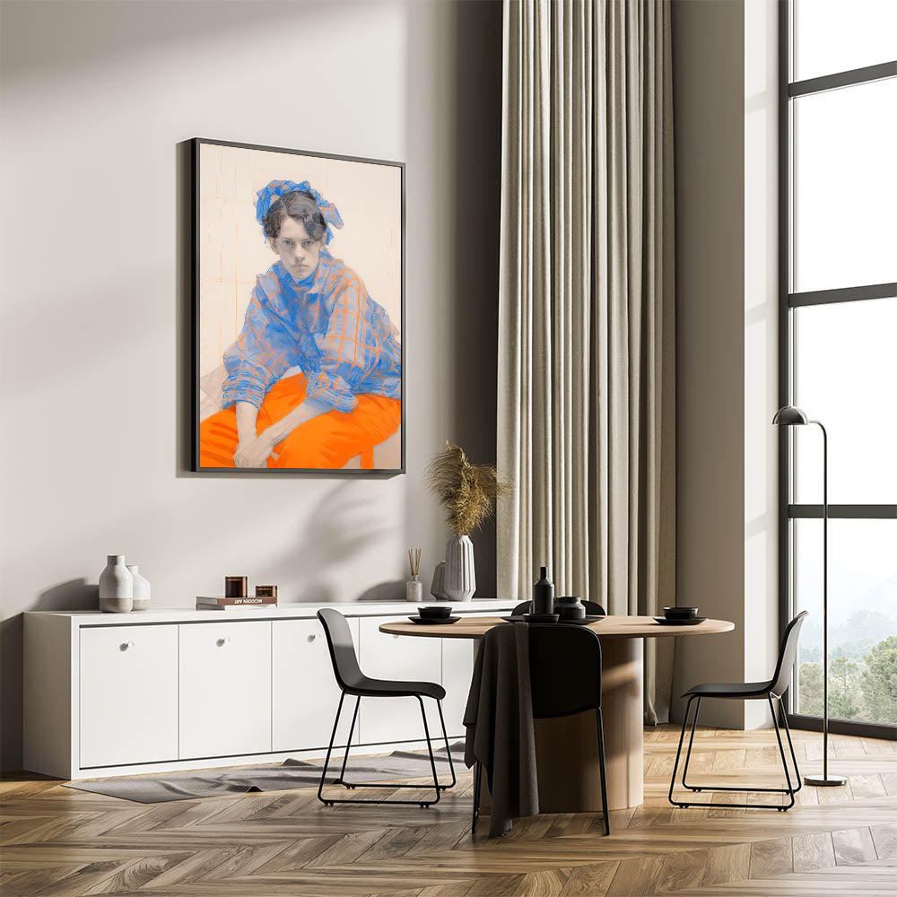 Maximalist Wall Art: Bold Blue and Orange Portrait for Eclectic Spaces