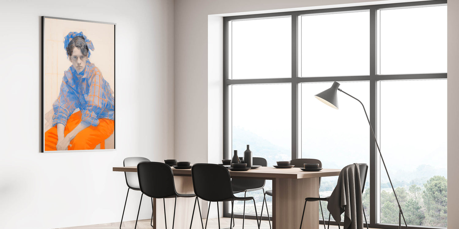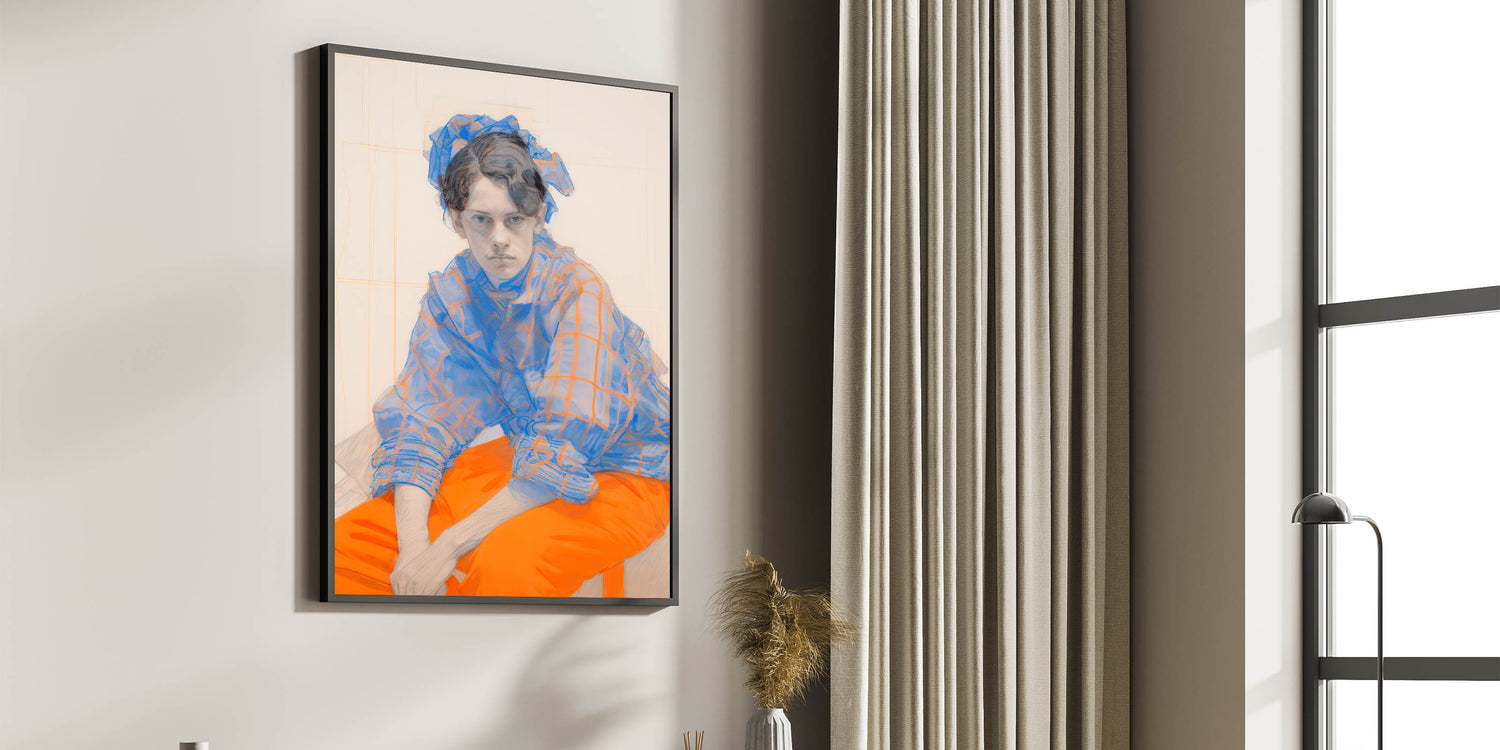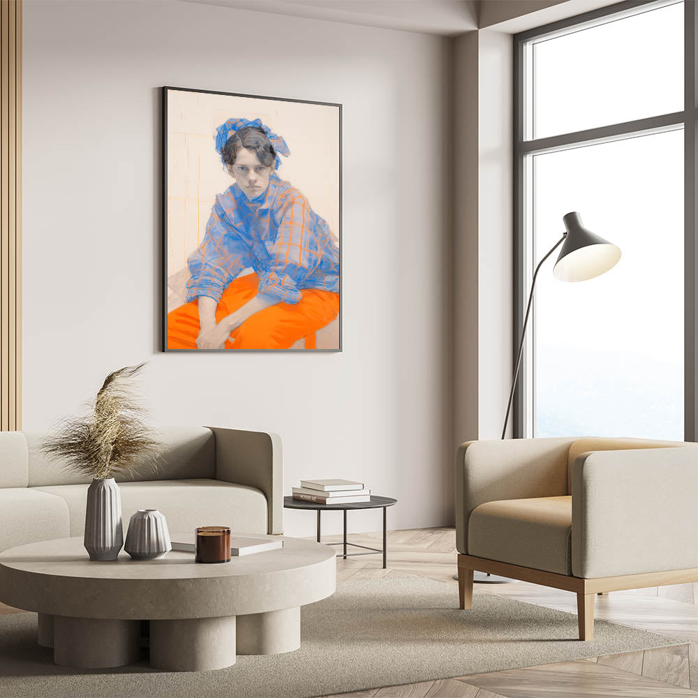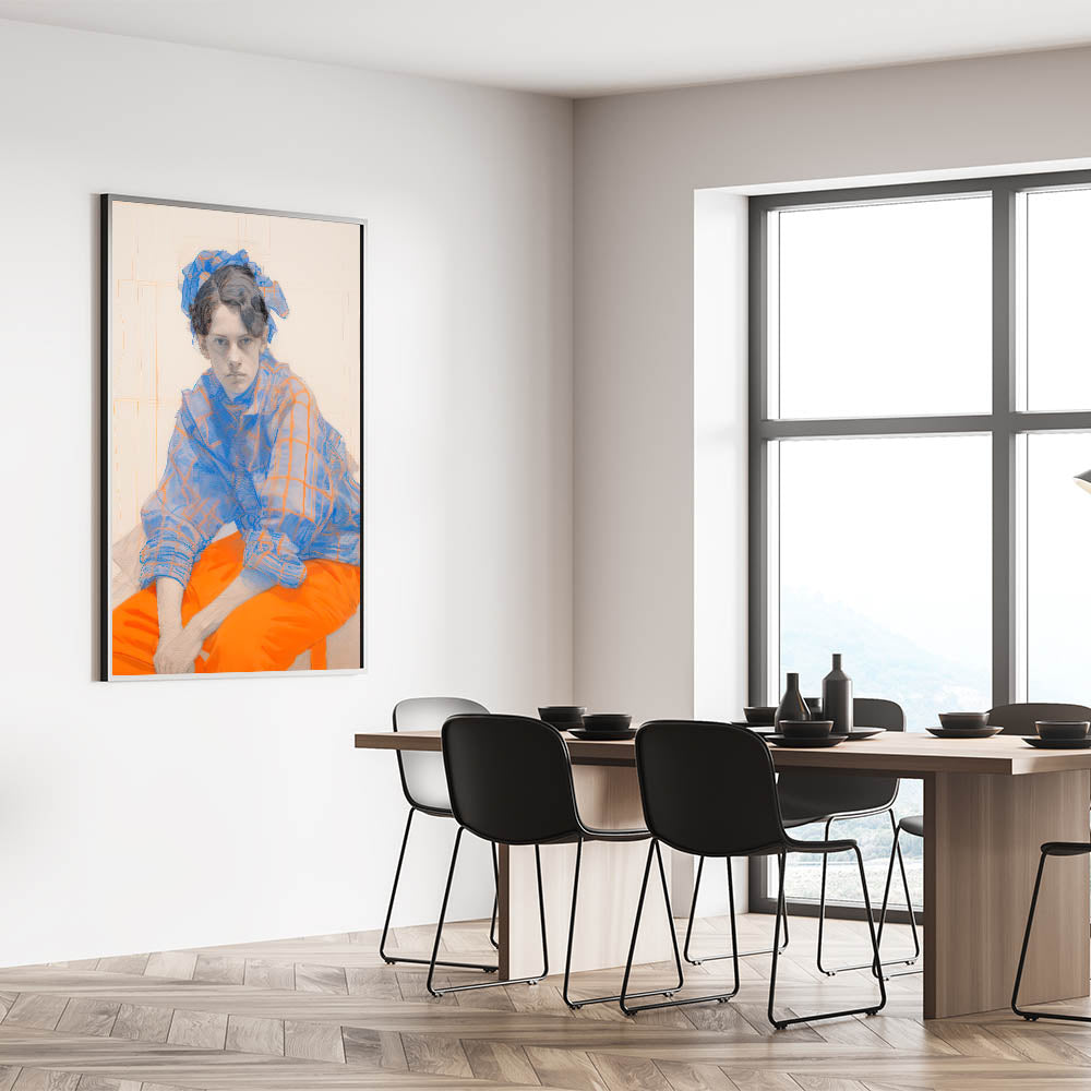 Make a bold statement in your home with this striking Maximalist wall art featuring a captivating portrait that blends vibrant blue and orange tones. The intricate detailing in the subject’s clothing, combined with the expressive gaze, creates a powerful and dynamic visual. The soft sketch-like lines against the energetic colors add a unique artistic contrast, making this piece perfect for eclectic and modern spaces. Whether displayed in a living room, office, or creative studio, this artwork will instantly transform your decor with its bold color palette and expressive style.