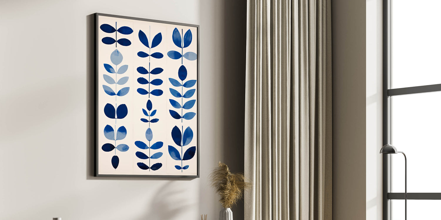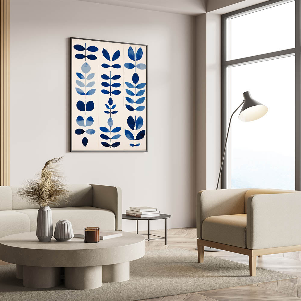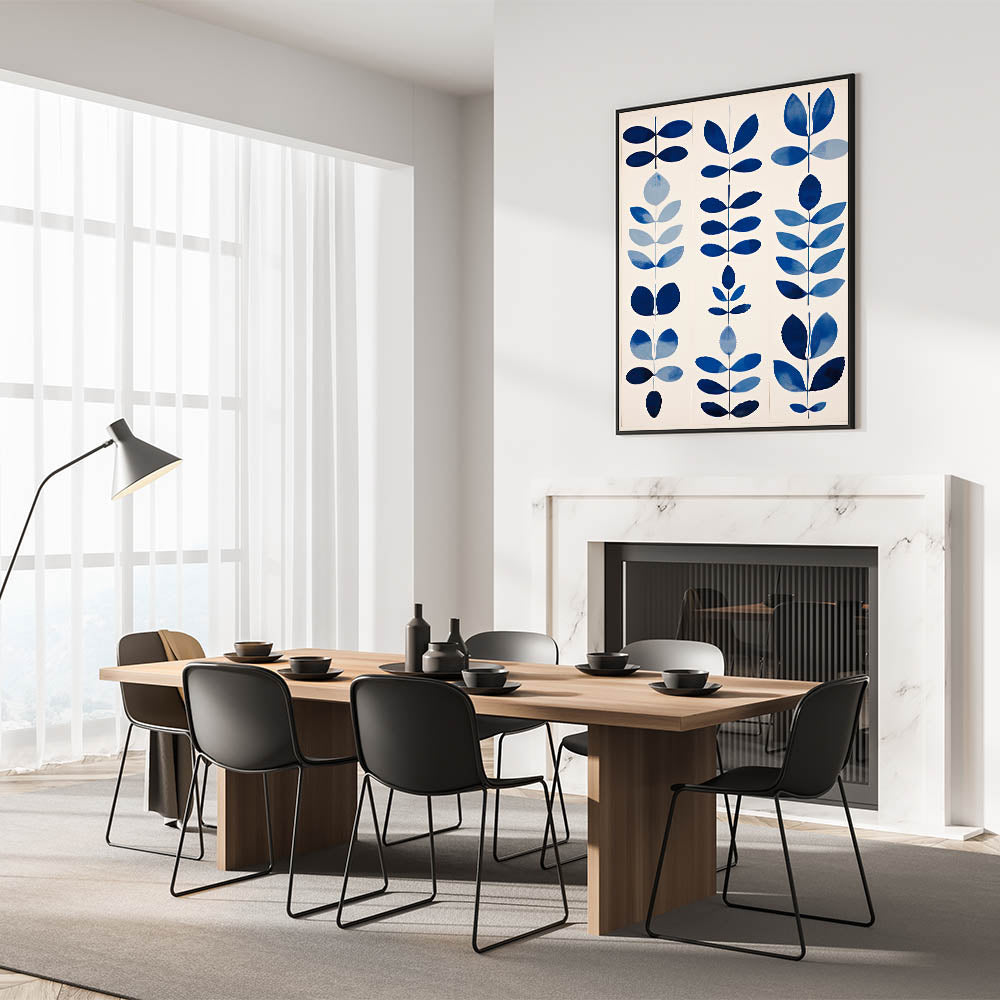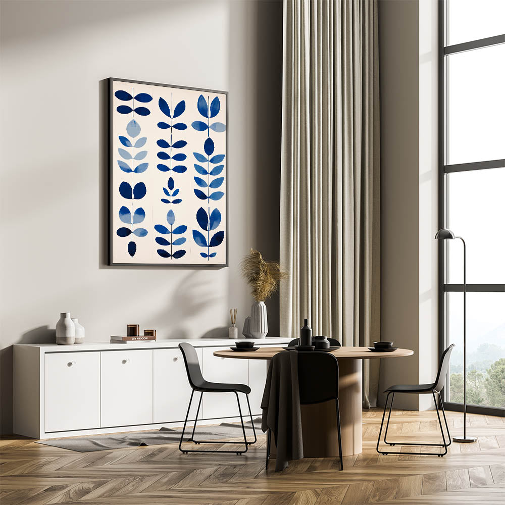 Add a touch of nature-inspired elegance to your space with this Maximalist Wall Art, featuring a bold arrangement of blue leaf patterns. The artwork showcases various shades of blue, including navy and sky blue, creating a visually striking composition that brings depth and contrast to any room. Ideal for those who appreciate unique and vibrant styles, this piece adds a refreshing touch of maximalism to living rooms, bedrooms, or creative workspaces.
