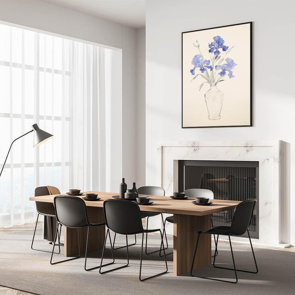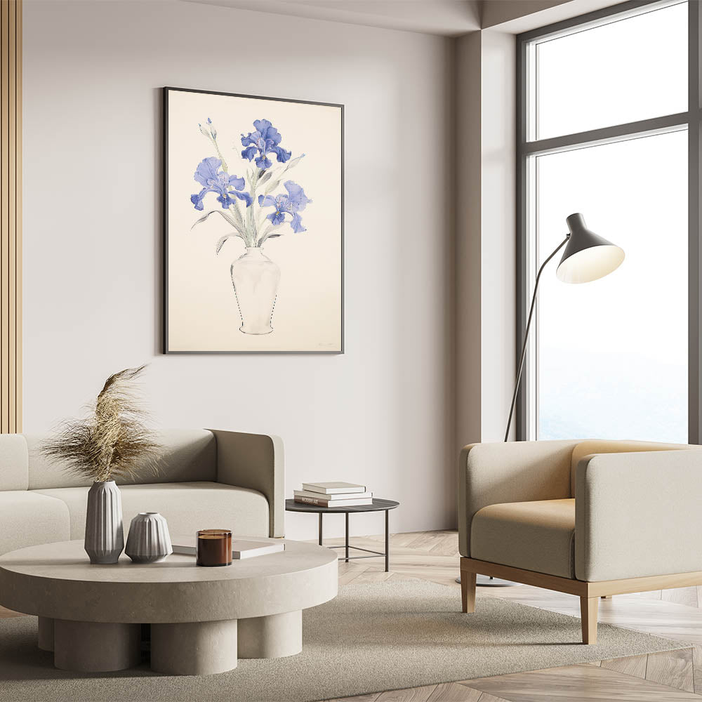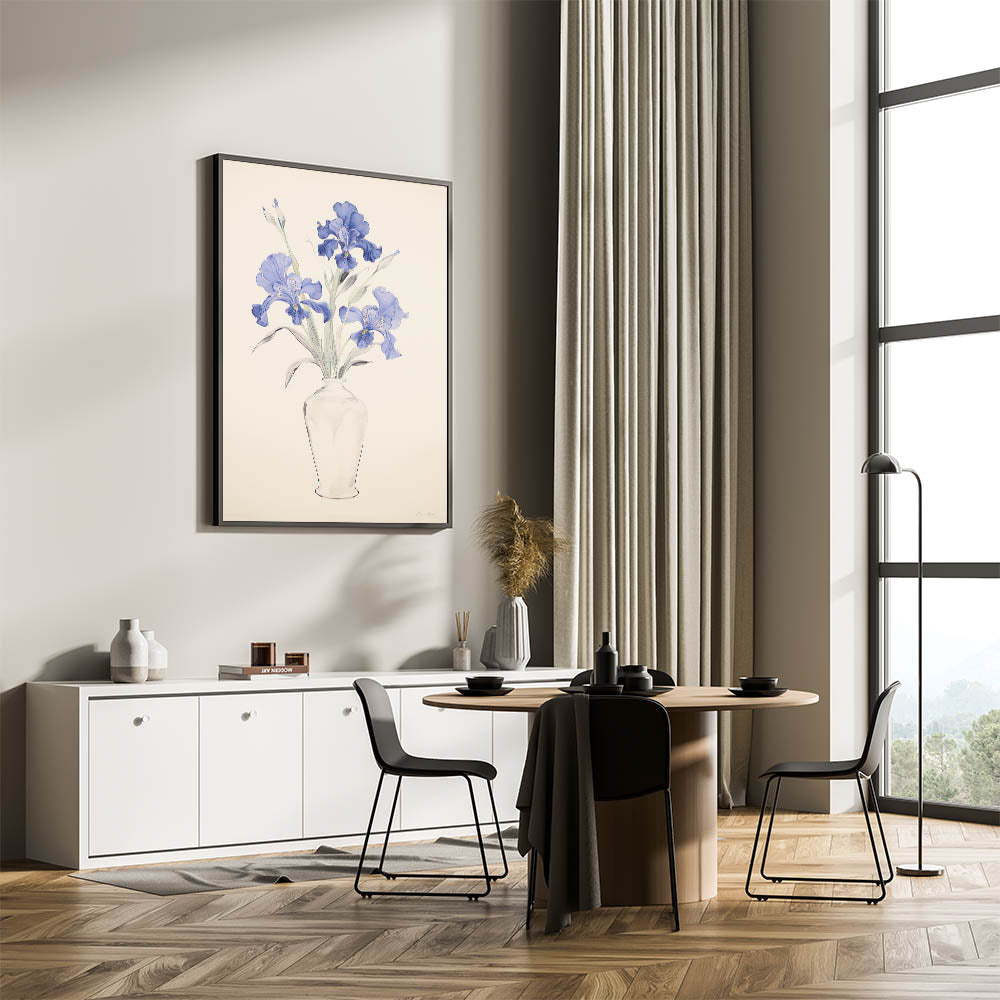 Add an elegant touch of Maximalist Wall Art to your home with this beautiful floral artwork featuring delicate blue irises in a minimalist white vase. This piece stands out with its bold and vibrant colors, making it a perfect choice for those looking to bring vibrant maximalism into their space. The soft yet expressive design creates a unique, eclectic atmosphere that brightens any room, from the living room to the bedroom.