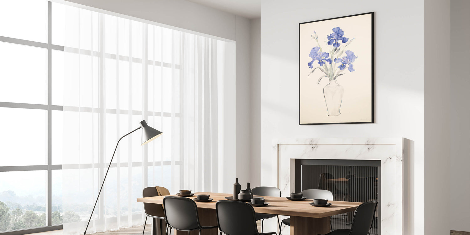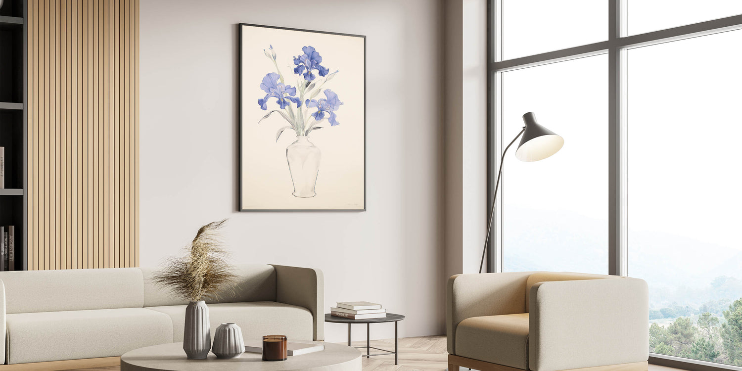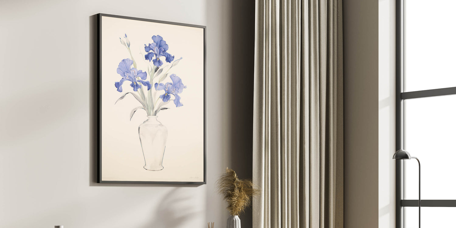 Add an elegant touch of Maximalist Wall Art to your home with this beautiful floral artwork featuring delicate blue irises in a minimalist white vase. This piece stands out with its bold and vibrant colors, making it a perfect choice for those looking to bring vibrant maximalism into their space. The soft yet expressive design creates a unique, eclectic atmosphere that brightens any room, from the living room to the bedroom.