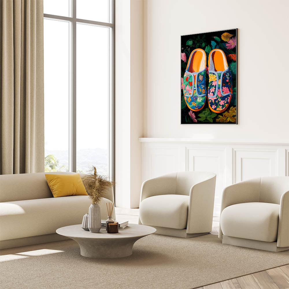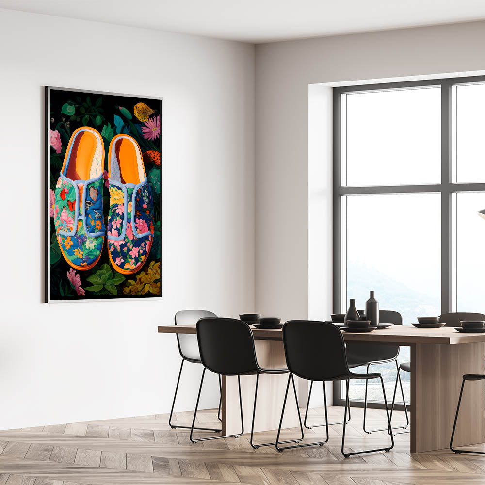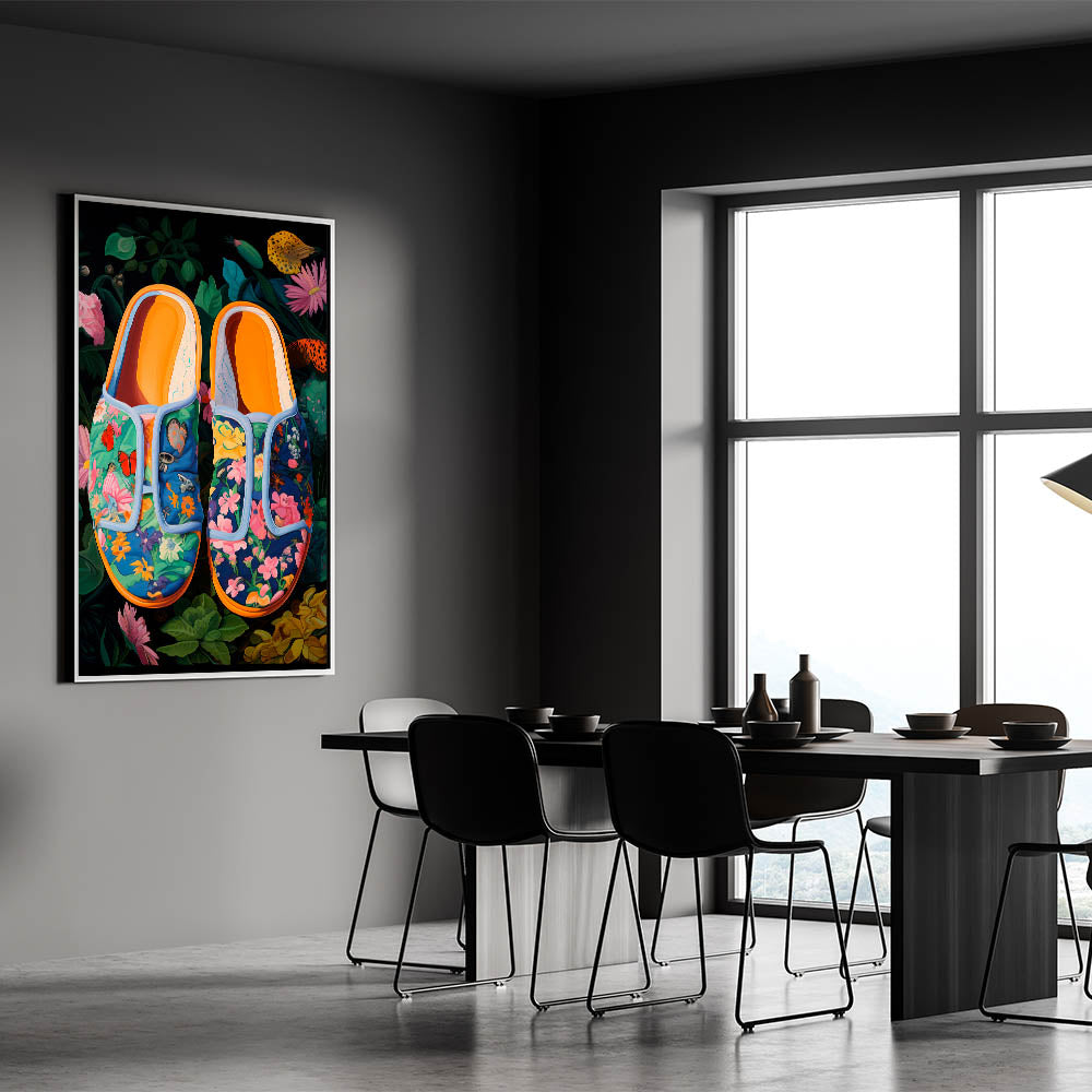 Add a playful and eclectic touch to your decor with this bold maximalist wall art, showcasing a pair of colorful floral shoes against a lush botanical background. The artwork blends vibrant colors and intricate floral patterns, creating a dynamic and lively composition. With bright blues, pinks, oranges, and greens, this piece captures the essence of vibrant maximalism and makes an ideal statement art piece for eclectic living rooms, bedrooms, or creative workspaces. The design exudes personality and adds a touch of whimsy to any space.