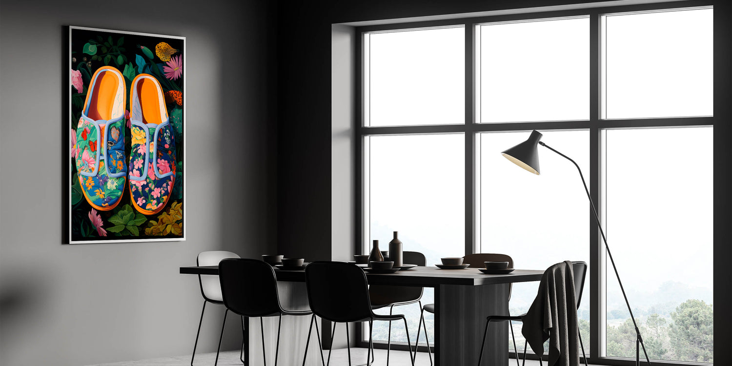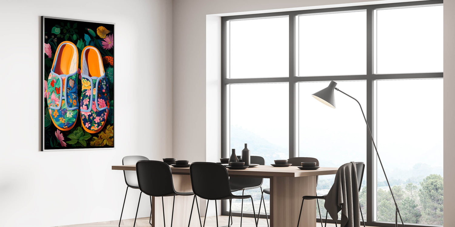 Maximalist Wall Art – Bold Floral Shoes with Vibrant Botanical Background